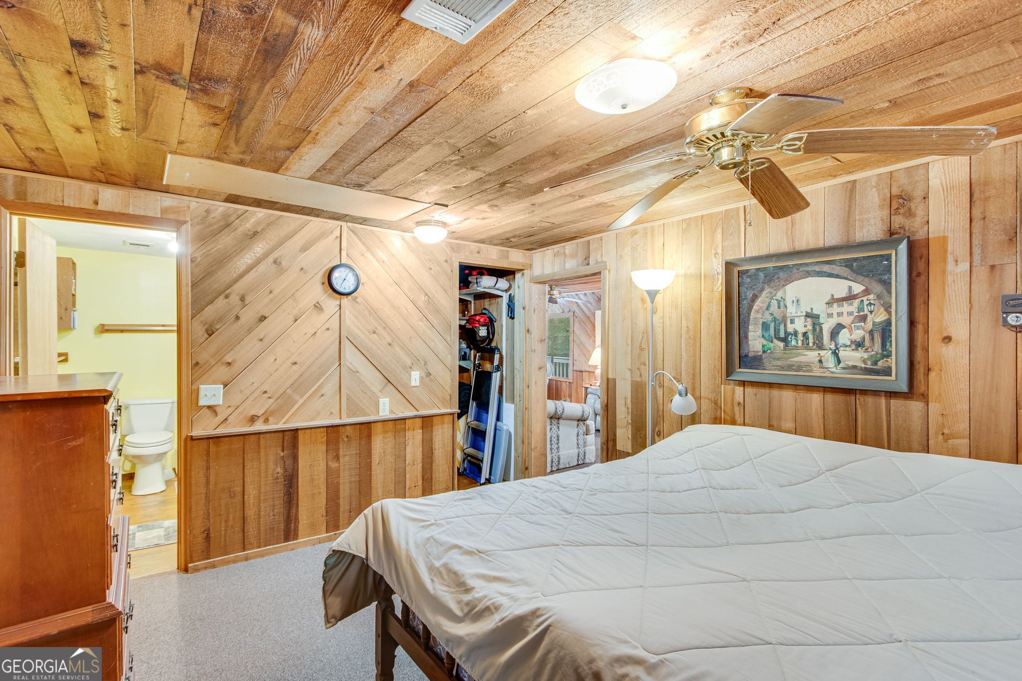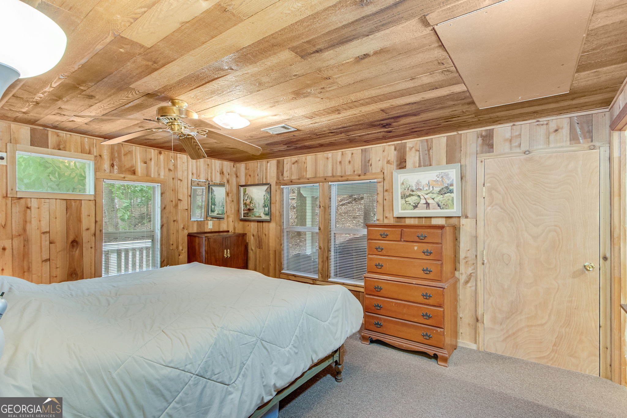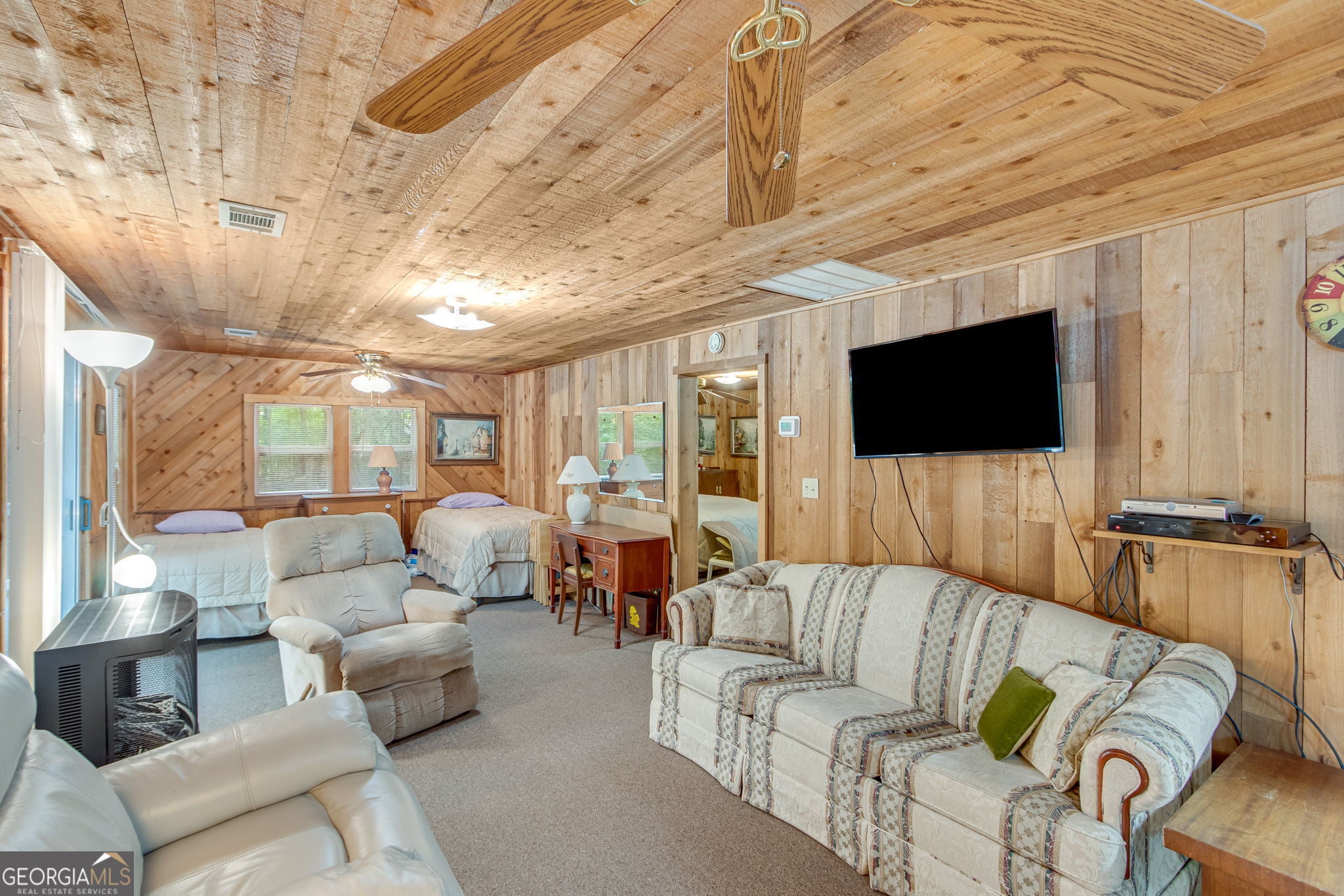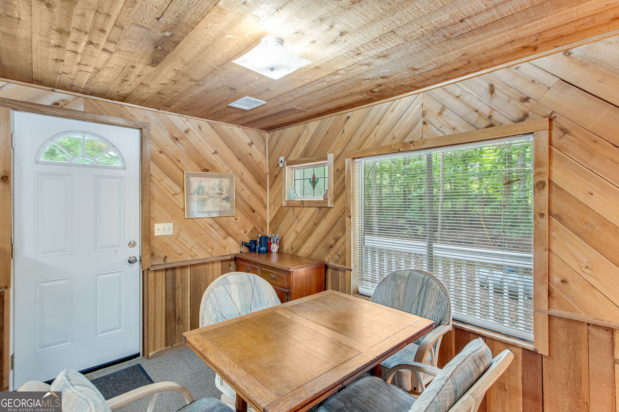 This charming 1 bedroom, 1 bath lakefront cottage offers the perfect amount of peaceful privacy for a weekend escape. Tucked away on a wooded .70-acre lot with seasonal lake views, this home includes a 16' x 24' platform dock with deep water access and a very gentle walk to the shoreline. The open-concept layout features warm wood-planked walls and ceilings throughout. Enjoy outdoor living on the expansive deck, perfect for entertaining or relaxing in the natural surroundings. The unfinished basement offers ample storage or potential for additional living space, and the home is permitted for 2 bedrooms, offering room to expand. This property offers incredible potential in a tranquil lakefront setting! Conveniently located to I-985, GA 400, Gainesville, and Dawsonville.