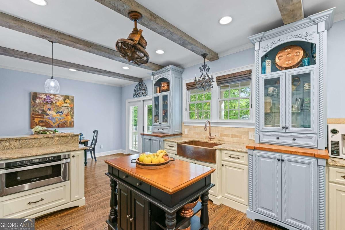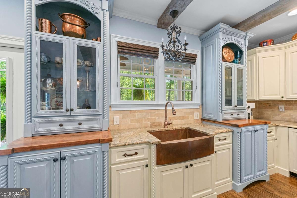 - Interior FeaturesBeamed Ceilings, Bookcases, Double Vanity, Master On Main Level, Other, Walk-In Closet(s)