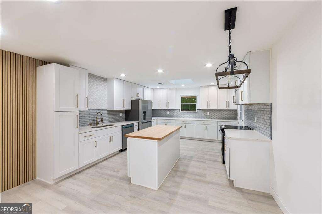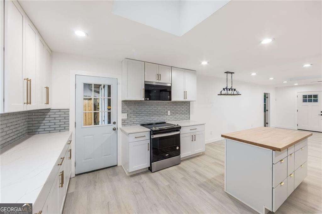 Welcome to this stunning, renovated residence located in a quiet neighborhood in Decatur. This home merges modern design and the inviting charm of a spacious ranch-style layout, with a perfect balance between contemporary trends and timeless comfort. The open floor plan in the living area provides natural light, enhanced by skylights. The kitchen is featuring white cabinetry, an elegant backsplash, quartz countertops, and brand-new stainless steel appliances, complete with an island showcasing a beautiful butcher block countertop. The master bedroom features a private bathroom and direct access to your outdoor patio. The open-concept design continues to a generous, spacious patio and fenced backyard, ideal for hosting gatherings or quiet moments in your outdoor sanctuary. The additional storage area is on the back of the house. With its convenient access to major highways, East Atlanta Village, the airport, and charming downtown Decatur, this home offers an appealing blend of affordability and accessibility, making it an excellent choice for your lifestyle.