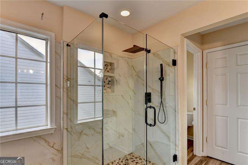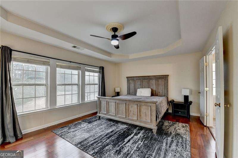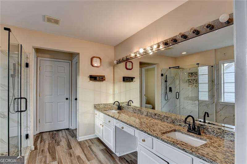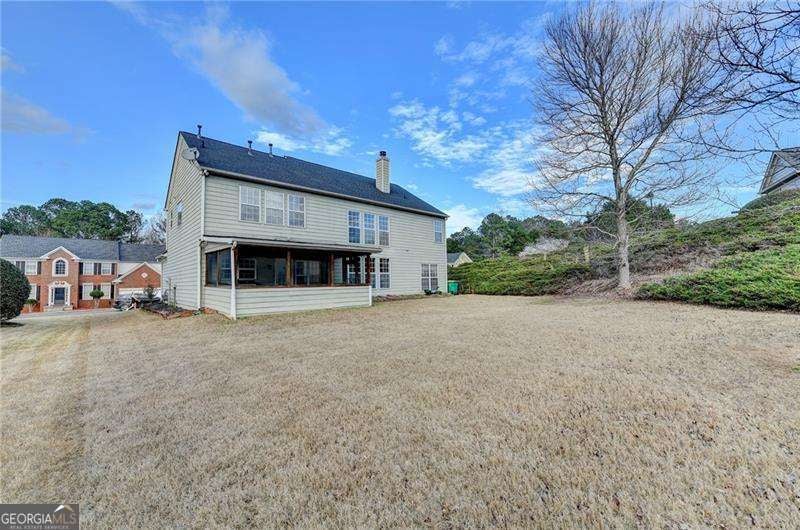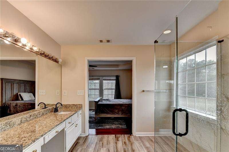 Beautifully maintained 5-bedroom, 3-bath home in the highly sought-after Woodstock School district! This spacious home offers a bright, functional layout perfect for both everyday living and entertaining. Hardwood floors throughout and tile. Two Story Family room with floor to ceiling windows and lots of natural light. Kitchen has Stainless appliances and granite counters overlooking the family room. Main-level bedroom and full bath provide a space for guests or in-law suite. Upstairs, the primary suite is oversized and features a recently remodeled spa-like bathroom with a modern frameless glass shower. 3 additional bedrooms and full bath on upper level. Laundry room is on upper level. Screened in back patio. Enjoy a private backyard ideal for relaxing or hosting gatherings. Swim and Tennis Community. Located just minutes from The Outlet Shoppes at Atlanta, dining, parks, and Downtown Woodstock. A new Fire station just outside the neighborhood adds extra convenience and peace of mind. Don't miss this opportunity to own a move-in-ready home in a prime Woodstock location!