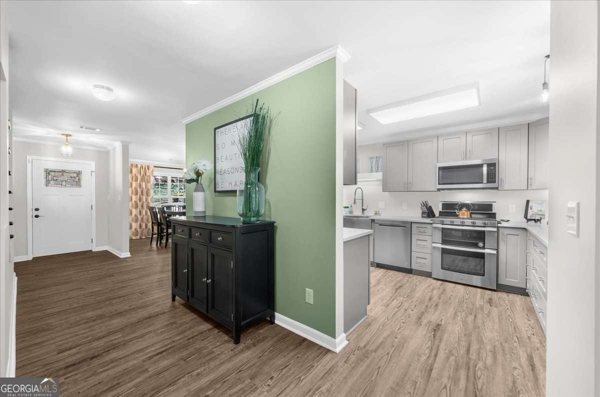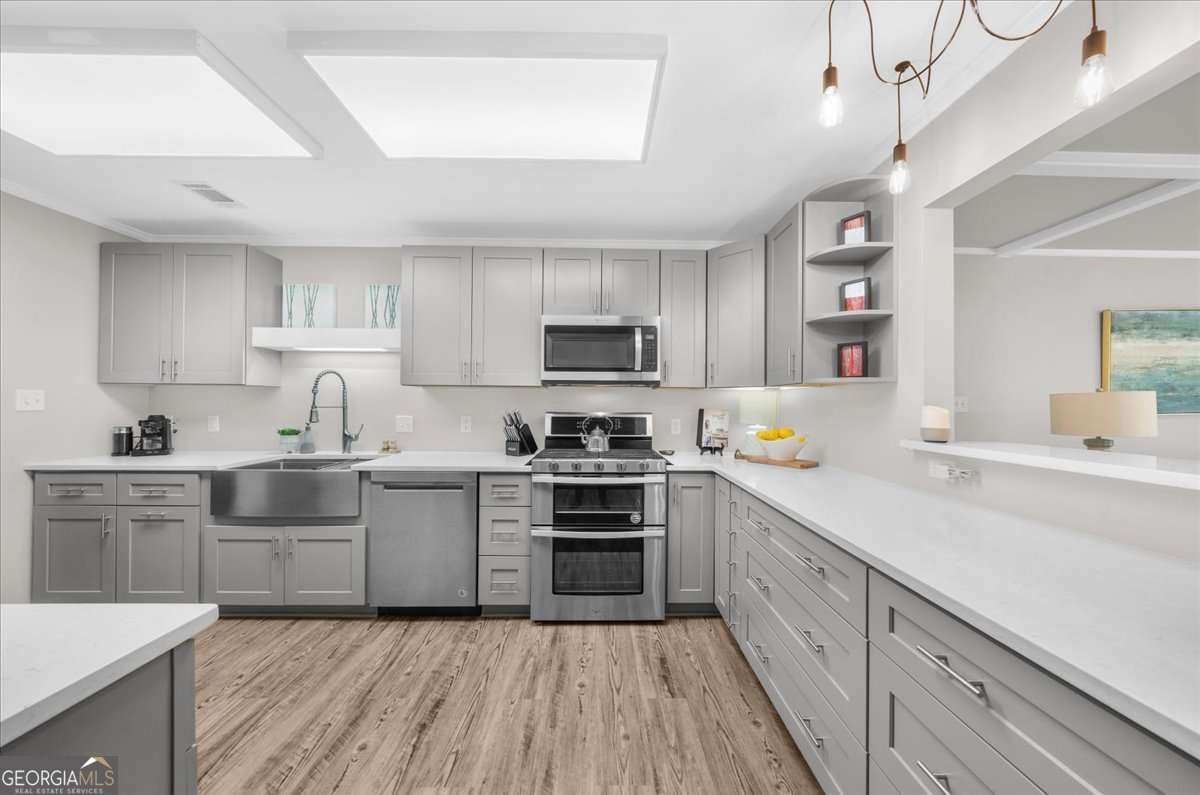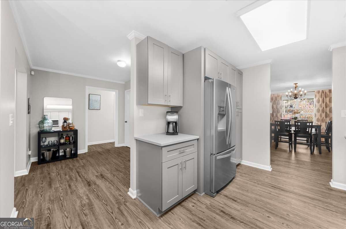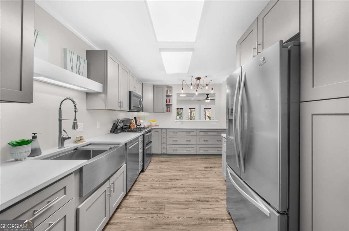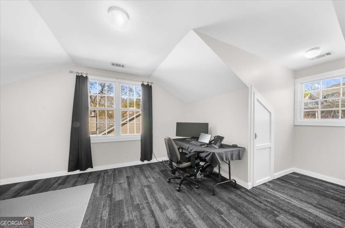 Welcome to arguably the most unique house in the highly sought after downtown Norcross area! The sidewalk is steps from your Lemonade sippin', people watchin' covered porch that will take you to all the restaurants, shops and the "small town feelin farmers markets" in less than a 5 minute walk. This house has been through a lot in the last few years, she's been stripped of her original materials, taken to the studs and has been given a second chance at greatness! What does that mean you're wondering?? It means NEW EVERYTHING: siding, windows, doors, electrical, plumbing, HVAc's, tankless water heater, flooring, carpet, she even got a little taller when the roof was removed and a second story was added! Inside, you'll find the completely stepless main level has a flow that begs to entertain, she is proud of the openness while still having designated space for each area (she boasts of this because she knows if its TOO open, furniture placement can be a real struggle) The kitchen is her favorite place in the house, the original didn't live up to her standards so walls came down and space was created to make something that a chef would want for themselves. New appliances, expansive counter space and LOTS of cabinets were a must and boy did she deliver, creativity kicked in and she has two custom closets for storing all the kitchen overflow. The breakfast bar from the kitchen to the coffered ceiling family room flows so elegantly, you'll have to decide if you're the formal dining room type or if you want to have dinner gazing out at your enormous private backyard on a daily basis...Options just keep coming as she also has a sweet covered porch for those perfect temp days. The primary suite is steps away, it's oversized and has more closet space than one should need, technically three separate closets to accommodate even the greatest of shopaholics. You're probably wondering about the Primary bath, this was next on her list but she ran out of time. The space is fantastic and has many options, plans were made and we have a rendering waiting for you to see there along with an estimate from our trusted contractor, you may love our ideas or you may choose a different direction, you can make this perfection for your own needs :) You'll love that the laundry room is also off the primary, so close, you'll probably want to take dirties straight to the washer and bypass a hamper. On the opposite side of this beauty is two secondary bedrooms, both nice sized with great closets, they share a full bath and have just enough separation weather its for children or the many guests that you'll entertain. She also has what we'd call a mud room, this area is PURE flex space, it can be a second kitchen, an office, a dumping ground for things you'll get to later or even a craft room fit for a queen! Upstairs you'll LOVE the additional bedroom but you'll be blown away with the huge flex room, this can be anything that fits your needs, currently it's an office with custom desks (that are staying with the house!) but it can be anything you want, it could be a game room that kids and adults would envy, ( it could hold both a pool table AND a ping pong table,) or even a theatre! The bonus feature that makes this girl shine is the single detached garage, this thing is pure gold, talk about options... a workshop, a place to park a golf cart, or the worlds best "she shed"! Did we mention TWO driveways? You'll need it when all your friends realize how close you are to downtown for the fantastic concerts and events, they'll be begging you to let them park at your house. All of this is situated on, in our opinion, one of the best lots in the walkable area, she has more than ample room for a pool if you desire or a garden big enough to feed a small army. Homes like this don't come along often, Clearly her uniqueness makes her shine like a rare gem, don't let her be the one that got way!