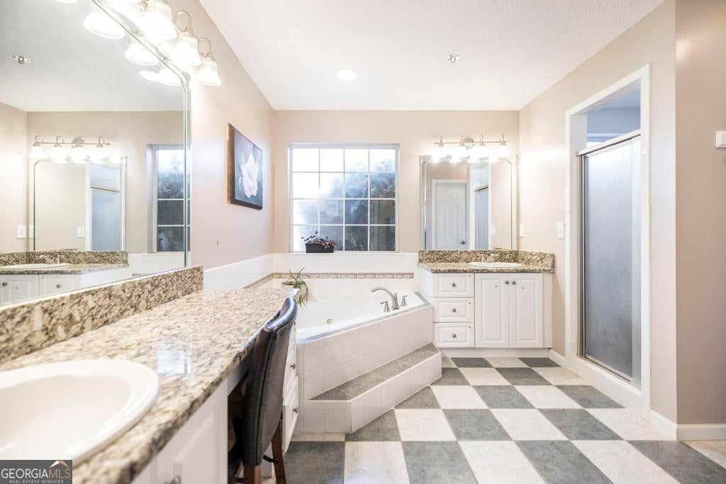 - Interior FeaturesDouble Vanity, High Ceilings, Master On Main Level, Pulldown Attic Stairs, Separate Shower, Soaking Tub, Split Bedroom Plan