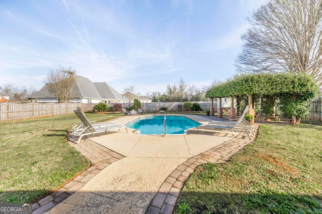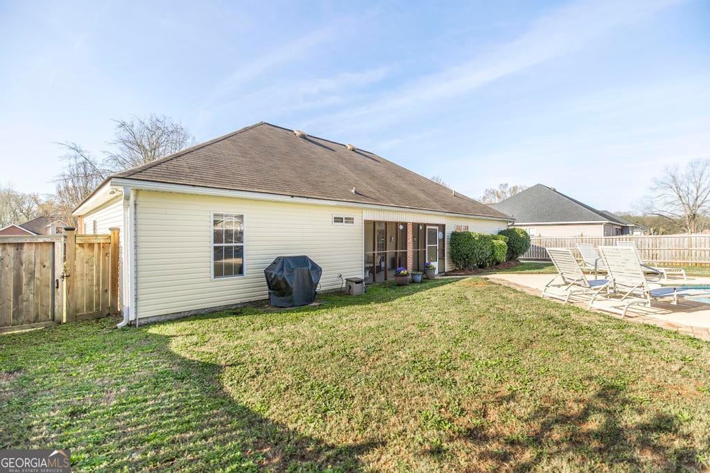 Beautiful 4 bedroom, 3 bath home with an office and a backyard oasis featuring a pool! An impressive front walkway leads into a warm and inviting interior with rich dark cherry hardwood floors. The home offers a dining area, spacious living room with fireplace, and an open kitchen with granite countertops, pantry, and eat-in area. The laundry room is conveniently located just off the kitchen near the garage entry. The large primary suite features a double vanity, oversized tiled shower, and relaxing soaking tub. On the opposite side of the home you'll find a private office along with three additional bedrooms and two bathrooms, including one with an attached bath. Step outside to enjoy the screened-in porch overlooking the beautiful pool and a charming pagoda with swing surrounded by jasmine, perfect for relaxing or entertaining. Additional features include a two-car garage, gutters, and all appliances remain including the washer and dryer. Homes with this much space, a pool, and a backyard retreat like this are hard to find at this value. Don't miss the opportunity to make this incredible property yours!