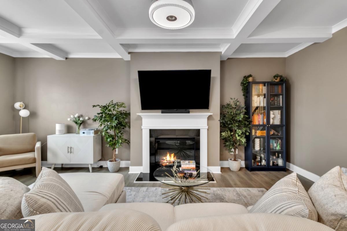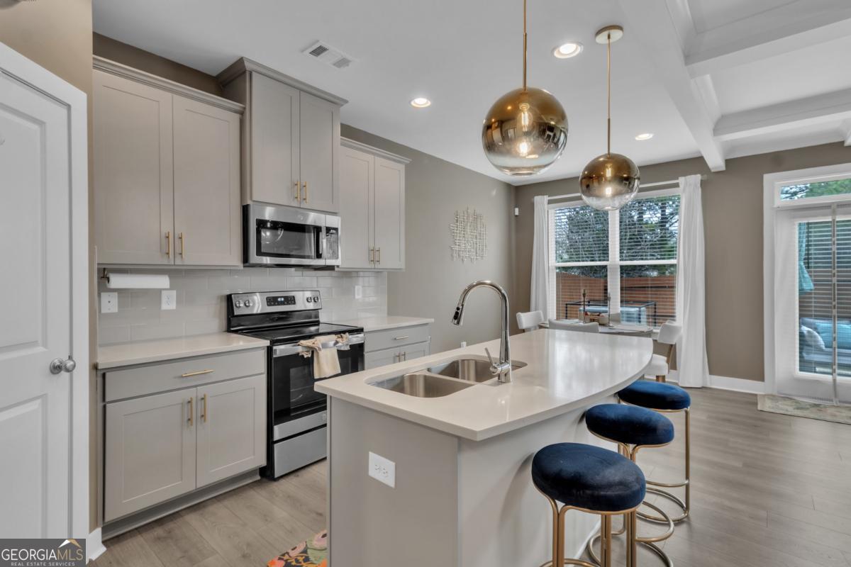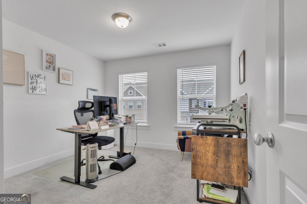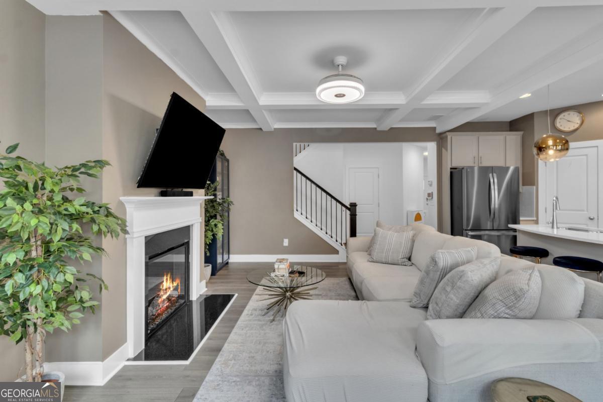 Welcome to this beautiful like-new 3-bedroom, 2.5-bath townhome with a 2-car garage located in the highly desirable Renaissance at South Park community. Conveniently situated near shopping, dining, entertainment, major interstates, and just minutes from Hartsfield-Jackson Atlanta International Airport. The main level features an open-concept design with coffered ceilings, hardwood floors, and a cozy fireplace, creating the perfect space for both everyday living and entertaining. The kitchen is equipped with granite countertops, 42" cabinetry, stainless steel appliances, and a large island ideal for gathering and meal preparation. Upstairs, the spacious primary suite offers French doors, double vanities, a soaking tub, walk-in shower, and a large walk-in closet. Two additional bedrooms provide flexibility for guests, family, or a home office. The home has also been enhanced with updated fixtures and a whole-home water filtration system. Enjoy your private outdoor space and take advantage of the community's resort-style amenities, including a pool, tennis courts, playground, clubhouse, and scenic walking trails.