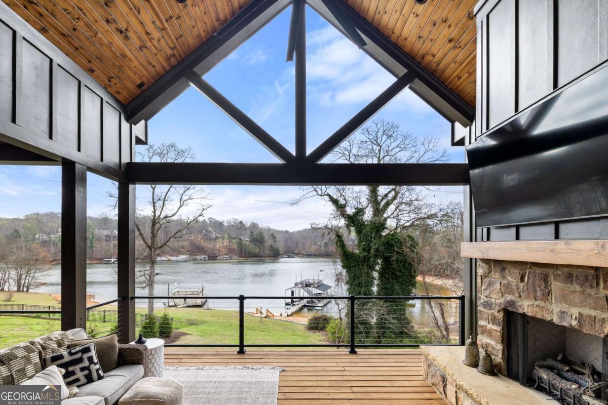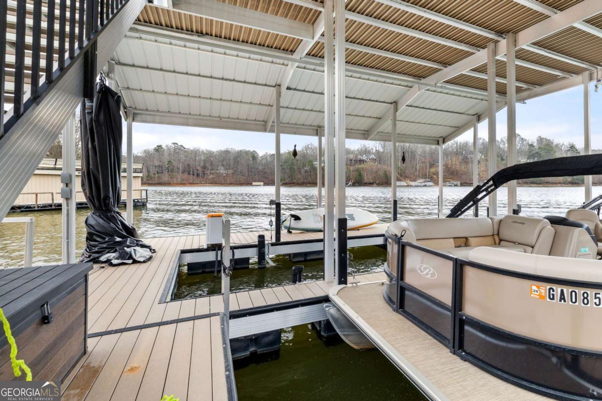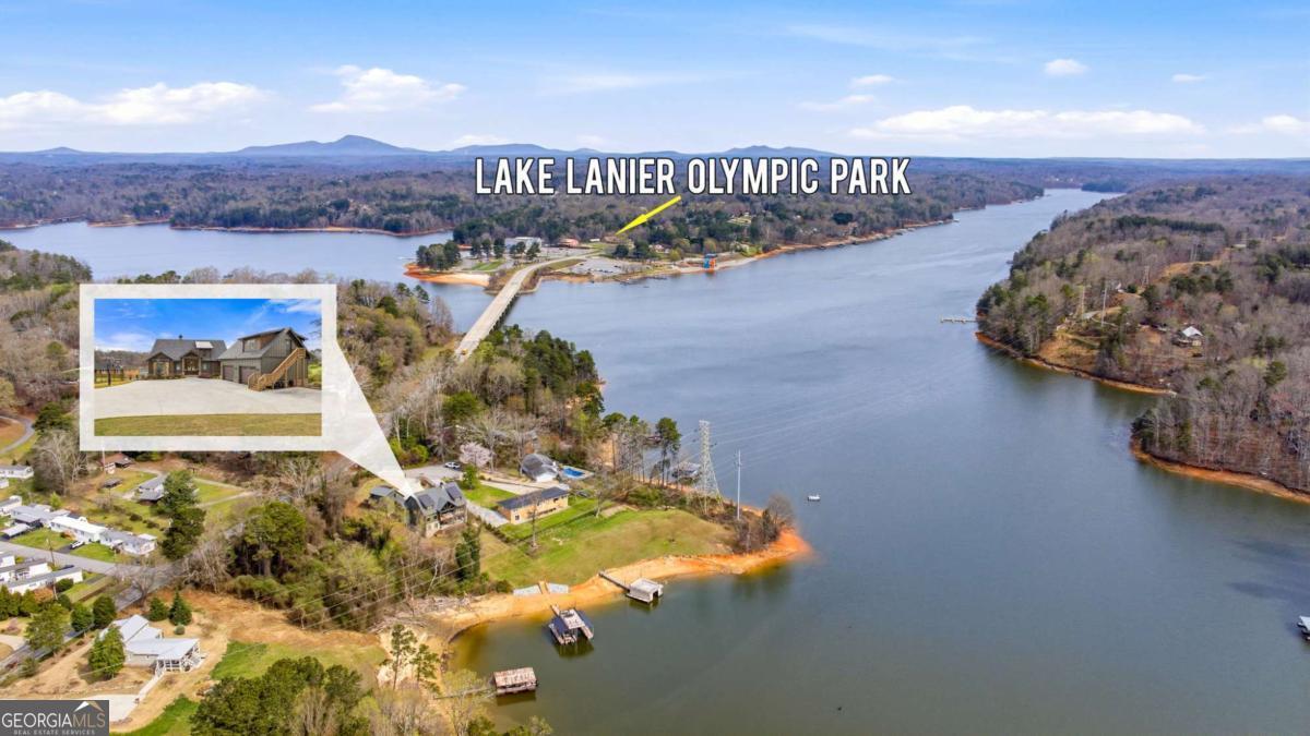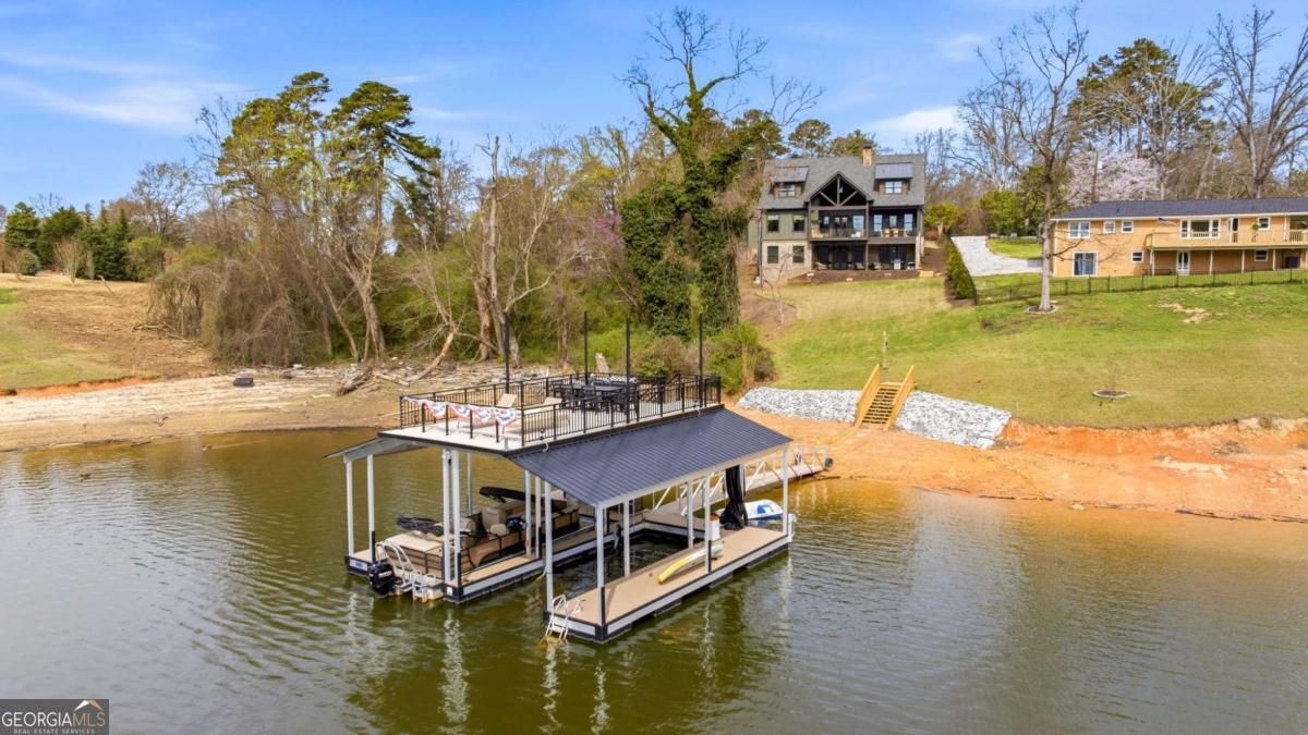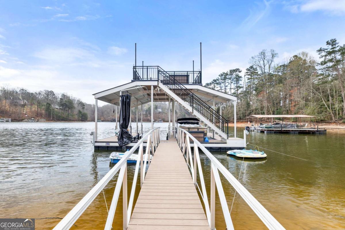 Better than new Lake Lanier waterfront home in Gainesville located on a quiet cul-de-sac with beautiful lake views, a gentle walk to the water, and a private fenced and gated front entrance. Rare opportunity to own a move in ready lake home with double slip dock, guest apartment, and space for entertaining, located minutes from Downtown Gainesville Square and less than one hour from Atlanta. The exterior features natural stone, board and batten siding, and a covered stone front porch with wood ceiling. Inside, the open floor plan is designed to capture lake views from the main living areas. The great room with stone fireplace flows into the gourmet kitchen with custom cabinetry, quartz countertops, large island, stainless steel appliances, beverage center, ice maker, custom pantry, and built in hutch. The breakfast room overlooks the lake, and the covered fireside deck is perfect for outdoor dining and relaxing. Custom blinds have been installed throughout the home. The main level primary suite overlooks the lake and includes a spa style bath and walk in closet. Upstairs you will find a large flex room and guest bedrooms, each with a private en suite bath. The finished terrace level is ideal for entertaining or multi generational living and includes a second kitchen with double refrigerators, dishwasher, and sink, large living area, billiards space, flex room for media room or gym, guest bedroom, and two full baths. Additional features include mudroom, laundry room, epoxy flooring in the two car garage, and a covered breezeway leading to a cottage apartment above the garage with private entry, bedroom, bath, kitchen, laundry, and living space ready for finishing. The home also includes a Generac whole house generator. A gentle walk leads to the new Martin 32x32 double slip dock with party deck, featuring a Duratek shallow water 7,500 lb boat lift, electricity, and freshwater line. Shoreline riprap and new stairs provide easy access to the dock. After a day on the lake, rinse off in the outdoor shower and relax on the covered veranda. Located within walking distance to Lake Lanier Olympic Park and the renovated Boathouse, this home offers one of the most desirable locations on Lake Lanier. Rare Lake Lanier waterfront home with double slip dock, guest apartment, gated entrance, and gentle walk to the water in Gainesville.