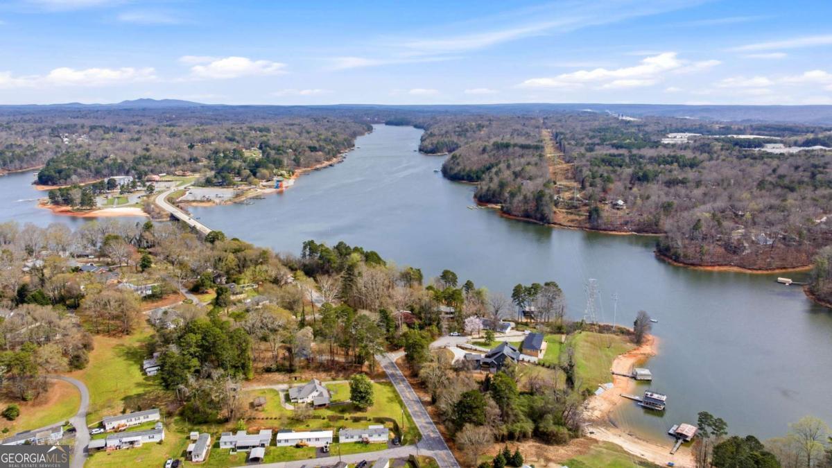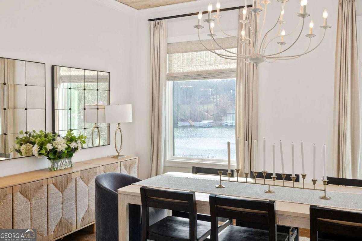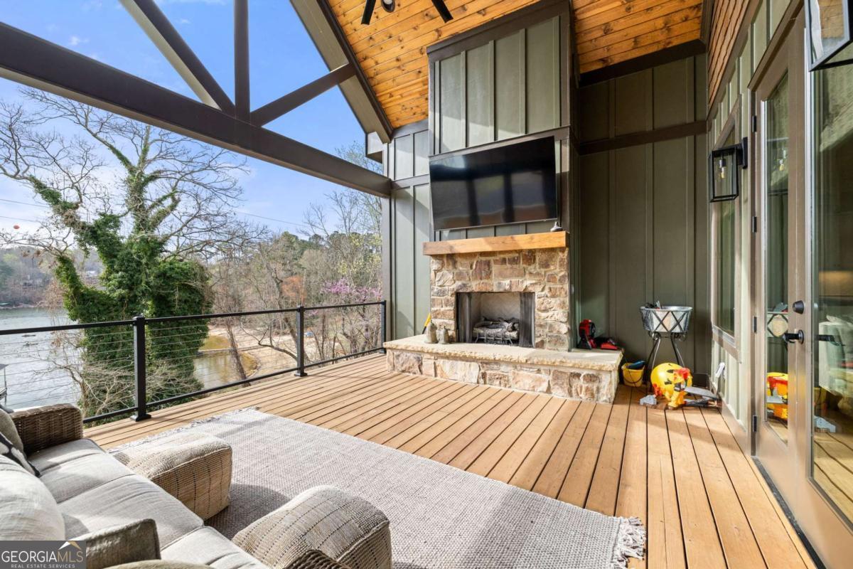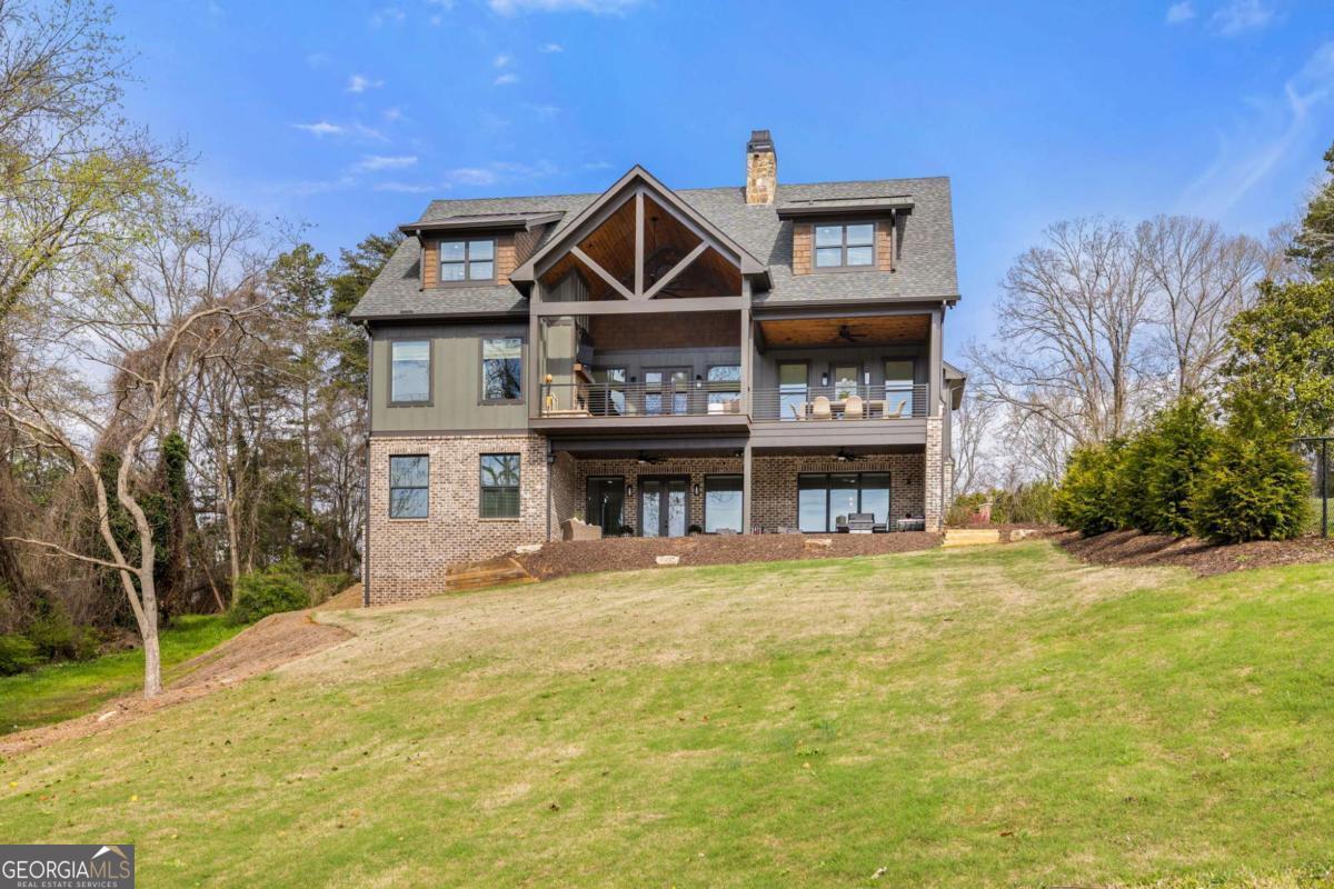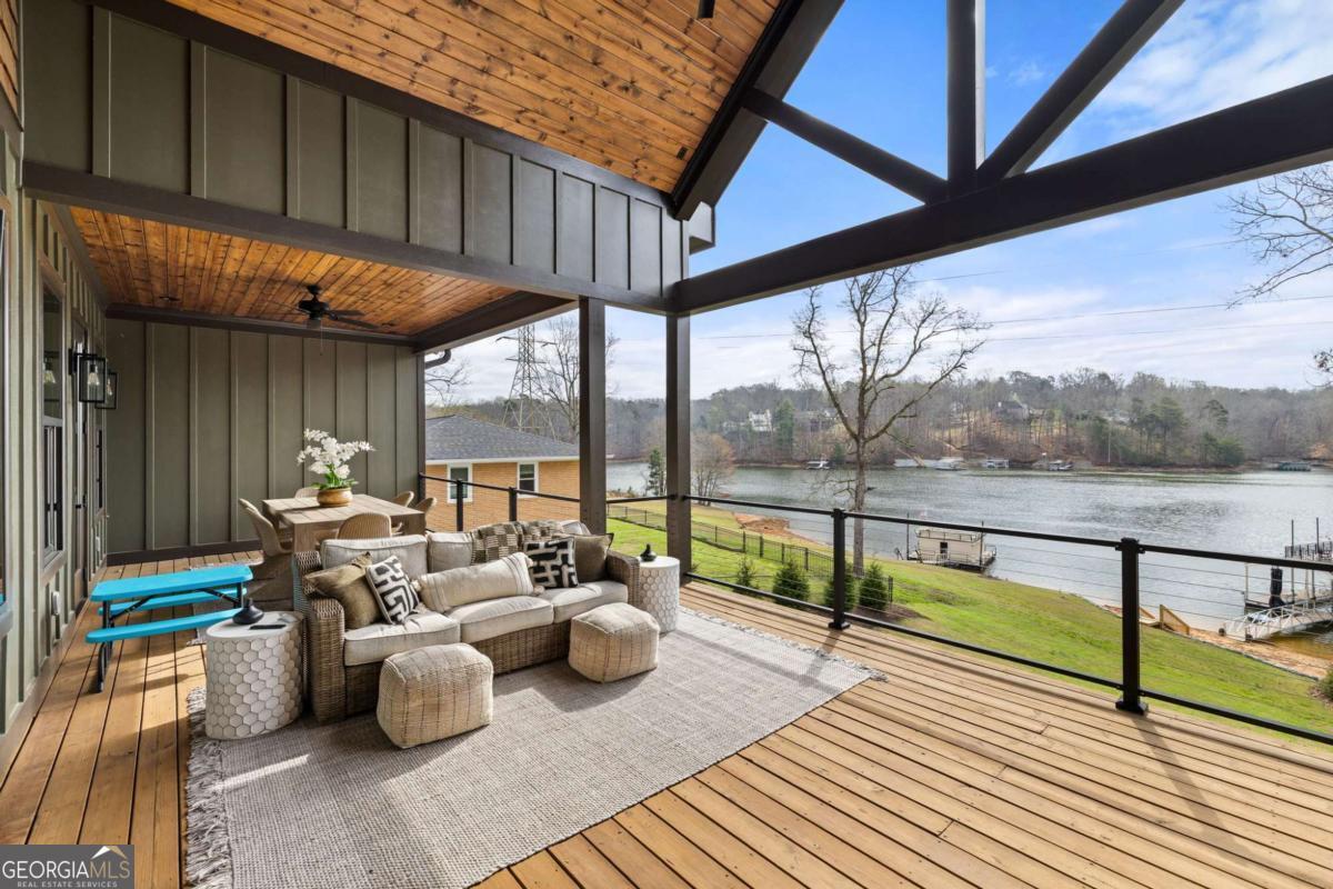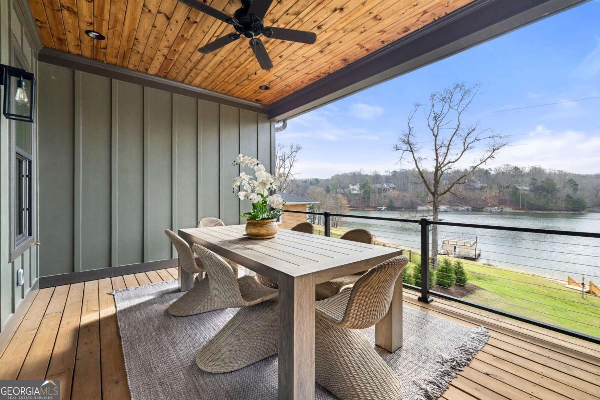 Better than new Lake Lanier waterfront home in Gainesville located on a quiet cul-de-sac with beautiful lake views, a gentle walk to the water, and a private fenced and gated front entrance. Rare opportunity to own a move in ready lake home with double slip dock, guest apartment, and space for entertaining, located minutes from Downtown Gainesville Square and less than one hour from Atlanta. The exterior features natural stone, board and batten siding, and a covered stone front porch with wood ceiling. Inside, the open floor plan is designed to capture lake views from the main living areas. The great room with stone fireplace flows into the gourmet kitchen with custom cabinetry, quartz countertops, large island, stainless steel appliances, beverage center, ice maker, custom pantry, and built in hutch. The breakfast room overlooks the lake, and the covered fireside deck is perfect for outdoor dining and relaxing. Custom blinds have been installed throughout the home. The main level primary suite overlooks the lake and includes a spa style bath and walk in closet. Upstairs you will find a large flex room and guest bedrooms, each with a private en suite bath. The finished terrace level is ideal for entertaining or multi generational living and includes a second kitchen with double refrigerators, dishwasher, and sink, large living area, billiards space, flex room for media room or gym, guest bedroom, and two full baths. Additional features include mudroom, laundry room, epoxy flooring in the two car garage, and a covered breezeway leading to a cottage apartment above the garage with private entry, bedroom, bath, kitchen, laundry, and living space ready for finishing. The home also includes a Generac whole house generator. A gentle walk leads to the new Martin 32x32 double slip dock with party deck, featuring a Duratek shallow water 7,500 lb boat lift, electricity, and freshwater line. Shoreline riprap and new stairs provide easy access to the dock. After a day on the lake, rinse off in the outdoor shower and relax on the covered veranda. Located within walking distance to Lake Lanier Olympic Park and the renovated Boathouse, this home offers one of the most desirable locations on Lake Lanier. Rare Lake Lanier waterfront home with double slip dock, guest apartment, gated entrance, and gentle walk to the water in Gainesville.