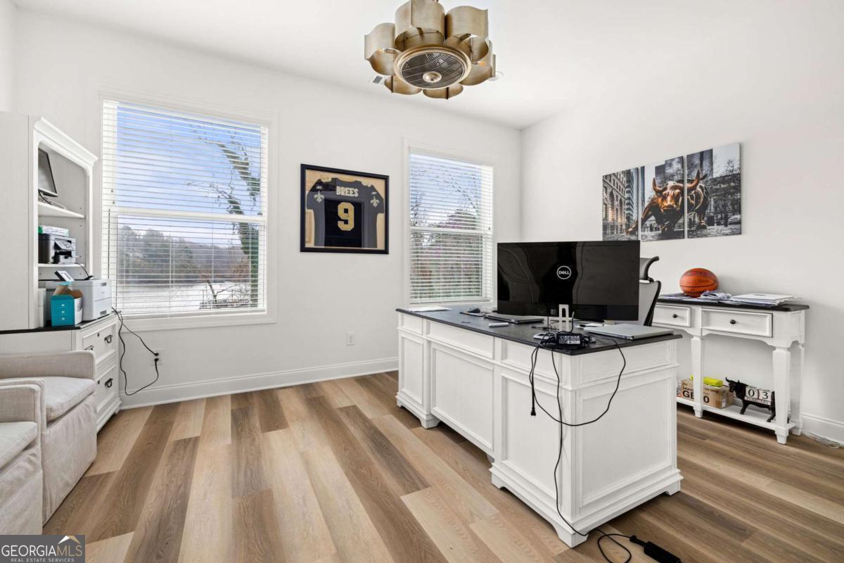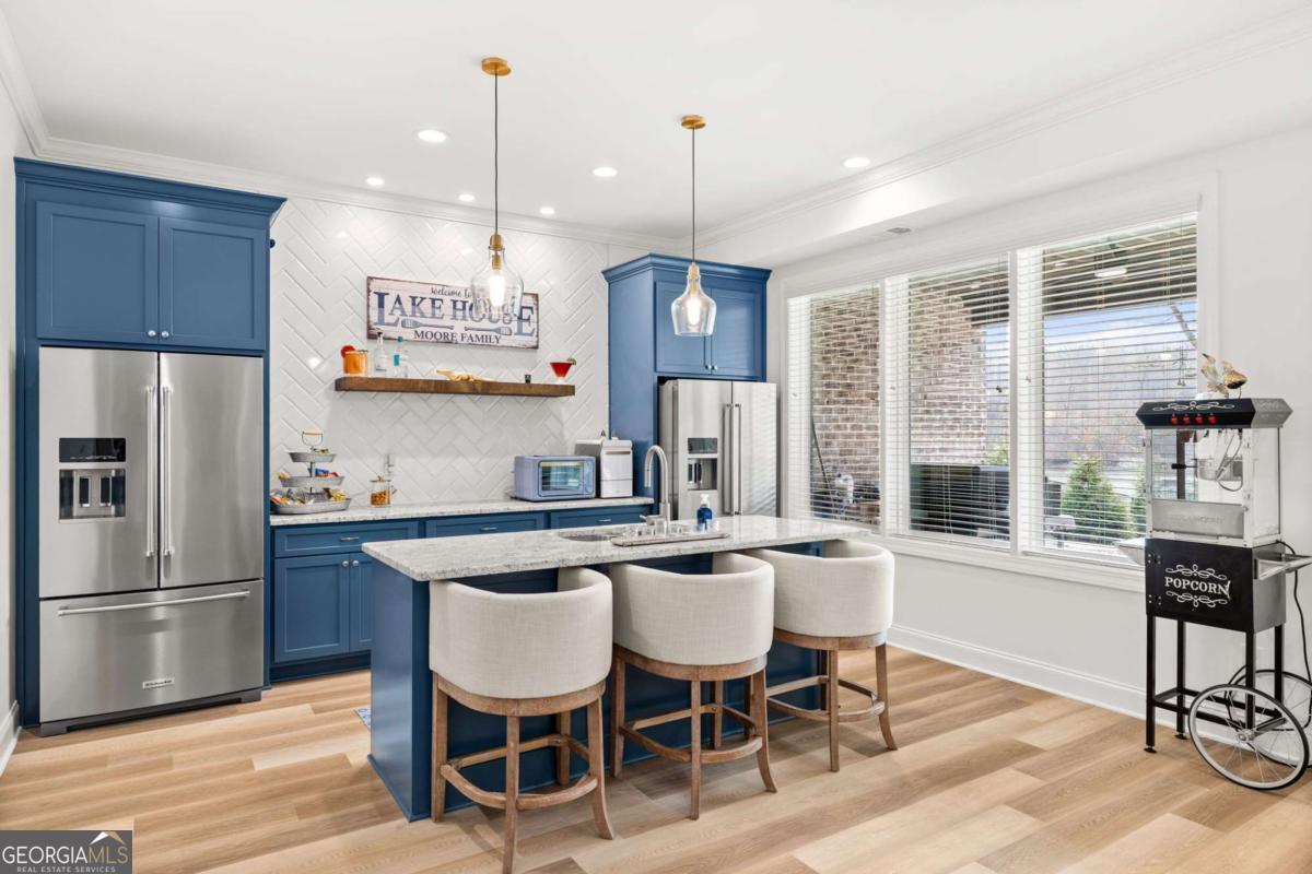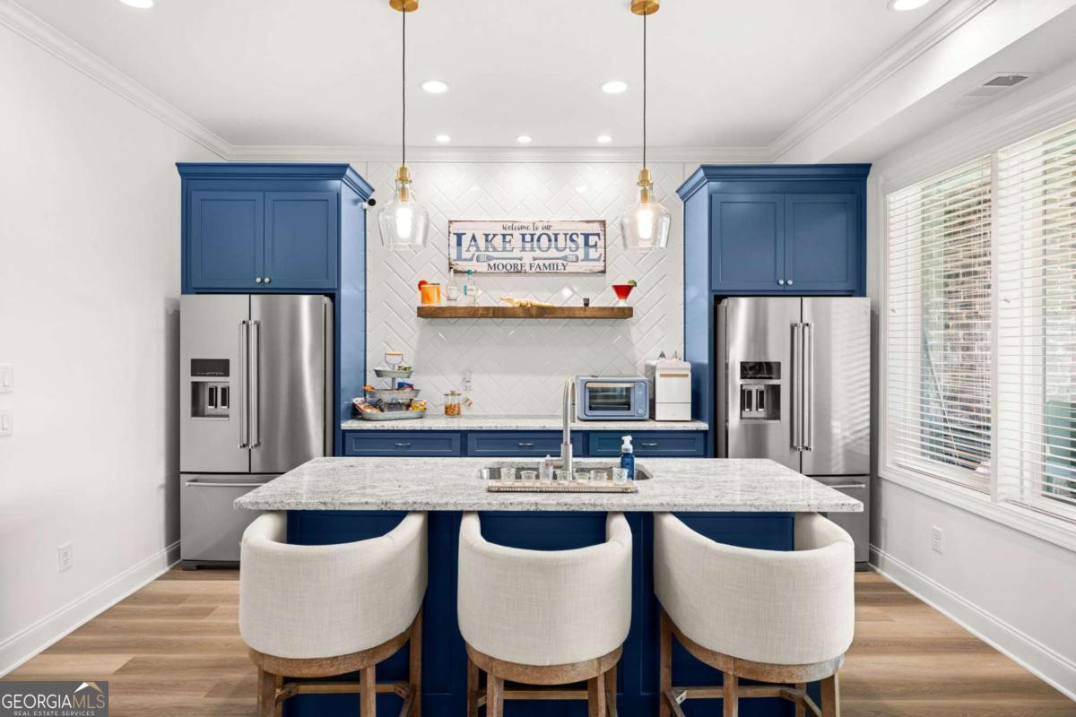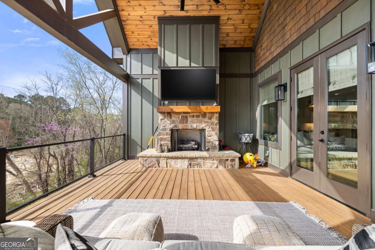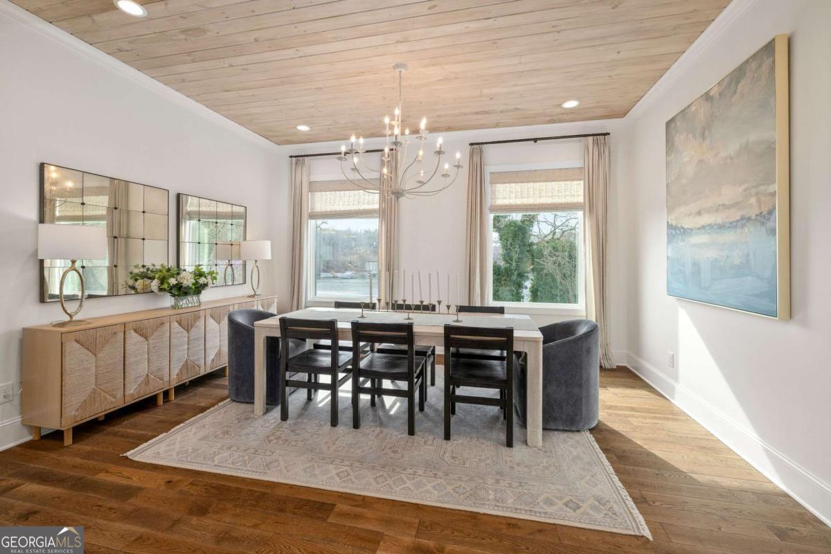 Better than new Lake Lanier waterfront home in Gainesville located on a quiet cul-de-sac with beautiful lake views, a gentle walk to the water, and a private fenced and gated front entrance. Rare opportunity to own a move in ready lake home with double slip dock, guest apartment, and space for entertaining, located minutes from Downtown Gainesville Square and less than one hour from Atlanta. The exterior features natural stone, board and batten siding, and a covered stone front porch with wood ceiling. Inside, the open floor plan is designed to capture lake views from the main living areas. The great room with stone fireplace flows into the gourmet kitchen with custom cabinetry, quartz countertops, large island, stainless steel appliances, beverage center, ice maker, custom pantry, and built in hutch. The breakfast room overlooks the lake, and the covered fireside deck is perfect for outdoor dining and relaxing. Custom blinds have been installed throughout the home. The main level primary suite overlooks the lake and includes a spa style bath and walk in closet. Upstairs you will find a large flex room and guest bedrooms, each with a private en suite bath. The finished terrace level is ideal for entertaining or multi generational living and includes a second kitchen with double refrigerators, dishwasher, and sink, large living area, billiards space, flex room for media room or gym, guest bedroom, and two full baths. Additional features include mudroom, laundry room, epoxy flooring in the two car garage, and a covered breezeway leading to a cottage apartment above the garage with private entry, bedroom, bath, kitchen, laundry, and living space ready for finishing. The home also includes a Generac whole house generator. A gentle walk leads to the new Martin 32x32 double slip dock with party deck, featuring a Duratek shallow water 7,500 lb boat lift, electricity, and freshwater line. Shoreline riprap and new stairs provide easy access to the dock. After a day on the lake, rinse off in the outdoor shower and relax on the covered veranda. Located within walking distance to Lake Lanier Olympic Park and the renovated Boathouse, this home offers one of the most desirable locations on Lake Lanier. Rare Lake Lanier waterfront home with double slip dock, guest apartment, gated entrance, and gentle walk to the water in Gainesville.