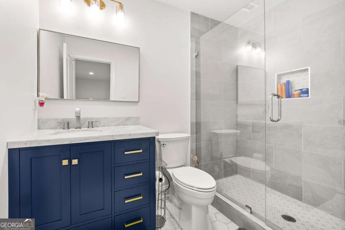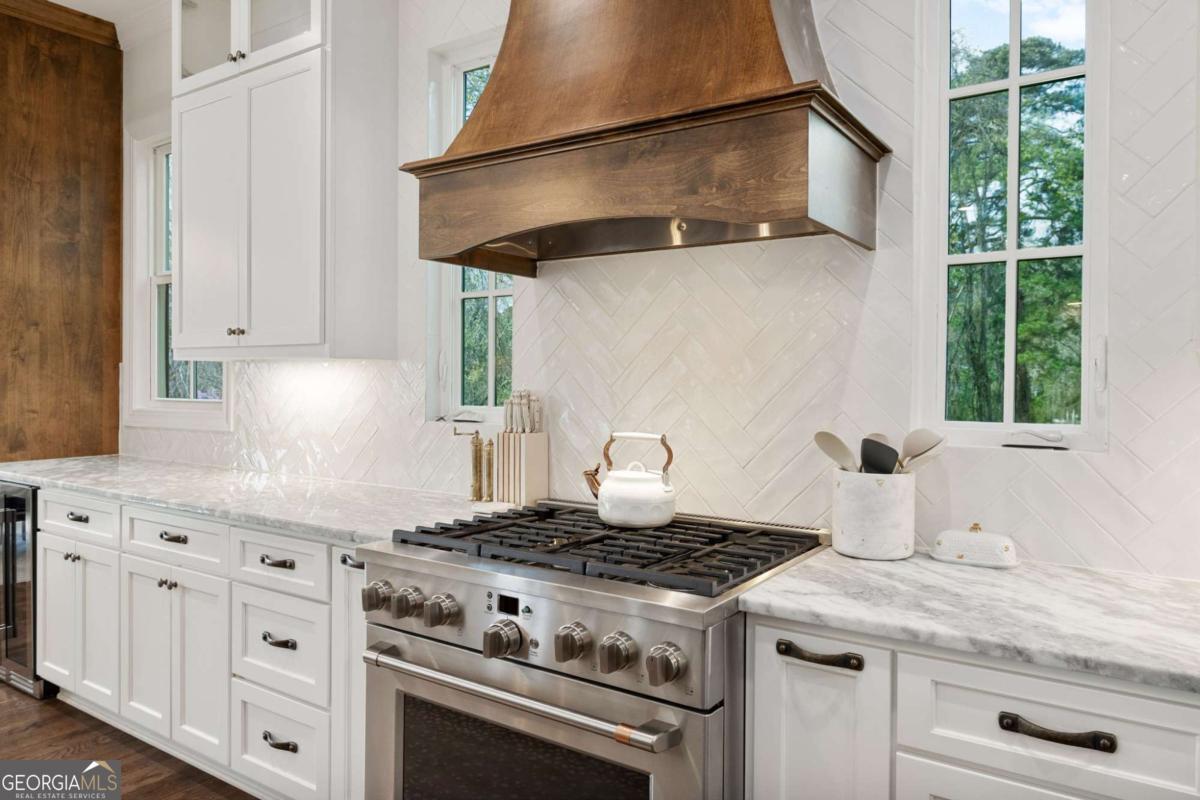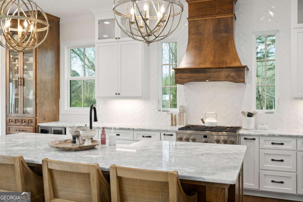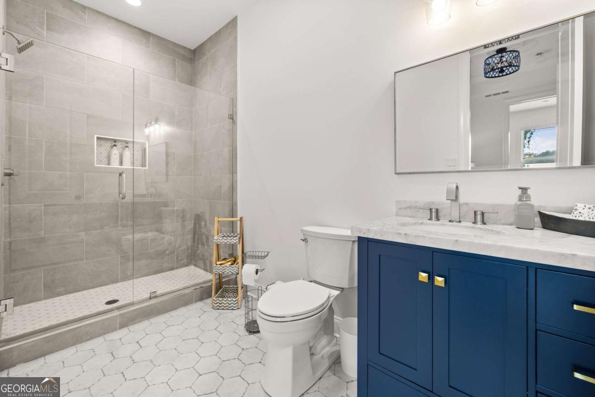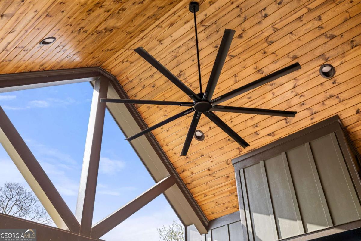 Better than new Lake Lanier waterfront home in Gainesville located on a quiet cul-de-sac with beautiful lake views, a gentle walk to the water, and a private fenced and gated front entrance. Rare opportunity to own a move in ready lake home with double slip dock, guest apartment, and space for entertaining, located minutes from Downtown Gainesville Square and less than one hour from Atlanta. The exterior features natural stone, board and batten siding, and a covered stone front porch with wood ceiling. Inside, the open floor plan is designed to capture lake views from the main living areas. The great room with stone fireplace flows into the gourmet kitchen with custom cabinetry, quartz countertops, large island, stainless steel appliances, beverage center, ice maker, custom pantry, and built in hutch. The breakfast room overlooks the lake, and the covered fireside deck is perfect for outdoor dining and relaxing. Custom blinds have been installed throughout the home. The main level primary suite overlooks the lake and includes a spa style bath and walk in closet. Upstairs you will find a large flex room and guest bedrooms, each with a private en suite bath. The finished terrace level is ideal for entertaining or multi generational living and includes a second kitchen with double refrigerators, dishwasher, and sink, large living area, billiards space, flex room for media room or gym, guest bedroom, and two full baths. Additional features include mudroom, laundry room, epoxy flooring in the two car garage, and a covered breezeway leading to a cottage apartment above the garage with private entry, bedroom, bath, kitchen, laundry, and living space ready for finishing. The home also includes a Generac whole house generator. A gentle walk leads to the new Martin 32x32 double slip dock with party deck, featuring a Duratek shallow water 7,500 lb boat lift, electricity, and freshwater line. Shoreline riprap and new stairs provide easy access to the dock. After a day on the lake, rinse off in the outdoor shower and relax on the covered veranda. Located within walking distance to Lake Lanier Olympic Park and the renovated Boathouse, this home offers one of the most desirable locations on Lake Lanier. Rare Lake Lanier waterfront home with double slip dock, guest apartment, gated entrance, and gentle walk to the water in Gainesville.