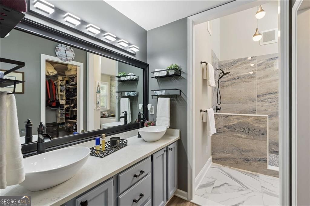 Welcome to 4832 Shallow Creek! This beautifully updated ranch home offering space, style, and an unbeatable location. Nestled on a quiet cul-de-sac in a sought-after swim/tennis neighborhood, this home sits on a level, private lot with abundant natural light and an open, inviting floorplan. Extensively updated, the home features 5 bedrooms and 3 full bathrooms, including a remodeled primary suite designed for comfort and relaxation. Meticulously maintained with updates galore, including smooth ceilings, luxury vinyl plank flooring throughout the main level, a large kitchen with new SS appliances, designer backsplash, soft-close cabinetry, neutral designer paint, newer roof, newer HVAC systems, and a gorgeous screen porch making this home truly move-in ready. The bright kitchen offers abundant cabinetry and flows easily into the living spaces, creating a perfect layout for everyday living and entertaining. The screened porch overlooks the peaceful backyard, providing the ideal spot to relax and enjoy the natural setting. The full daylight basement expands the home's flexibility, offering 2 additional bedrooms, updated carpet, a third full bath, and versatile spaces ideal for a home office, gym, or media room. A 3rd car garage/boat door, dedicated workshop, and extensive storage add incredible functionality. Located just minutes from I-575, I-75, Kennesaw State University, shopping, dining, and award-winning schools, this home combines convenience with neighborhood charm. A rare opportunity for space, luxurious updates, and location all in one! Hurry to see this fabulous ranch home on a full basement!