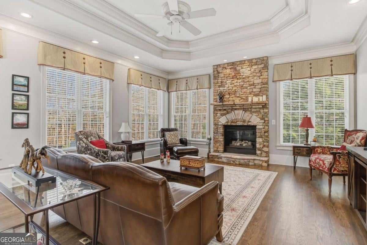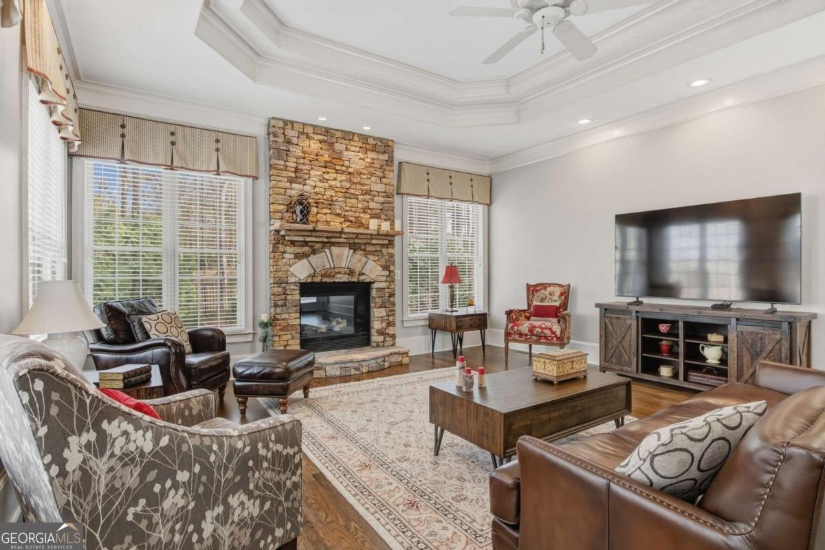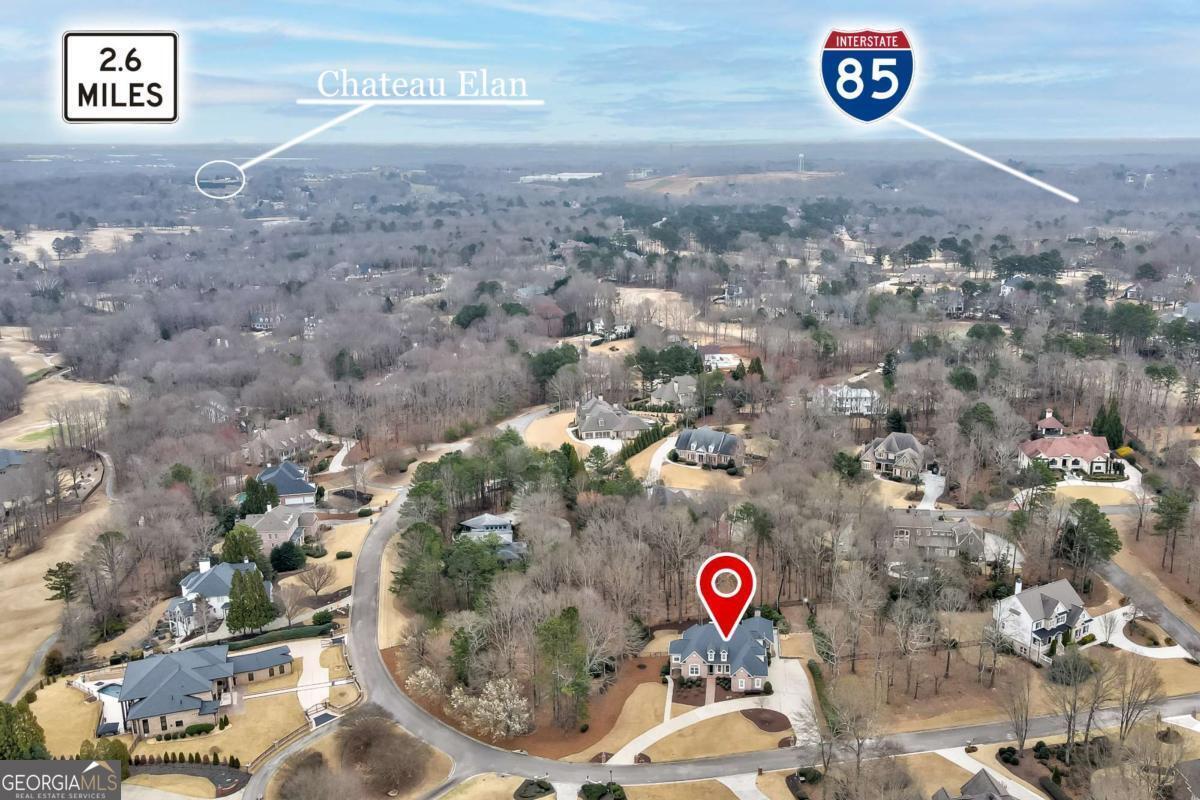 Experience the pinnacle of Braselton living in this stunning 4-sided brick executive estate. Located within the prestigious gated community of Chateau Elan, this home offers a lifestyle of unparalleled luxury. The grand two-story foyer welcomes you into a light-filled floor plan featuring gleaming hardwoods and high ceilings throughout. The main-level Owner's Suite is a true retreat, showcasing a spa-like bathroom with a jetted tub, double showers, towel warmer, and a massive custom walk-in closet. The chef's kitchen featuring Subzero fridge and Wolf cooktop -complete with a central island seating 8 and solid surface counters -flows seamlessly into the breakfast area and fireside living room. The stacked stone fireplace and the floor to ceiling windows are the highlight of the keeping room. Upstairs, find three generous bedrooms, including a private ensuite and a Jack-and-Jill bath. The terrace level is a standout feature, offering a daylight-finished basement with exterior entry, living area, bedroom with a walk-in closet and full bath -ideal for an in-law suite. You will also find a stylish pub and a spacious entertainment room. Recent updates and a meticulous 3-car garage make this home move-in ready. Outside, your private wooded oasis awaits with a lush backyard, propane outdoor kitchen and a brick paved porch. Enjoy world-class amenities including golf, spa, tennis, a winery, and top-tier dining just moments away.