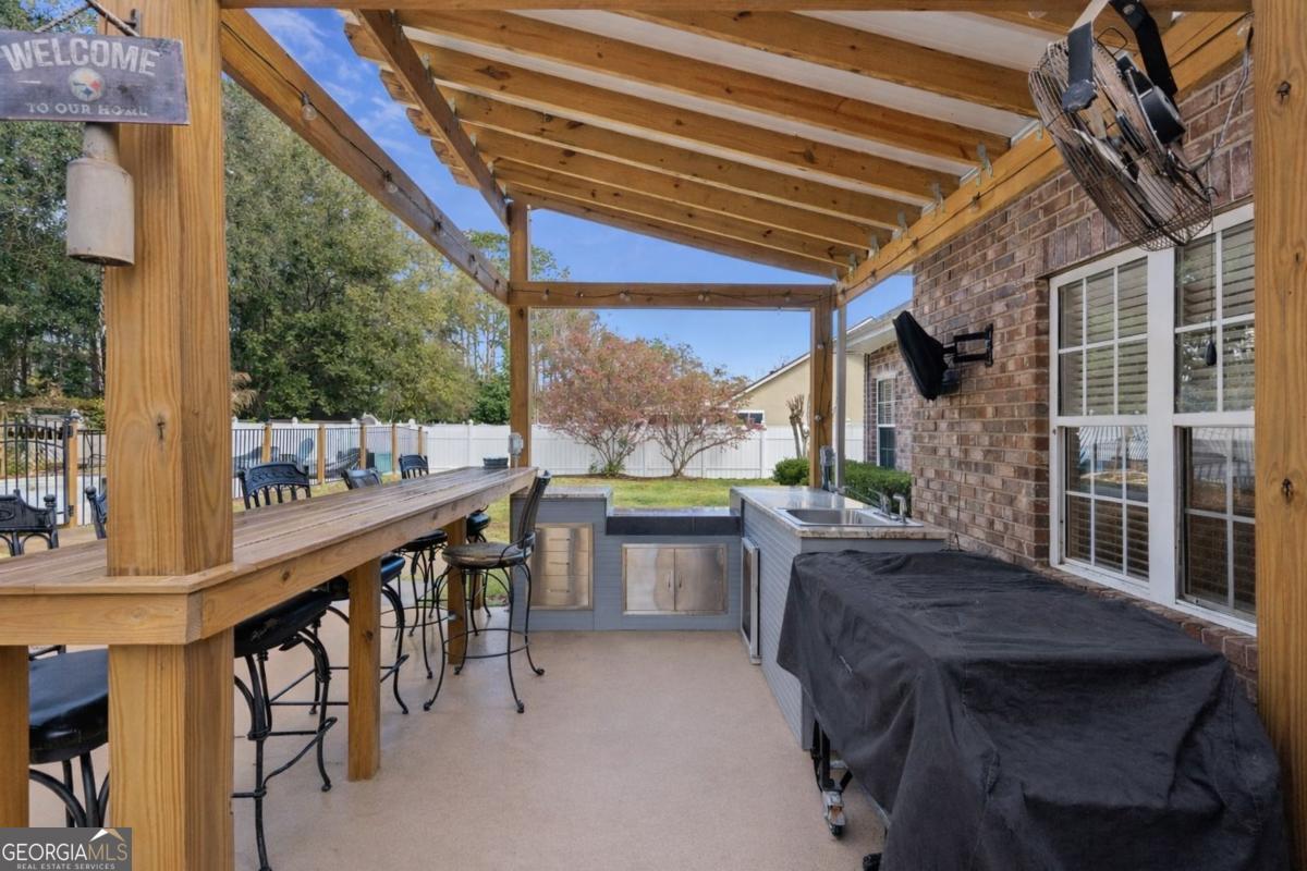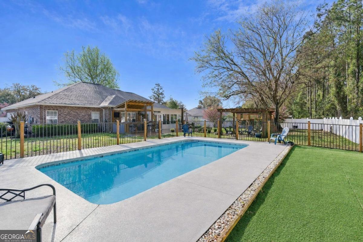 Welcome to your pool home oasis in the highly desirable Eaglecrest Community. This well-maintained 3-bedroom, 2-bathroom home features numerous recent upgrades and a beautiful backyard designed for relaxing and entertaining. The home includes a brand-new roof, new HVAC system, and new hot water heater, offering peace of mind for the next owner. Durable flooring runs throughout the home with no carpet in the main living areas. The kitchen features stainless steel GE appliances and flows easily into the main living spaces. The oversized primary suite offers a comfortable retreat and includes an updated ensuite bathroom with a newly tiled shower. A bright sunroom off the back of the home overlooks the backyard and provides additional space to relax or entertain. Step outside to enjoy your own backyard oasis featuring a saltwater pool, covered outdoor kitchen, and plenty of space for gatherings. The yard also includes mature landscaping, fruit trees, garden beds, and a natural buffer behind the property. A treehouse and observation deck add a unique outdoor feature, while large vinyl gates provide convenient access for storing a boat or trailer. With its many updates and inviting outdoor living spaces, this Brunswick home offers comfort, functionality, and room to enjoy the outdoors, all while being just a short drive from the beautiful Georgia beaches of Jekyll Island and St. Simons Island.