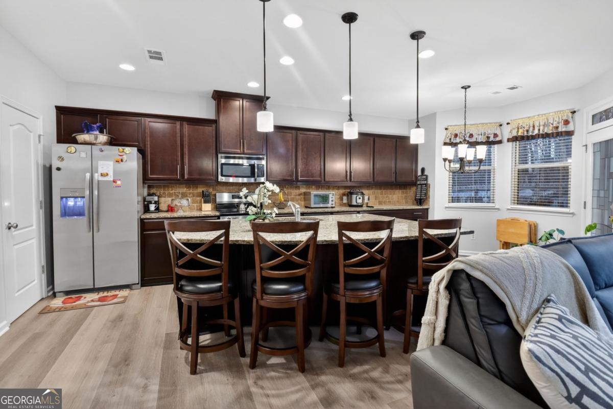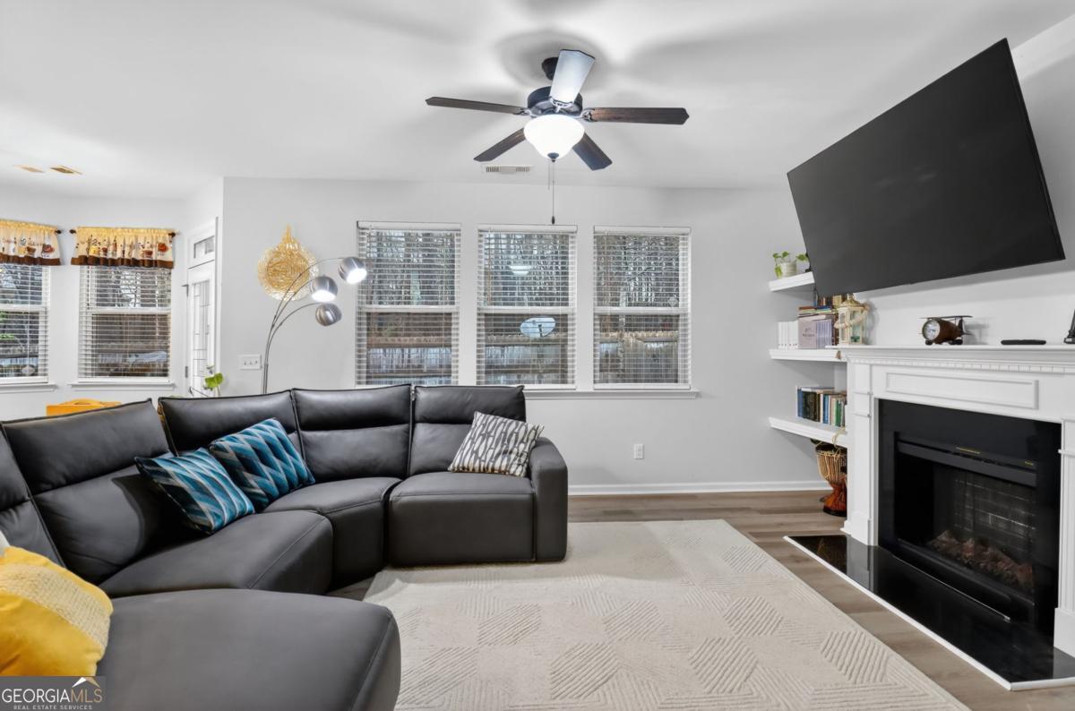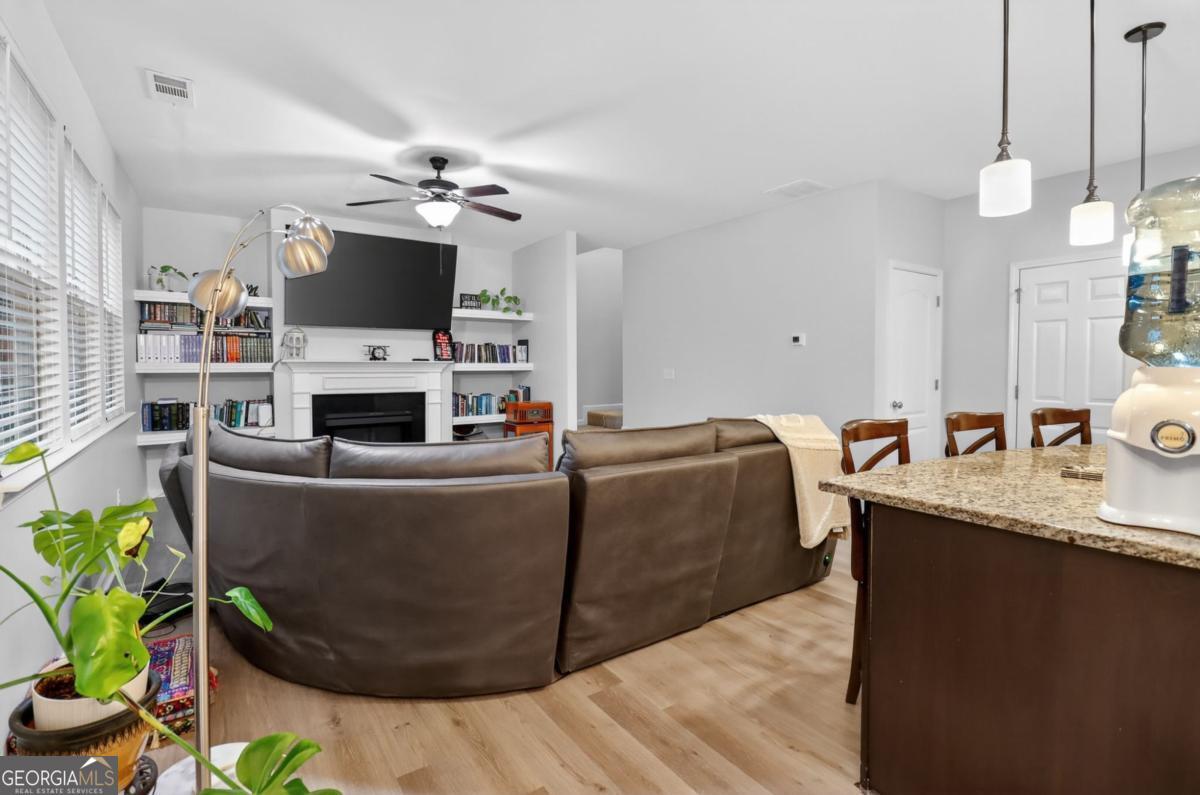 Luxury, location, and low-maintenance living all in one beautifully designed townhome. This well-maintained residence offers 3 bedrooms, 2.5 bathrooms, and approximately 1938 sq ft of thoughtfully designed living space. The open-concept layout highlights luxury vinyl plank flooring, granite countertops, stainless steel appliances, and a spacious kitchen island overlooking the main living area-ideal for entertaining or everyday living. The inviting family room features custom built-in shelving and a cozy fireplace, creating a warm and elegant atmosphere. Upstairs, the owner's suite offers a walk-in closet, double vanity, and separate soaking tub and shower, while additional bedrooms provide comfortable space for family, guests, or a home office. Enjoy outdoor living with a private fenced backyard and patio, perfect for relaxing or hosting gatherings. The home also provides ample parking with a two-car garage, space for up to four vehicles, and convenient guest parking nearby. Ideally located near Loganville, Grayson, and just minutes from Lawrenceville with easy access to shopping, dining, and everyday conveniences including Publix, Target, and Home Depot.