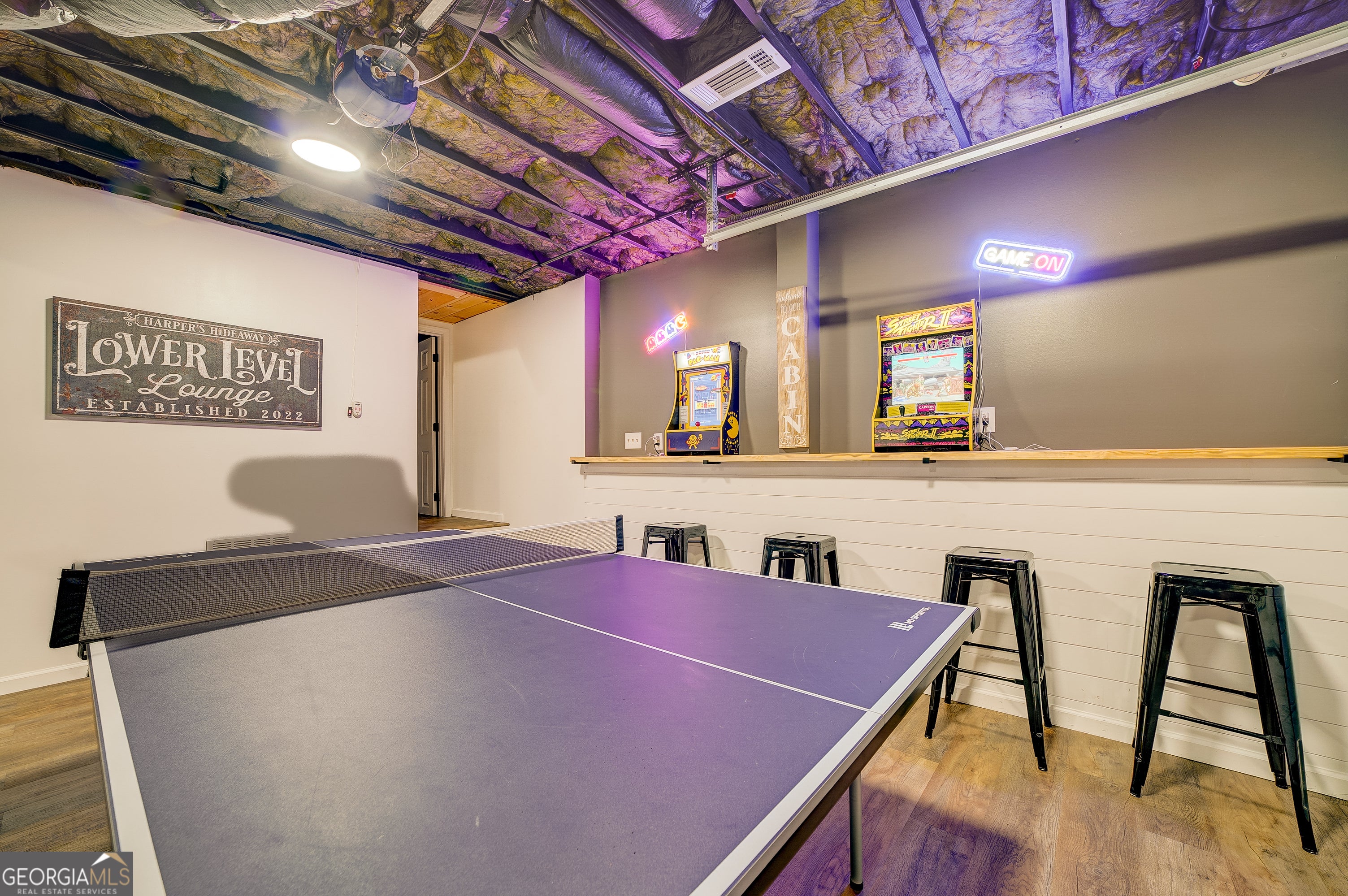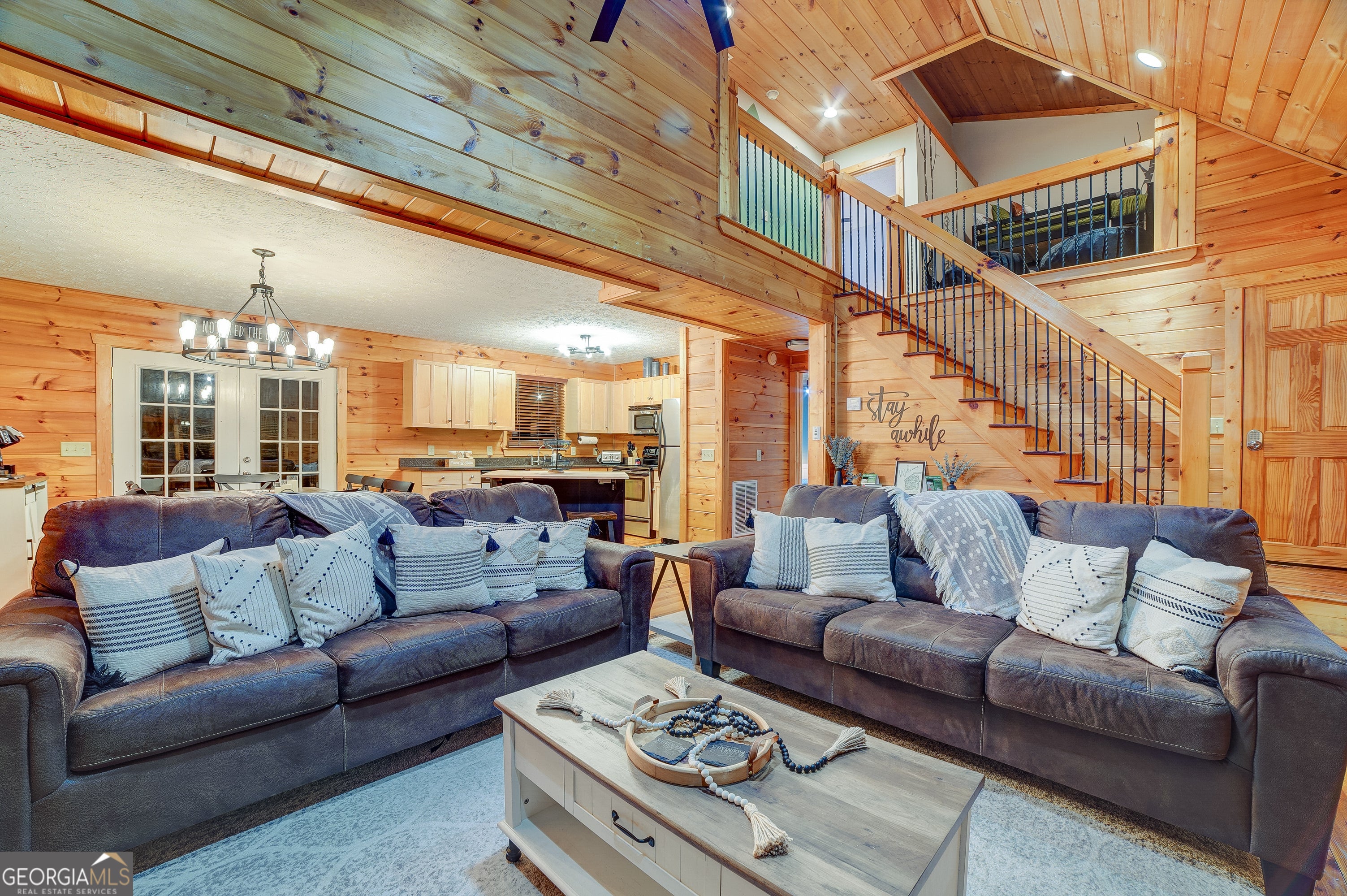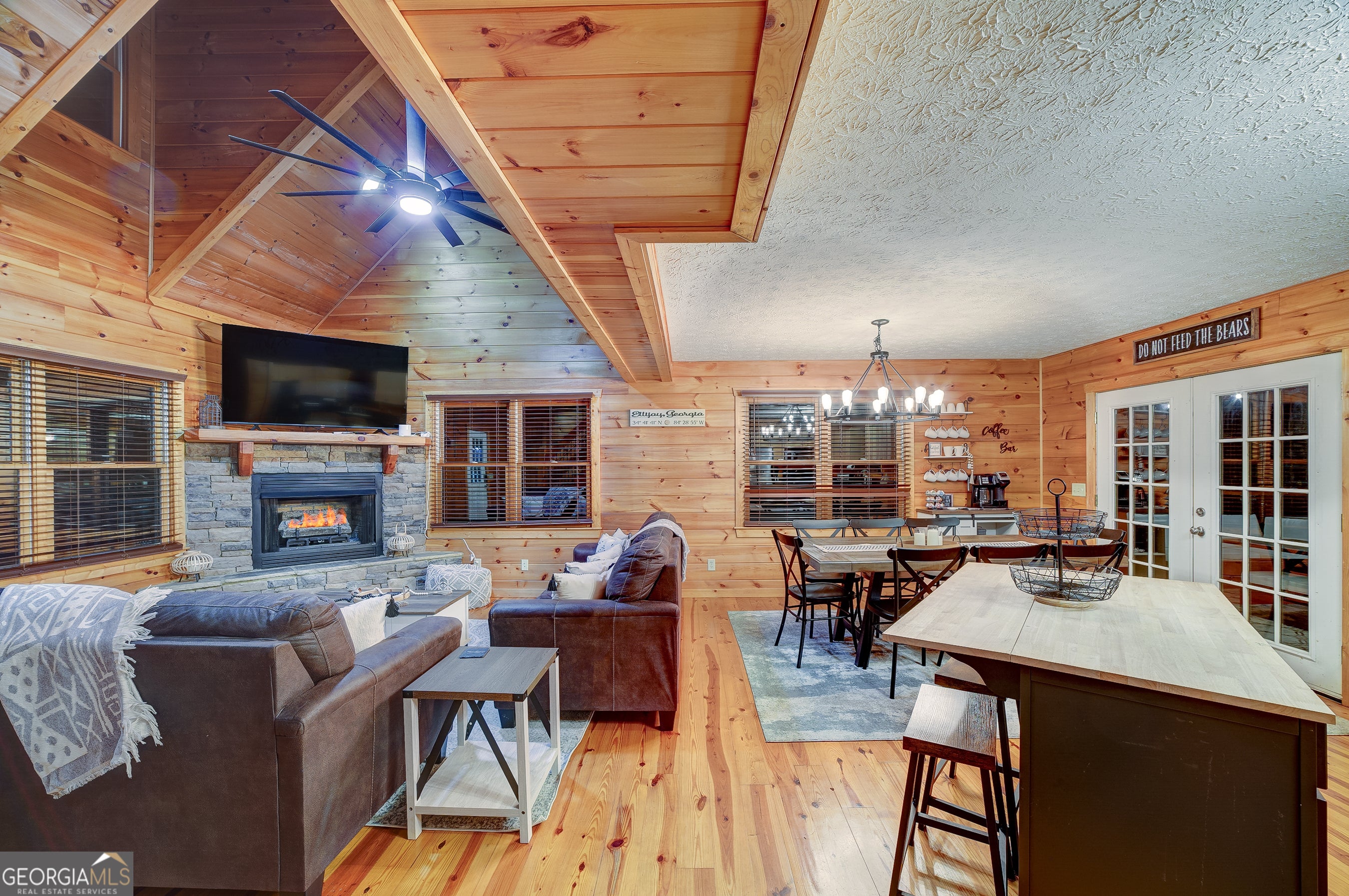 Welcome to this beautifully appointed 4-bedroom, 3-bathroom cabin retreat featuring a spacious loft overlooking the main living area and a fully finished basement designed for entertainment. From the moment you enter, you'll notice the warm and inviting atmosphere that makes this home the perfect place to relax and unwind. The main level features a spacious primary suite with a king bed and a private ensuite bathroom, offering comfort and privacy. Upstairs, you'll find two additional bedrooms with queen beds, a full bathroom, and a charming loft area with bunk beds-ideal for guests or additional sleeping space. The finished basement offers the ultimate recreation space, complete with a game room featuring ping pong, darts, arcade games, Skee-Ball, and more. This level also includes a fourth bedroom with two twin beds and an additional full bathroom, providing plenty of space for guests. Outdoor living is just as impressive, with a wrap-around porch designed for relaxation and entertaining. Enjoy the screened-in front porch with classic rocking chairs, or gather on the back deck featuring a comfortable wicker dining area with charming market lighting. A cozy seating area just outside the primary bedroom creates the perfect spot to enjoy the peaceful surroundings. Whether used as a full-time residence, vacation home, or investment property, this cabin offers the ideal blend of comfort, entertainment, and serene outdoor living.
