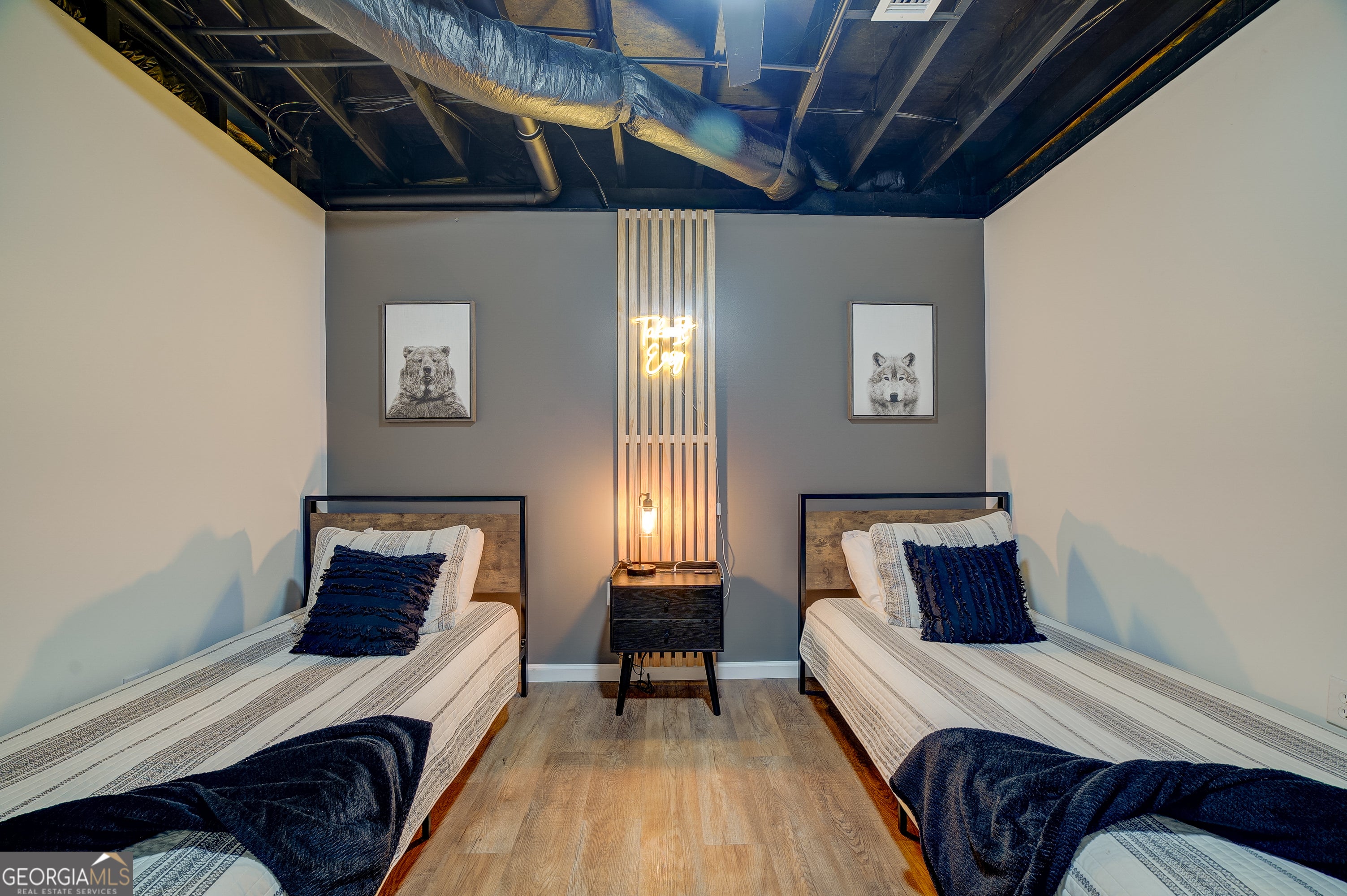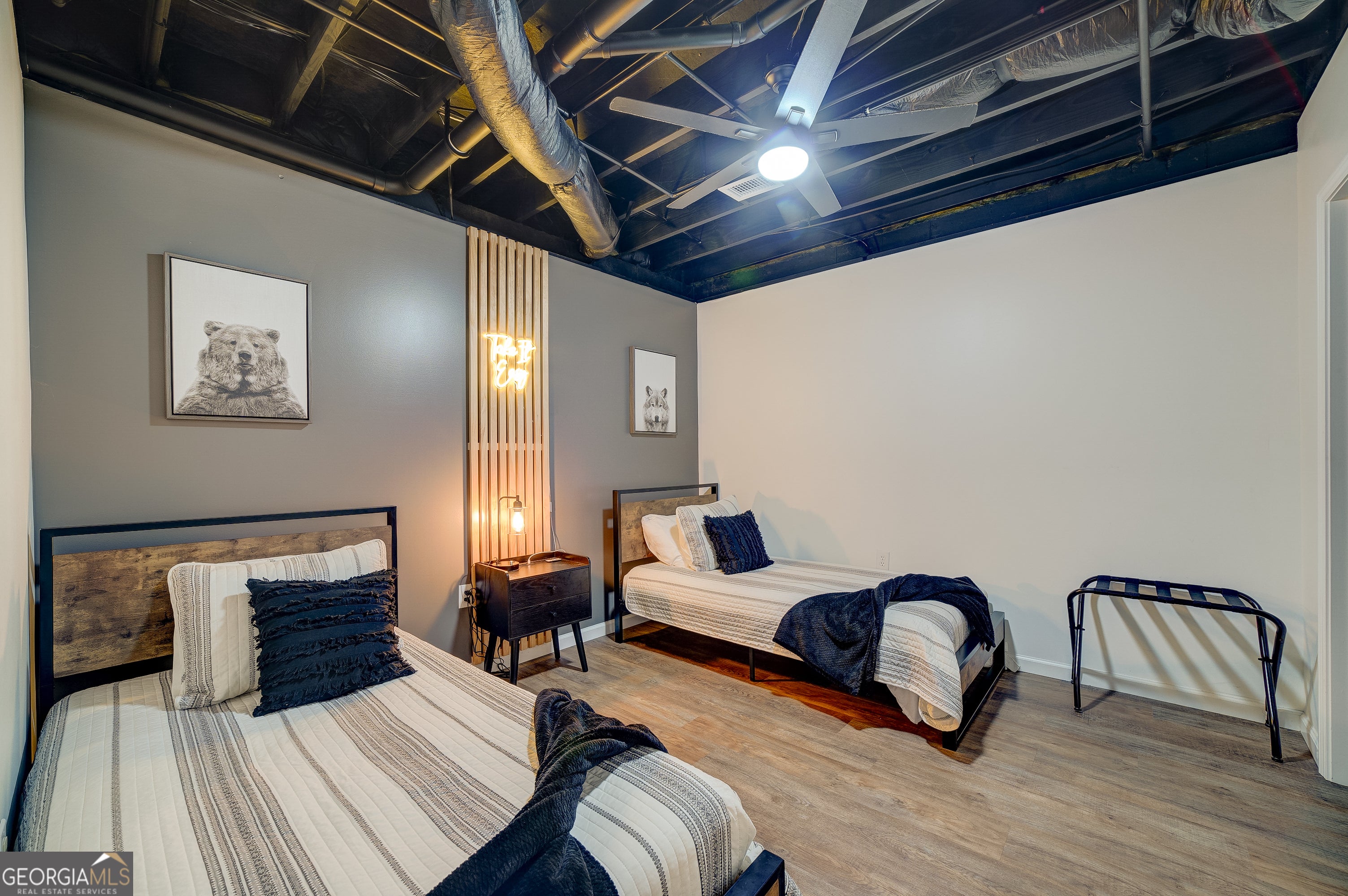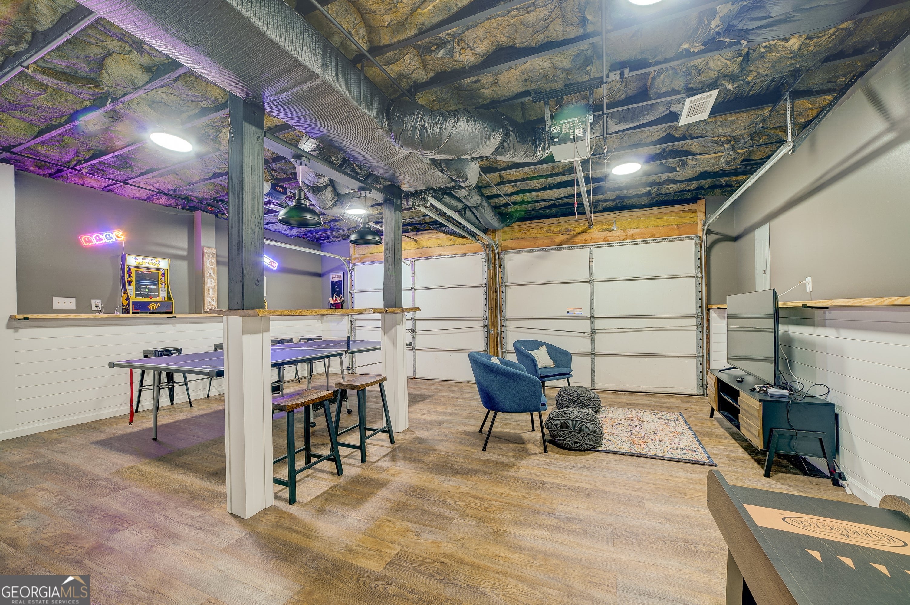 Welcome to this beautifully appointed 4-bedroom, 3-bathroom cabin retreat featuring a spacious loft overlooking the main living area and a fully finished basement designed for entertainment. From the moment you enter, you'll notice the warm and inviting atmosphere that makes this home the perfect place to relax and unwind. The main level features a spacious primary suite with a king bed and a private ensuite bathroom, offering comfort and privacy. Upstairs, you'll find two additional bedrooms with queen beds, a full bathroom, and a charming loft area with bunk beds-ideal for guests or additional sleeping space. The finished basement offers the ultimate recreation space, complete with a game room featuring ping pong, darts, arcade games, Skee-Ball, and more. This level also includes a fourth bedroom with two twin beds and an additional full bathroom, providing plenty of space for guests. Outdoor living is just as impressive, with a wrap-around porch designed for relaxation and entertaining. Enjoy the screened-in front porch with classic rocking chairs, or gather on the back deck featuring a comfortable wicker dining area with charming market lighting. A cozy seating area just outside the primary bedroom creates the perfect spot to enjoy the peaceful surroundings. Whether used as a full-time residence, vacation home, or investment property, this cabin offers the ideal blend of comfort, entertainment, and serene outdoor living.