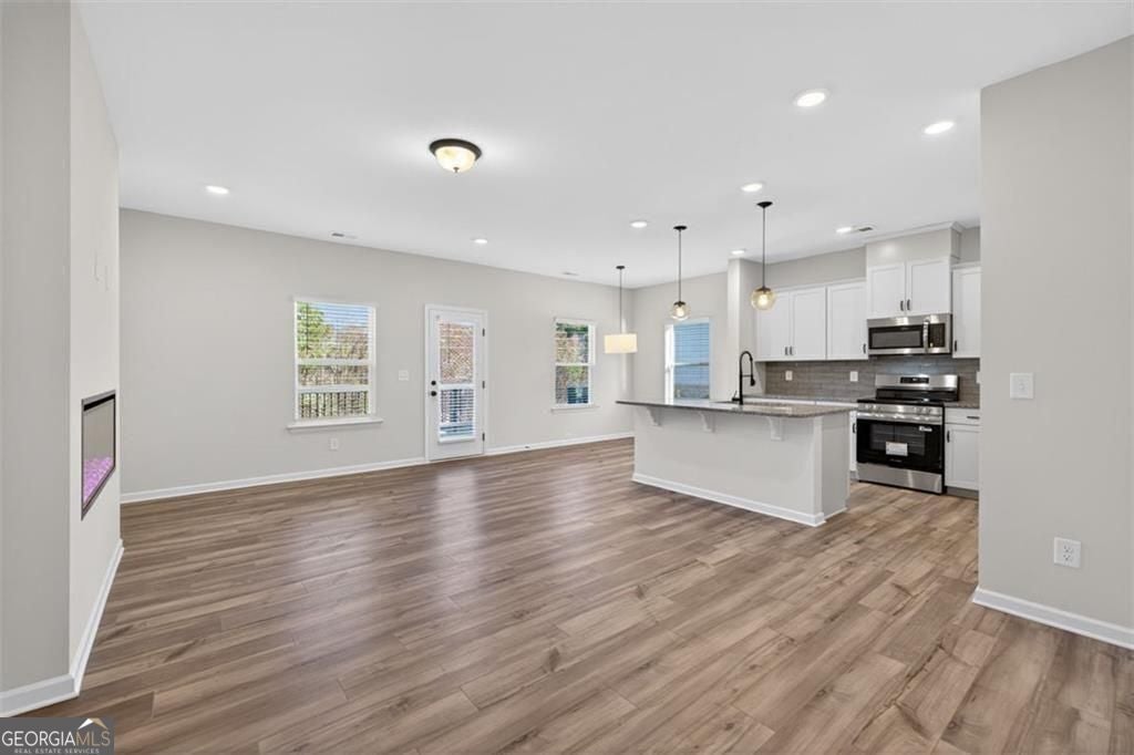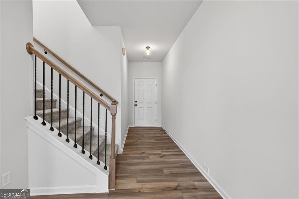 Move in Ready! The Norwood II floorplan in Smith Douglas Homes Franklin Manor community. Fantastic Location! This beautifully designed end-unit townhome features one of our most popular floorplans and is filled with natural light from every angle. With designer upgrades throughout, and blinds and appliances already included, this home is truly move-in ready. The kitchen stands out with upgraded cabinetry, quartz countertops, stainless steel appliances, and a center island accented by pendant lighting. It opens seamlessly into a bright, inviting family room highlighted with additional windows and a sleek linear fireplace. Luxury vinyl plank flooring extends across the main level for a clean, modern look, and the private deck is the perfect spot to unwind or host weekend get-togethers. Upstairs, the spacious Primary suite offers a walk-in closet and a spa-inspired bath featuring a tiled shower and double vanity. Two additional bedrooms and a convenient laundry room round out the second floor-both levels offering 9-foot ceilings for an airy, open feel.Full appliance package included! Lawn care and exterior maintenance are handled through the HOA, giving you more time to enjoy your new home. Photos are of home. Don't miss your chance-schedule your private tour today and be settled in before the end of the year!