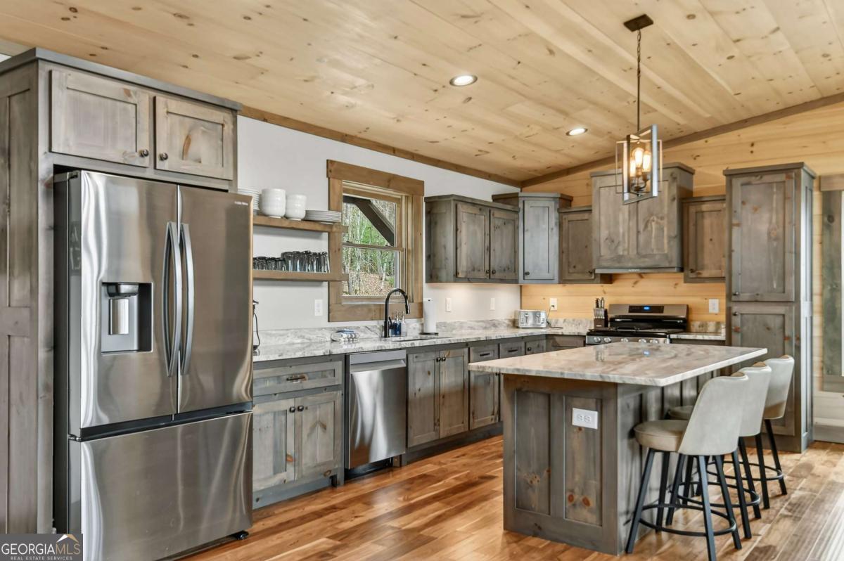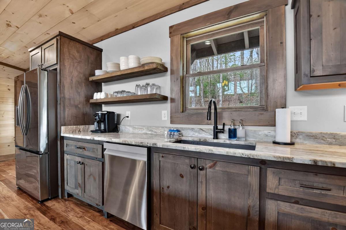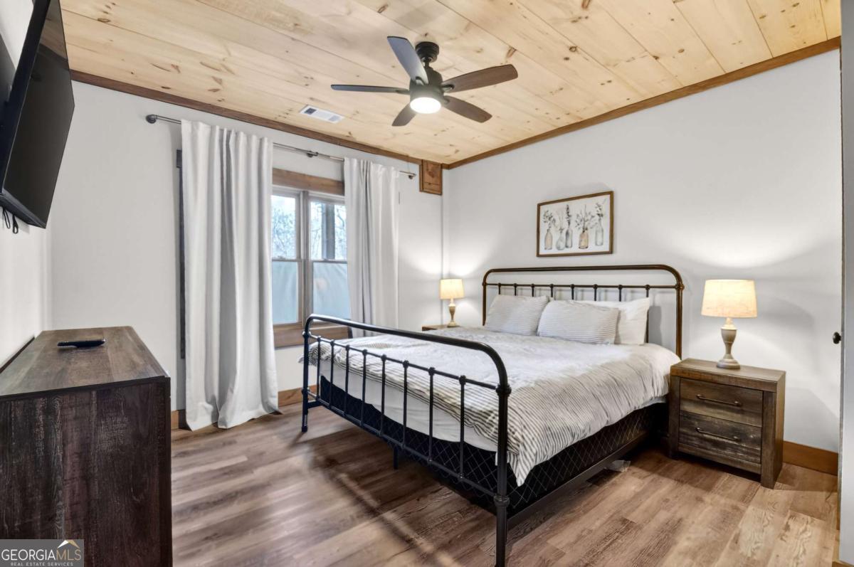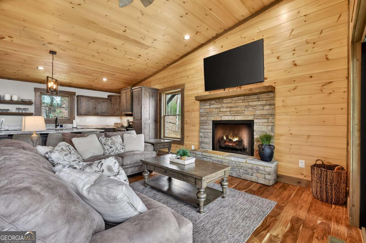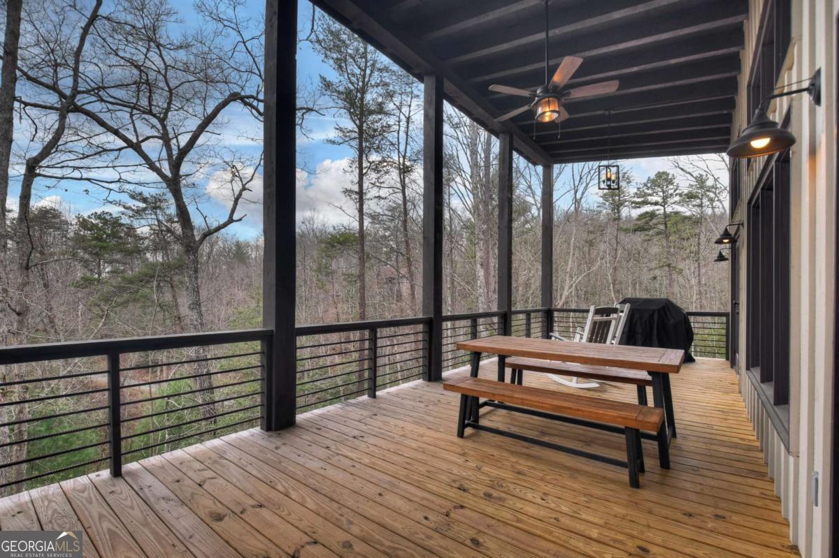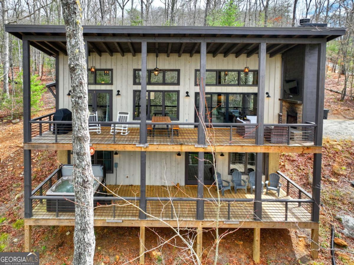 Blending contemporary design with rustic mountain character, this stylish retreat features a striking shed roofline and peaceful canopy views, all just minutes from Downtown Blue Ridge and Mercier Orchards. The main level showcases an open-concept design with dramatic walls of glass that fill the home with natural light and seamlessly connect indoor and outdoor living. Step onto the expansive entertaining deck with outdoor fireplace, the perfect setting for dining, relaxing, and enjoying the mountain air. A gourmet kitchen anchors the living space, while the spacious primary suite offers comfort and privacy. Throughout the home, bathrooms feature walk-in tile showers with glass enclosures, custom cabinetry, and stone countertops, blending luxury with thoughtful craftsmanship. The terrace level offers a large den with an impressive wet bar and two additional bedroom suites, creating the perfect layout for hosting guests or relaxing after a day in the mountains. A walk-out deck extends the living space outdoors and provides additional areas to unwind while overlooking the surrounding treetop canopy. Offered fully furnished, this turnkey mountain home is ideally suited as a private retreat, second home, or successful short-term rental in one of Blue Ridge's most desirable locations.