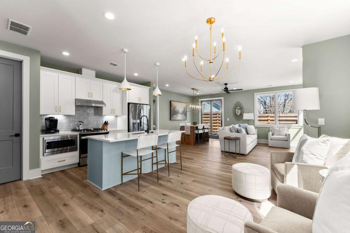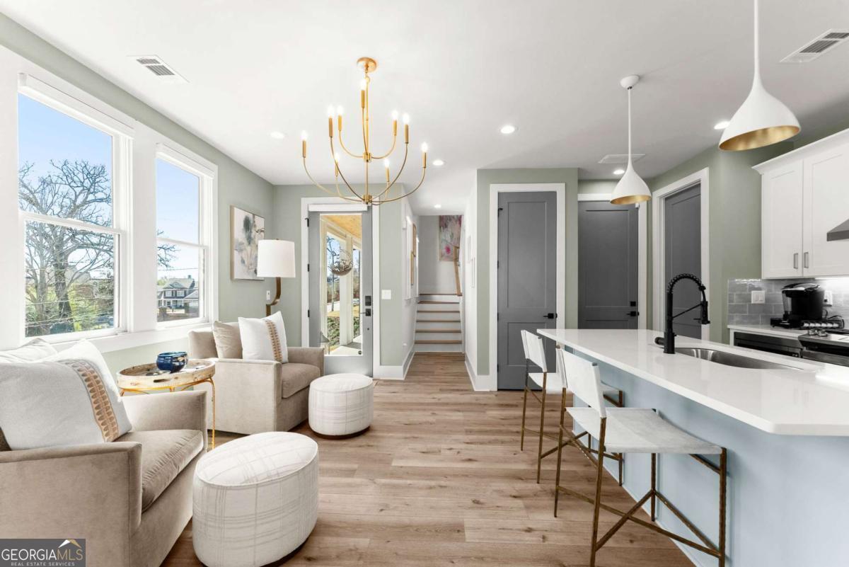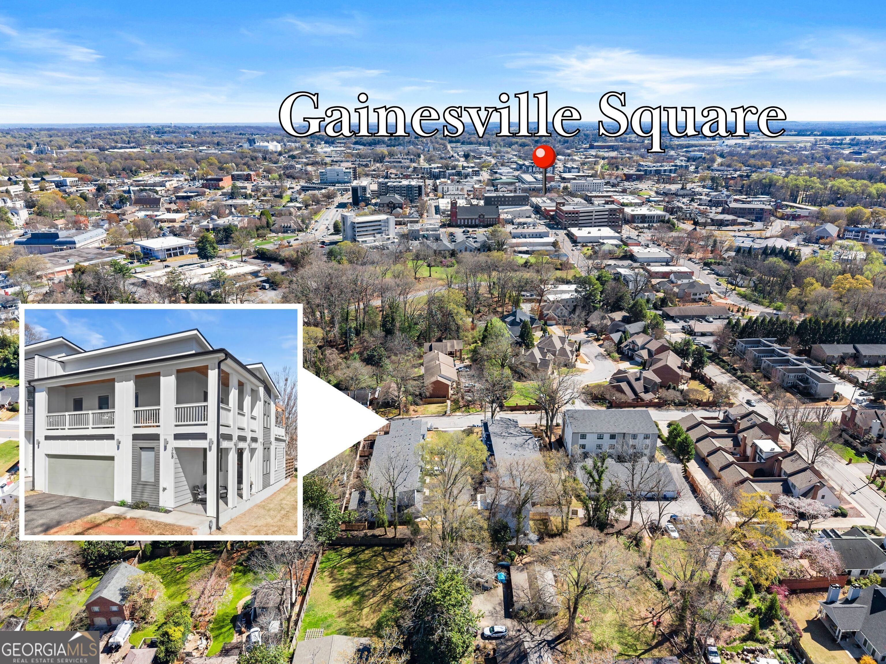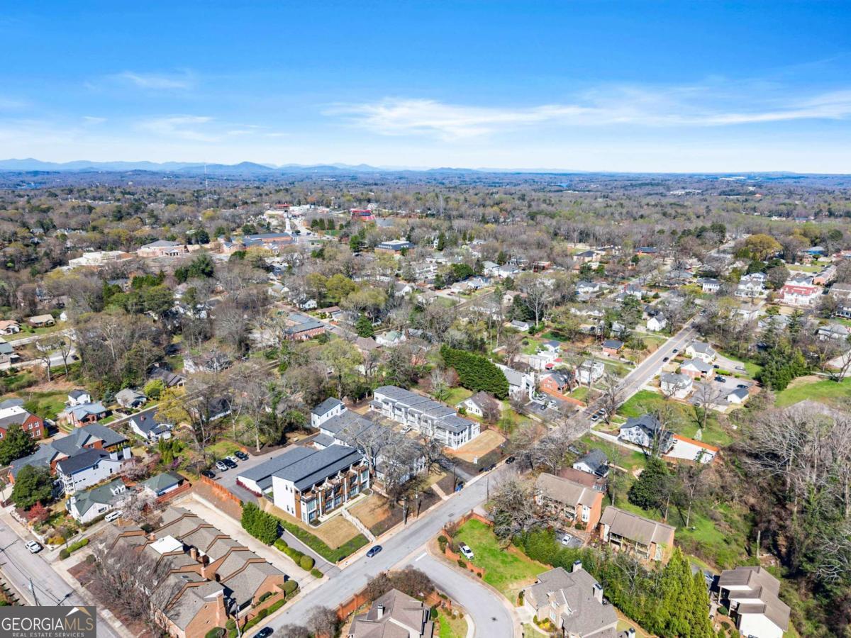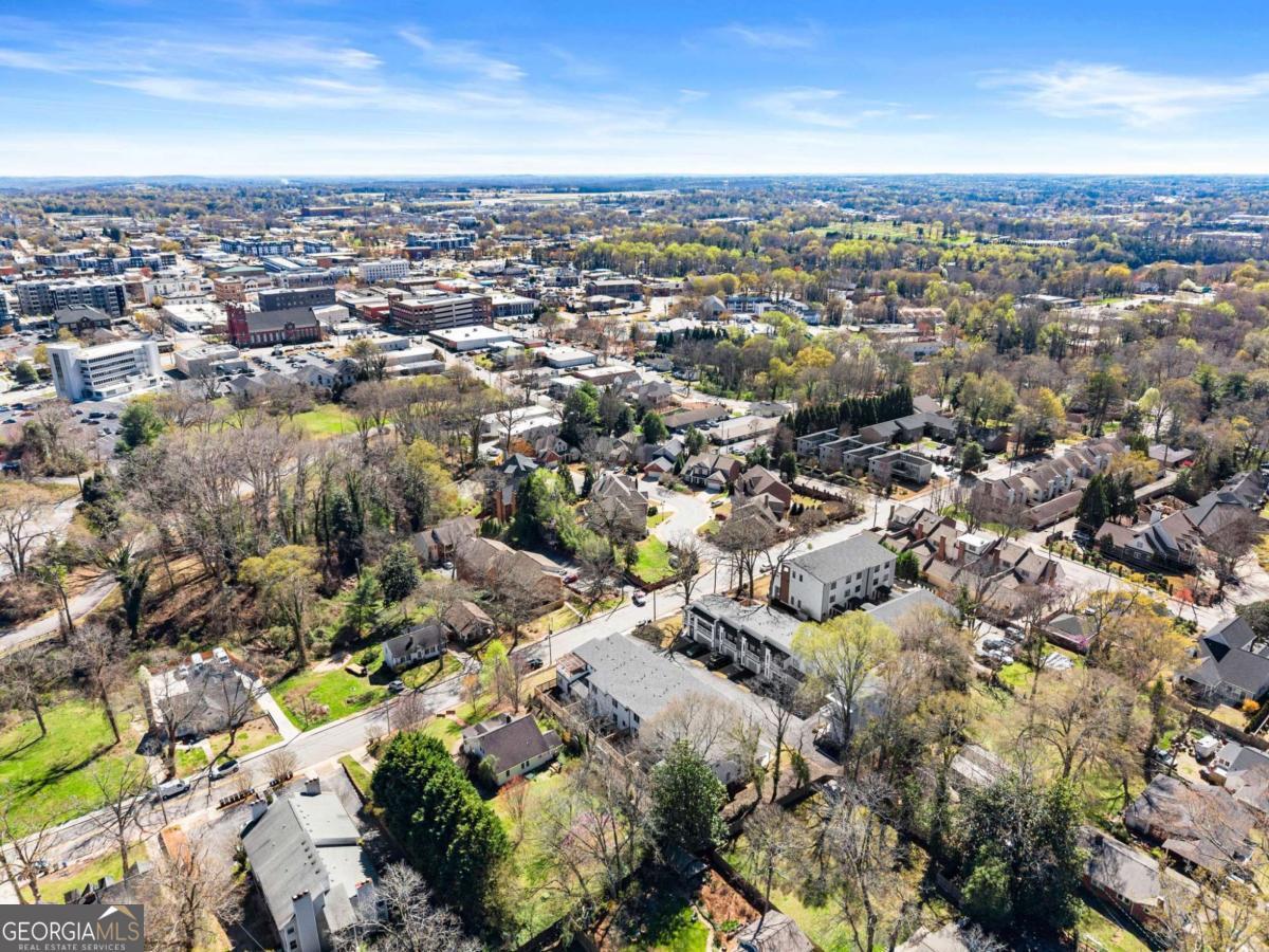 Rare primary-on-main townhome with a two-car garage just steps from downtown Gainesville's shops, restaurants, and coffee spots. This end-unit offers exceptional walkability for city living and low-maintenance comfort. Inside, soaring 10-foot ceilings, upgraded lighting, and LVP flooring throughout (no carpet) create a bright, modern feel. The open-concept kitchen features quartz countertops, a generous island, stainless steel appliances, and abundant cabinetry, making everyday living and entertaining effortless. The main-level primary suite provides privacy and convenience with a walk-in closet, double quartz vanity, and a beautifully tiled shower with a frameless glass door. Upstairs offers flexibility rarely found in townhomes with two additional bedrooms and an expansive loft that easily functions as a second living room, office, or media space. Outdoor living truly sets this home apart with multiple porches and decks, including a pergola-covered upper deck and three covered side porches-perfect for morning coffee, evening gatherings, or simply enjoying the outdoors. A fenced backyard adds privacy and usability. End unit - Primary on main - Walkable downtown location. Surprising storage and refreshing outdoor living. An impressive opportunity for easy living in one of Gainesville's most convenient locations.