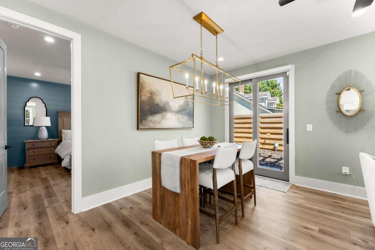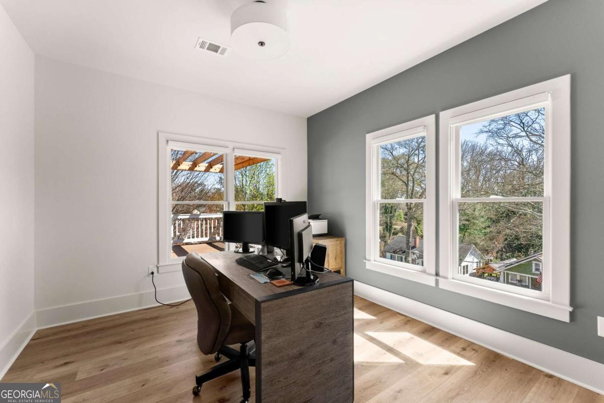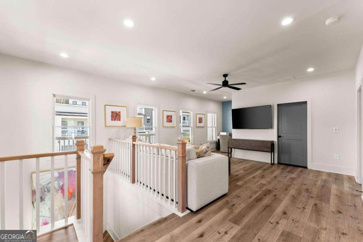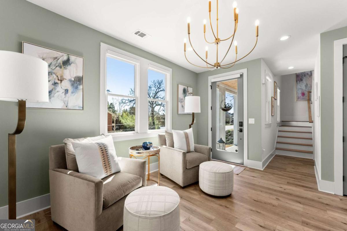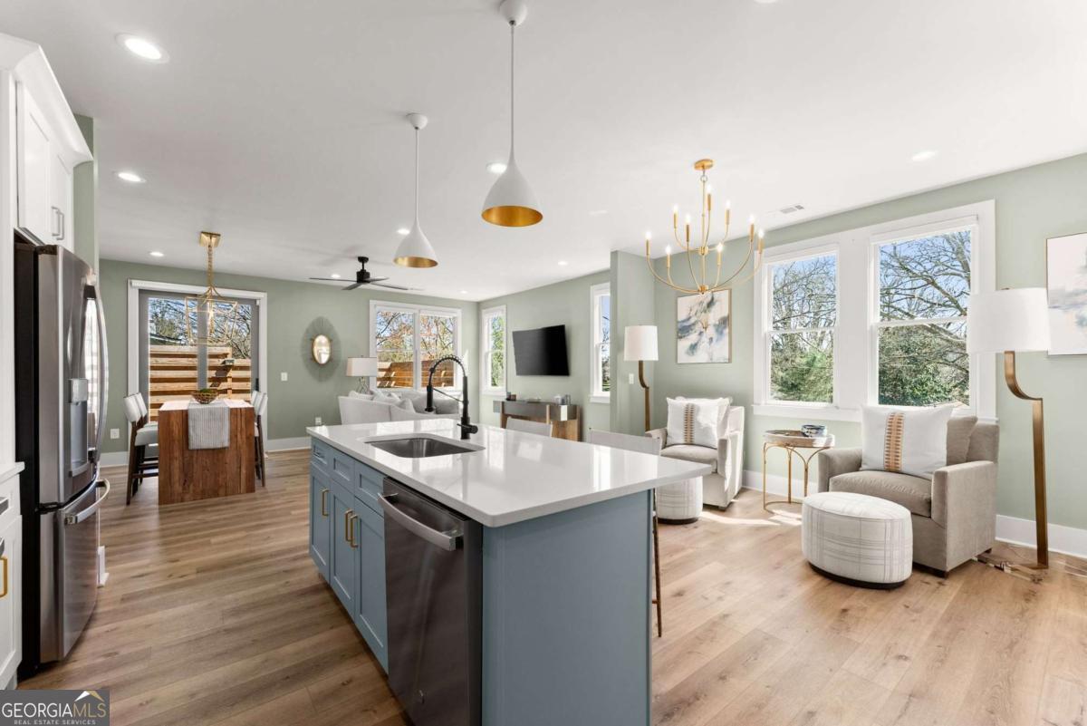 Rare primary-on-main townhome with a two-car garage just steps from downtown Gainesville's shops, restaurants, and coffee spots. This end-unit offers exceptional walkability for city living and low-maintenance comfort. Inside, soaring 10-foot ceilings, upgraded lighting, and LVP flooring throughout (no carpet) create a bright, modern feel. The open-concept kitchen features quartz countertops, a generous island, stainless steel appliances, and abundant cabinetry, making everyday living and entertaining effortless. The main-level primary suite provides privacy and convenience with a walk-in closet, double quartz vanity, and a beautifully tiled shower with a frameless glass door. Upstairs offers flexibility rarely found in townhomes with two additional bedrooms and an expansive loft that easily functions as a second living room, office, or media space. Outdoor living truly sets this home apart with multiple porches and decks, including a pergola-covered upper deck and three covered side porches-perfect for morning coffee, evening gatherings, or simply enjoying the outdoors. A fenced backyard adds privacy and usability. End unit - Primary on main - Walkable downtown location. Surprising storage and refreshing outdoor living. An impressive opportunity for easy living in one of Gainesville's most convenient locations.