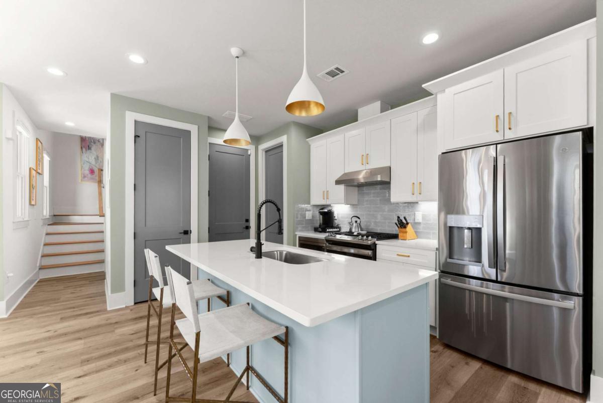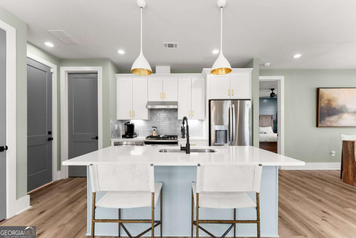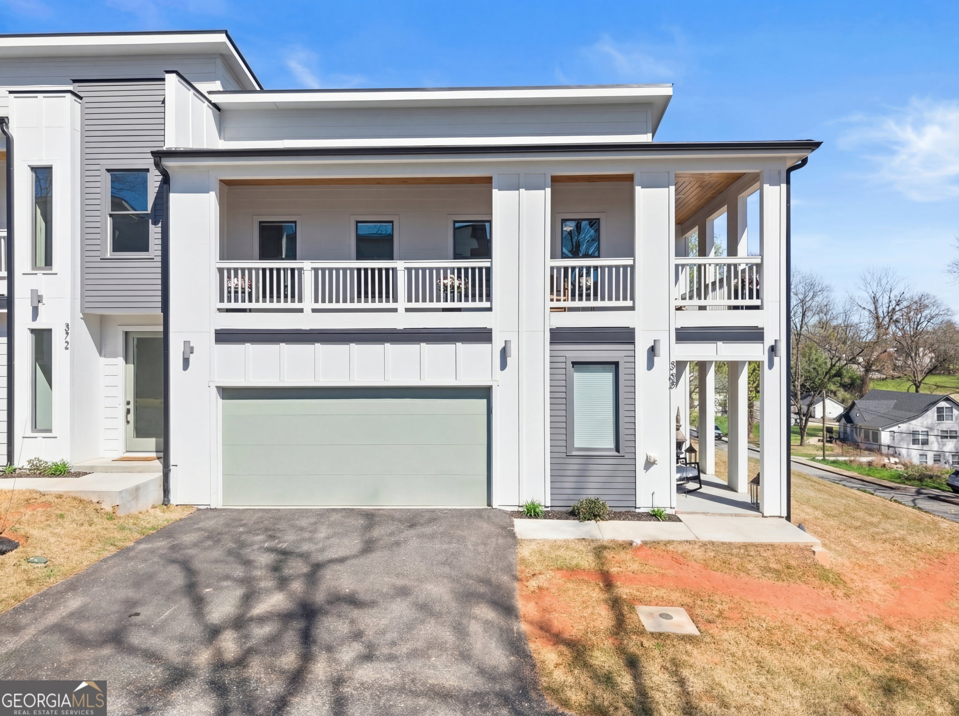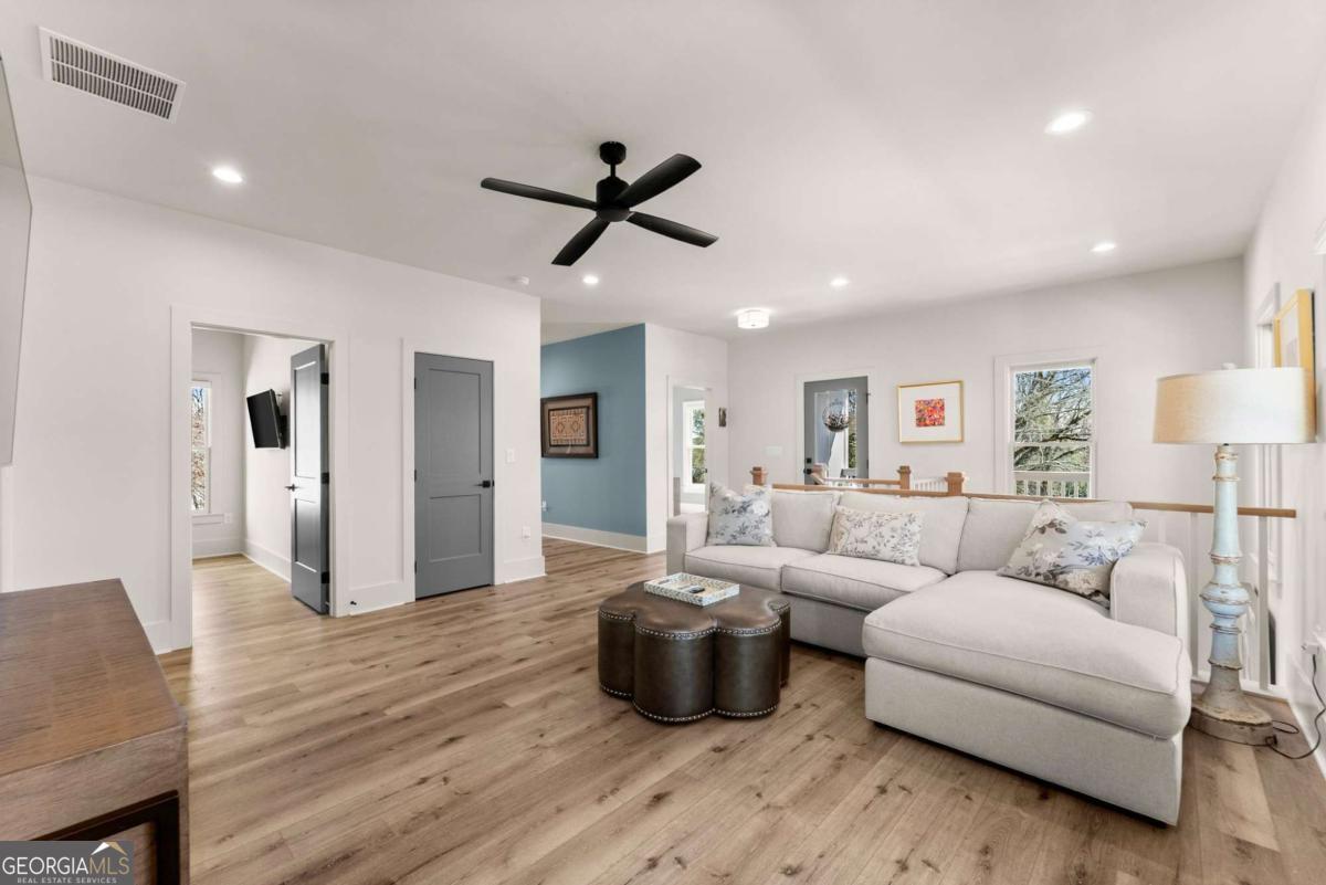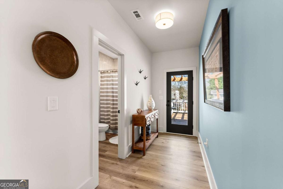 Rare primary-on-main townhome with a two-car garage just steps from downtown Gainesville's shops, restaurants, and coffee spots. This end-unit offers exceptional walkability for city living and low-maintenance comfort. Inside, soaring 10-foot ceilings, upgraded lighting, and LVP flooring throughout (no carpet) create a bright, modern feel. The open-concept kitchen features quartz countertops, a generous island, stainless steel appliances, and abundant cabinetry, making everyday living and entertaining effortless. The main-level primary suite provides privacy and convenience with a walk-in closet, double quartz vanity, and a beautifully tiled shower with a frameless glass door. Upstairs offers flexibility rarely found in townhomes with two additional bedrooms and an expansive loft that easily functions as a second living room, office, or media space. Outdoor living truly sets this home apart with multiple porches and decks, including a pergola-covered upper deck and three covered side porches-perfect for morning coffee, evening gatherings, or simply enjoying the outdoors. A fenced backyard adds privacy and usability. End unit - Primary on main - Walkable downtown location. Surprising storage and refreshing outdoor living. An impressive opportunity for easy living in one of Gainesville's most convenient locations.