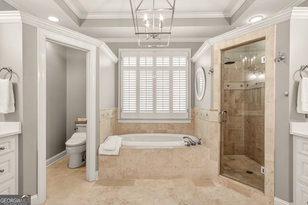 - Interior FeaturesBookcases, Double Vanity, High Ceilings, Pulldown Attic Stairs, Separate Shower, Tile Bath, Tray Ceiling(s), Vaulted Ceiling(s), Walk-In Closet(s), Whirlpool Bath