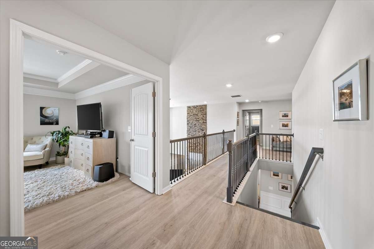 This extraordinary estate at 3202 Garden Hill Lane is the pinnacle of refined recreational living, where master-class craftsmanship meets a lifestyle of elite, active leisure. Every detail has been meticulously curated to captivate the most discerning resident, offering a residence that is as much a private sanctuary as it is a premier social venue. The residence unfolds with a sense of awe-inspiring scale and impeccable style, beginning with a radiant great room that serves as the heart of the home. This soaring, two-story sanctuary is anchored by a floor-to-ceiling stacked-stone fireplace, 12 feet plus ceilings in the living room, while massive, expansive windows wrap the living areas, inviting endless natural light to flow throughout. The professional-grade kitchen is an epicurean masterpiece, complete with a sleek island, high-end stainless steel appliances, and a massive, boutique-organized walk-in pantry that defines functional elegance. The primary retreat offers a secluded wing featuring tray ceilings, a spa-inspired bath with an oversized glass-enclosed shower, and a custom-milled dressing room that serves as a private gallery for your finest attire. Throughout the home, cultivated social spaces provide the perfect setting for both entertaining and relaxation, from the formal dining room with intricate coffered ceilings to a chic private lounge designed for quiet evenings. The transition to the outdoors is a masterclass in seclusion and serenity. A sparkling in-ground saltwater pool serves as the centerpiece of a vast, pristine stone-tile terrace, all set against a tranquil, wooded backdrop. The fully fenced backyard ensures your personal paradise remains a secure and intimate retreat for both relaxation and play. An all-season veranda, complete with integrated heating and ceiling fans, allows you to enjoy the quiet beauty of your private woods regardless of the time of year. Beyond the home, the lifestyle is further elevated by the premier amenities of the Garden Hill community. Residents enjoy championship-level athletics with professional-grade, lighted tennis and pickleball courts designed for high-performance play at any hour. A state-of-the-art fitness center offers a boutique gym experience with advanced cardio and strength-training equipment, while social connectivity thrives through access to a grand clubhouse, a designer fire pit lounge for evening gatherings, and a secondary neighborhood pool. The community is further enhanced by its natural artistry, featuring manicured greenways, stone-lined creeks, and cascading waterfalls that create an atmosphere of quiet luxury. This is not simply a home; it is an alluring environment for those who demand a life of effortless grace, wellness, and prestige.
