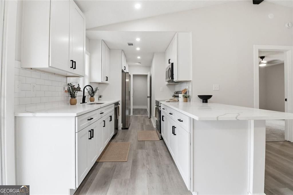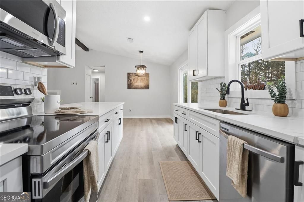 Welcome to 6075 Sumter Drive in Douglasville, this is a fully renovated, move-in ready home located in a thriving and established community. This beautifully updated 3-bedroom, 2 full bath home has a lot to offer. Nearly everything is new, providing the feel of new construction with the charm of an established neighborhood. Fresh interior and exterior paint, brand-new flooring throughout, and modern fixtures that create a clean, cohesive look. The completely renovated kitchen features new cabinetry, a new stove, microwave, sink, and refrigerator, all complemented by stunning quartz countertops with bold, oversized veining that adds a sophisticated touch. Both bathrooms have been fully updated with stylish finishes, including beautifully tiled showers that bring a spa-like feel to the home. Major improvements include a brand-new shingles, and an extended driveway offering additional parking and convenience. This home offers the perfect combination of modern upgrades, functional layout, and low-maintenance living. Whether you're a first-time buyer, downsizing, or looking for a turnkey investment opportunity, this property checks all the boxes. Turnkey, low-maintenance, and ready for its next owner schedule your showing today.