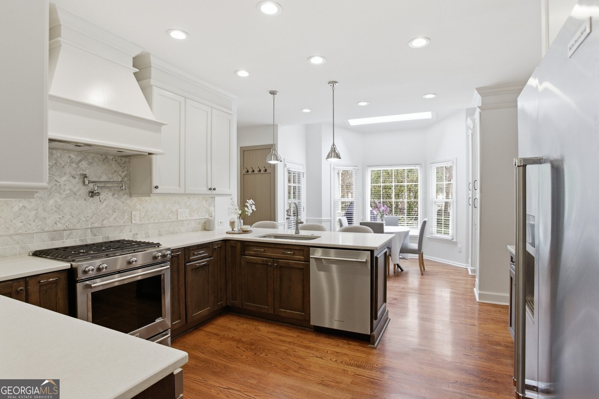 Set on a beautifully landscaped lot in one of East Cobb's most sought-after swim/tennis communities, this elegant home offers timeless curb appeal with three sides of brick and Hardiplank siding at the rear, plus a side-entry garage with an electric car charger. Inside, a grand two-story foyer opens to a bright, flowing floorplan ideal for everyday living and entertaining. The professionally designed chef's kitchen by Platinum Kitchens features quartz countertops, a gas range with warming drawer, pot filler, microwave drawer, custom pullouts, spice drawers, and additional breakfast area cabinetry. The main level also showcases hardwood floors, 9-foot ceilings, detailed moldings, formal living and dining rooms, and a fireside family room with a wall of windows. Upstairs, all bedrooms are thoughtfully arranged, including a spacious primary suite, generous secondary bedrooms, an updated Jack-and-Jill bath with dual private vanities, and an oversized fourth bedroom that can serve as a bonus room. The finished basement offers a large recreation room with a brick fireplace, full bath, and unfinished space ready for a home office or gym. Outdoor living includes a screened porch overlooking a private fenced backyard, along with a deck and stone patio perfect for gatherings. Recent updates include a newer HVAC system, 3-year-old roof, new windows, all-new plumbing, spray foam attic insulation, and WiFi thermostats. Located in a premier East Cobb community with swim, tennis, and a pavilion, and zoned for Tritt Elementary, Hightower Trail Middle, and Pope High.