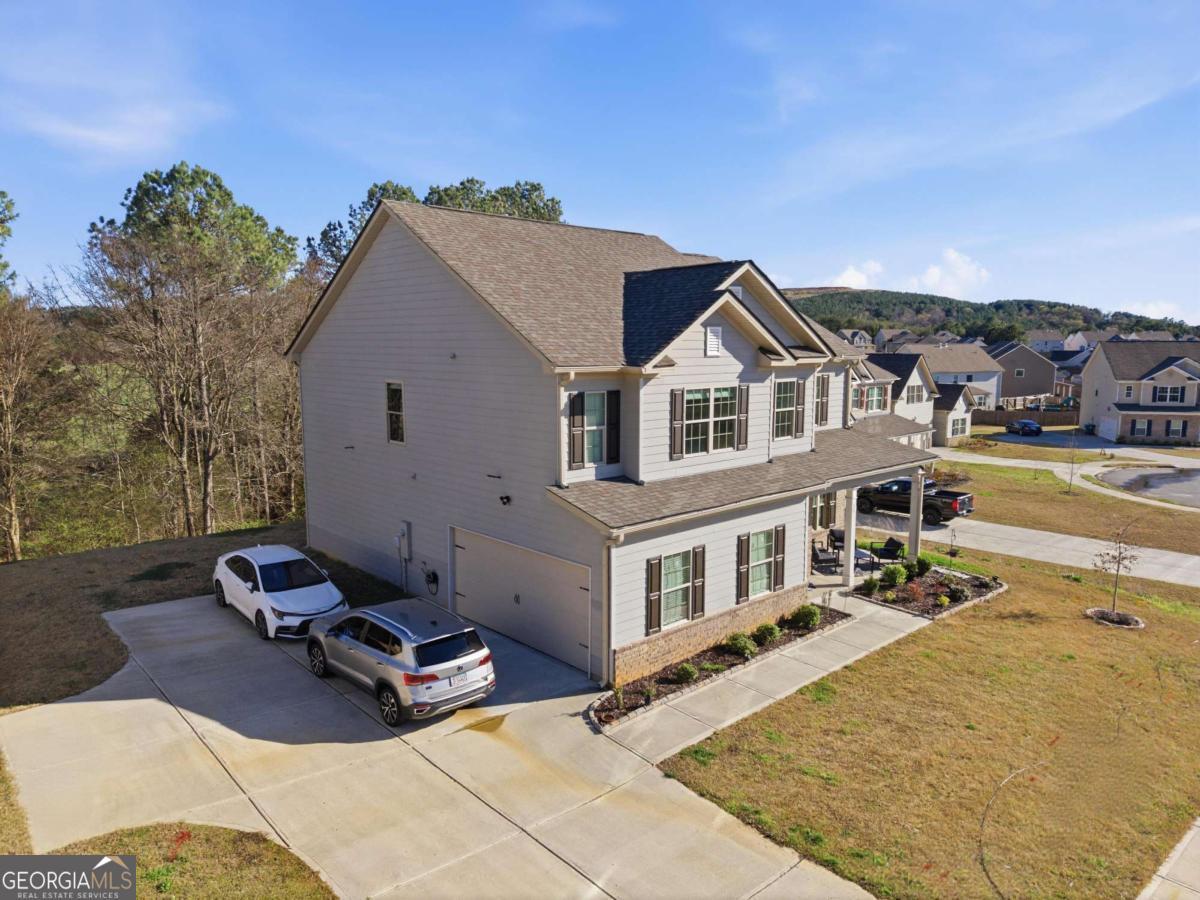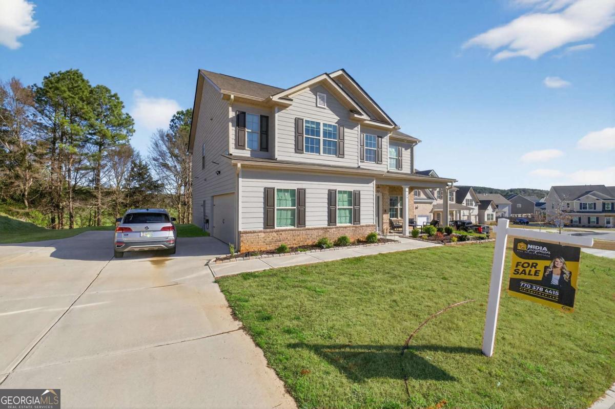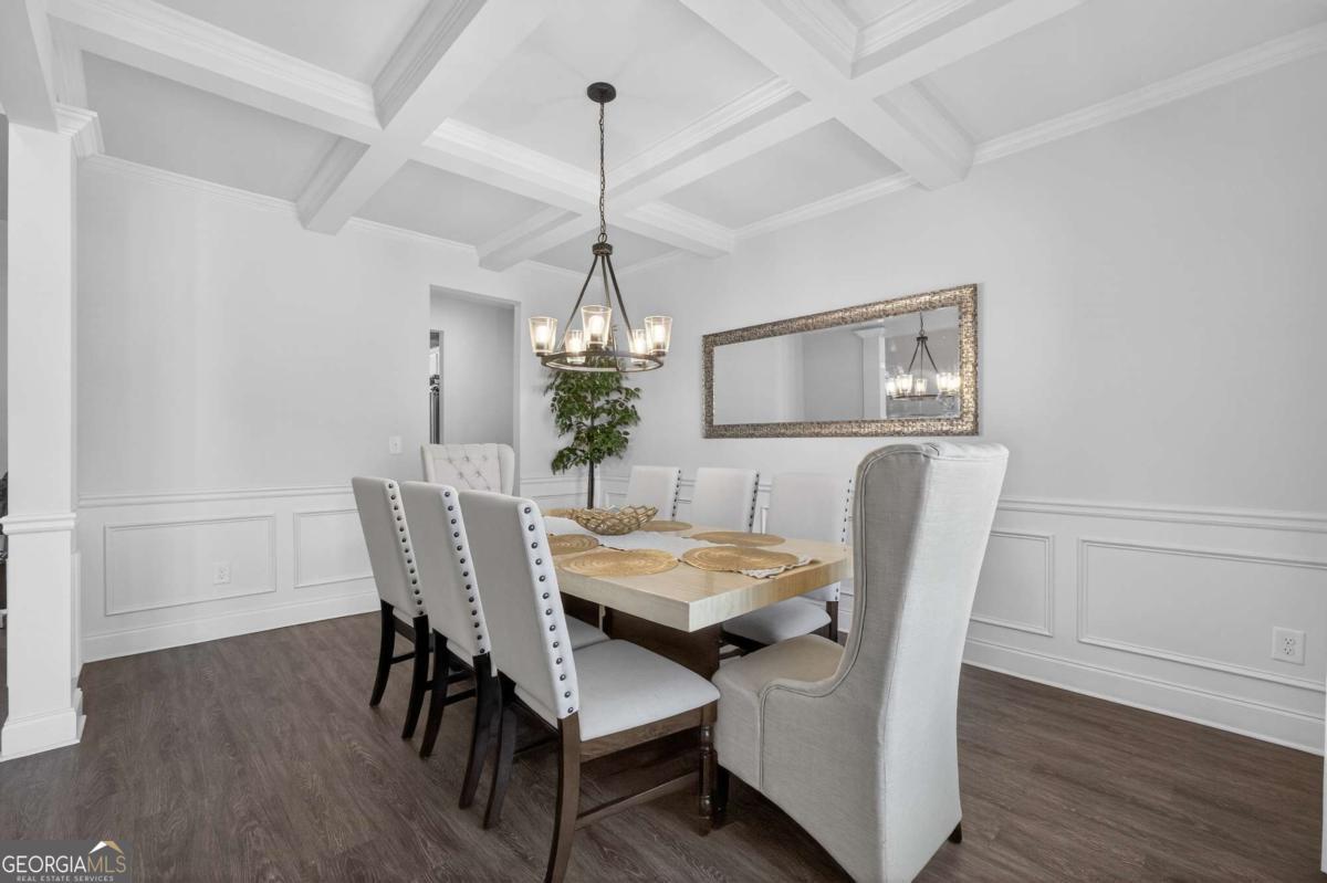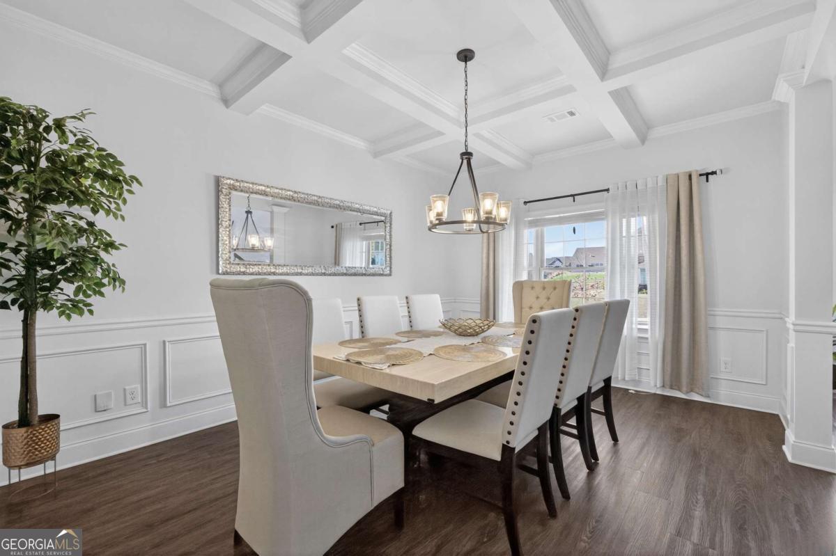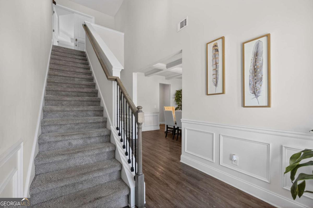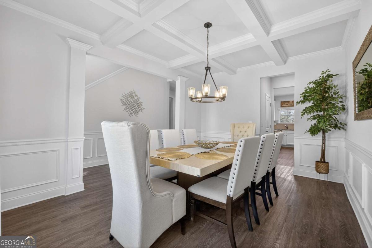 Beautifully appointed two-story home nestled against a serene wooded backdrop, offering standout curb appeal with a covered front porch, brick accents, and a wide concrete driveway. Step inside to a dramatic two-story foyer that immediately impresses with soaring ceilings, elegant wainscoting, rich luxury vinyl plank flooring, and a sweeping staircase featuring iron balusters and a wood handrail. From the moment you enter, the attention to detail and thoughtful design are evident throughout. Just off the foyer, the formal dining room is an entertainer's dream, showcasing a stunning coffered ceiling, decorative trim work, a statement chandelier, and generous natural light the perfect setting for holiday gatherings and dinner parties alike. The open main living area flows seamlessly from room to room, anchored by a classic fireplace with a white surround and an abundance of natural light streaming through multiple windows. A rear door provides direct access to the covered back patio, creating a natural indoor-outdoor connection ideal for relaxing or entertaining. The kitchen is both stylish and functional, featuring crisp white cabinetry, dark speckled granite countertops, a large center island with bar seating, stainless steel appliances including a dishwasher and French door refrigerator, a subway tile backsplash, and contemporary pendant lighting overhead. Upstairs, the oversized primary suite is a true retreat, boasting a dramatic tray ceiling, ceiling fan, plush carpet, and an abundance of space for a full furniture arrangement. The spa-like ensuite bath is equally impressive, offering a double vanity with white cabinetry and quartz-style countertops, modern light fixtures, a soaking tub with tile surround, a separate glass-enclosed tiled shower, and tile flooring throughout. The secondary bedrooms are generously sized, each with plush carpet, ceiling fans, and ample closet space ideal for family, guests, or a home office setup. A well-appointed secondary bath with modern fixtures and a clean, neutral palette serves these rooms with ease. Out back, enjoy the covered patio overlooking a grassy yard with a peaceful wooded buffer offering privacy and a connection to nature that's hard to find. Whether you're hosting a cookout or simply unwinding after a long day, this outdoor space delivers. With its impressive entry, upscale finishes, functional floorplan, and tranquil setting, this home checks every box. Come see it for yourself it won't last long.
