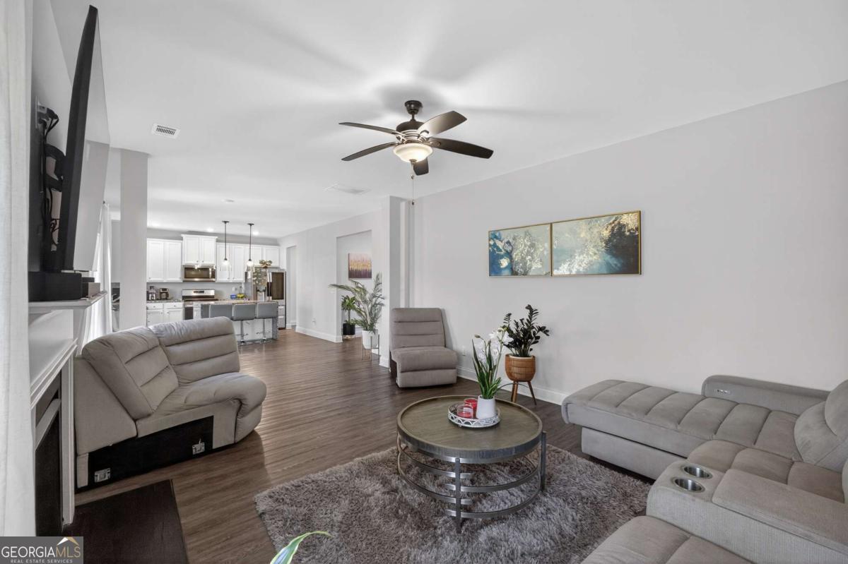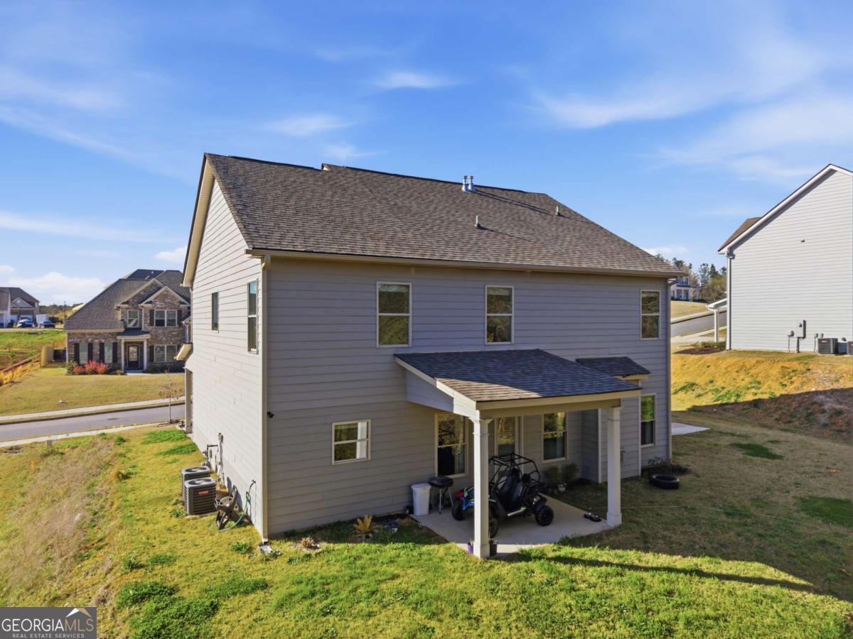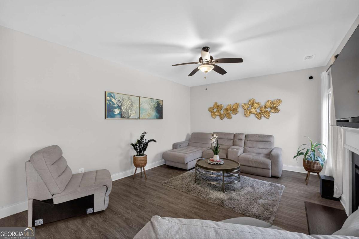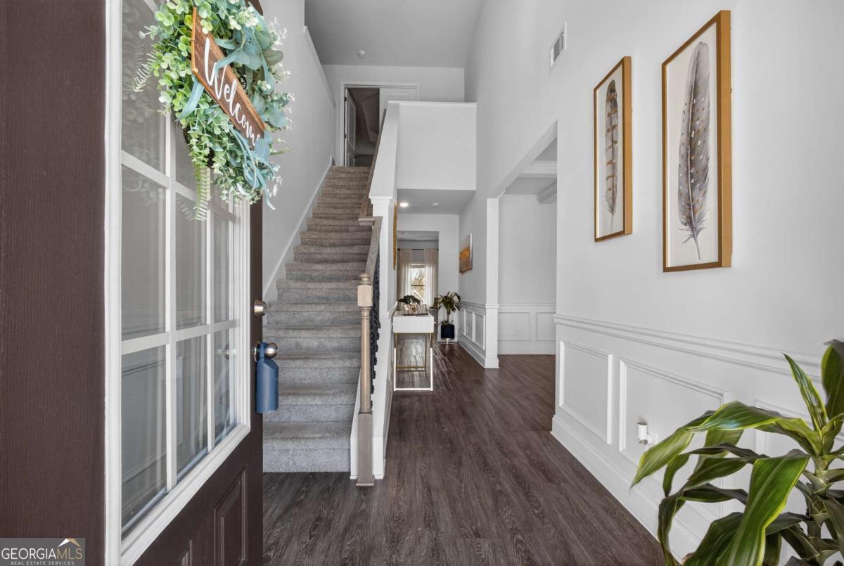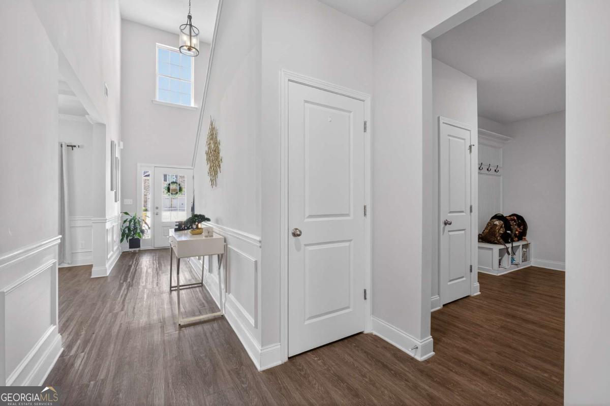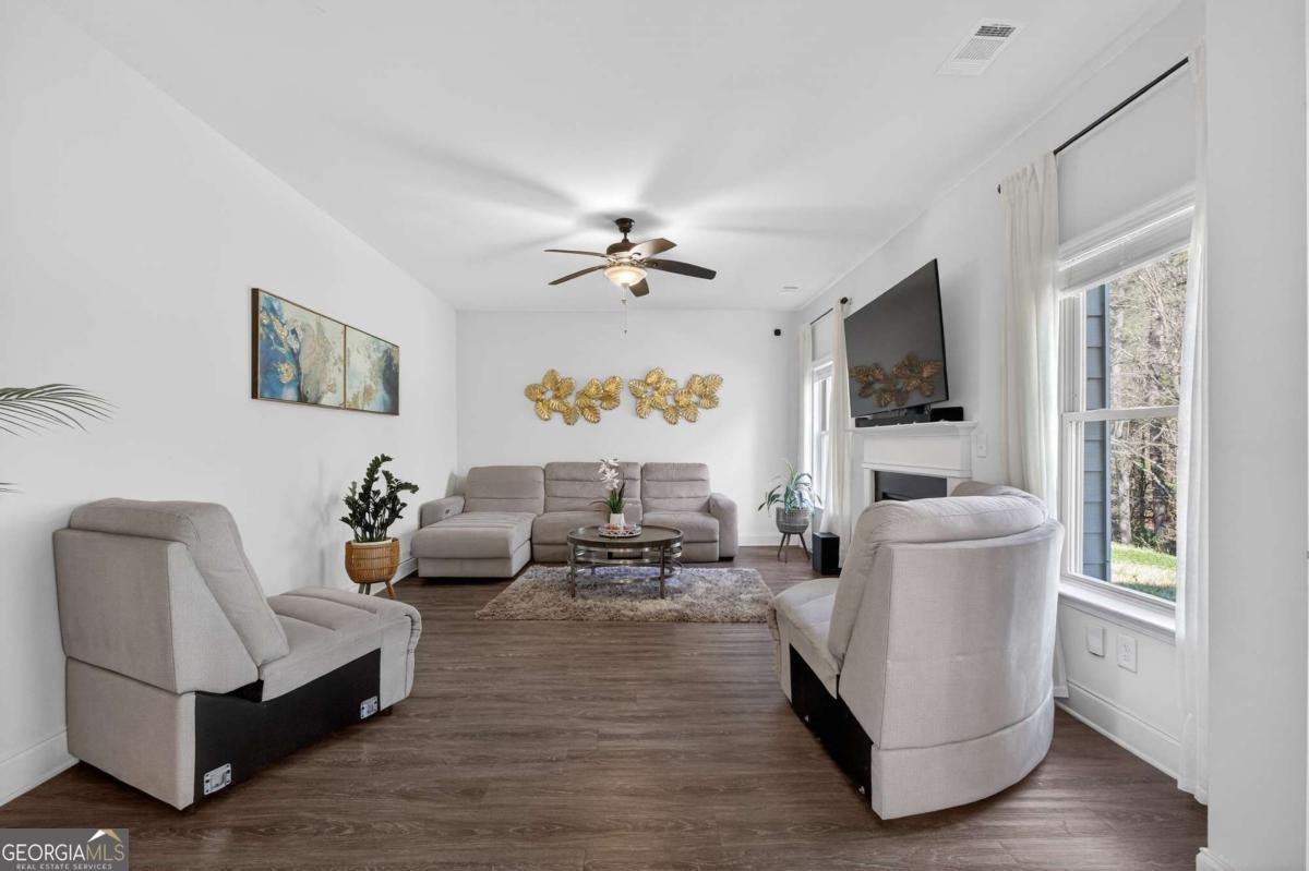 Beautifully appointed two-story home nestled against a serene wooded backdrop, offering standout curb appeal with a covered front porch, brick accents, and a wide concrete driveway. Step inside to a dramatic two-story foyer that immediately impresses with soaring ceilings, elegant wainscoting, rich luxury vinyl plank flooring, and a sweeping staircase featuring iron balusters and a wood handrail. From the moment you enter, the attention to detail and thoughtful design are evident throughout. Just off the foyer, the formal dining room is an entertainer's dream, showcasing a stunning coffered ceiling, decorative trim work, a statement chandelier, and generous natural light the perfect setting for holiday gatherings and dinner parties alike. The open main living area flows seamlessly from room to room, anchored by a classic fireplace with a white surround and an abundance of natural light streaming through multiple windows. A rear door provides direct access to the covered back patio, creating a natural indoor-outdoor connection ideal for relaxing or entertaining. The kitchen is both stylish and functional, featuring crisp white cabinetry, dark speckled granite countertops, a large center island with bar seating, stainless steel appliances including a dishwasher and French door refrigerator, a subway tile backsplash, and contemporary pendant lighting overhead. Upstairs, the oversized primary suite is a true retreat, boasting a dramatic tray ceiling, ceiling fan, plush carpet, and an abundance of space for a full furniture arrangement. The spa-like ensuite bath is equally impressive, offering a double vanity with white cabinetry and quartz-style countertops, modern light fixtures, a soaking tub with tile surround, a separate glass-enclosed tiled shower, and tile flooring throughout. The secondary bedrooms are generously sized, each with plush carpet, ceiling fans, and ample closet space ideal for family, guests, or a home office setup. A well-appointed secondary bath with modern fixtures and a clean, neutral palette serves these rooms with ease. Out back, enjoy the covered patio overlooking a grassy yard with a peaceful wooded buffer offering privacy and a connection to nature that's hard to find. Whether you're hosting a cookout or simply unwinding after a long day, this outdoor space delivers. With its impressive entry, upscale finishes, functional floorplan, and tranquil setting, this home checks every box. Come see it for yourself it won't last long.