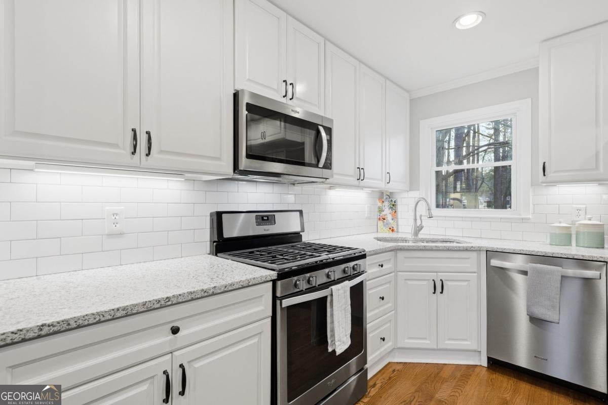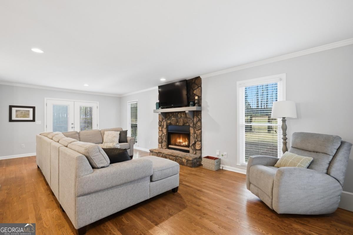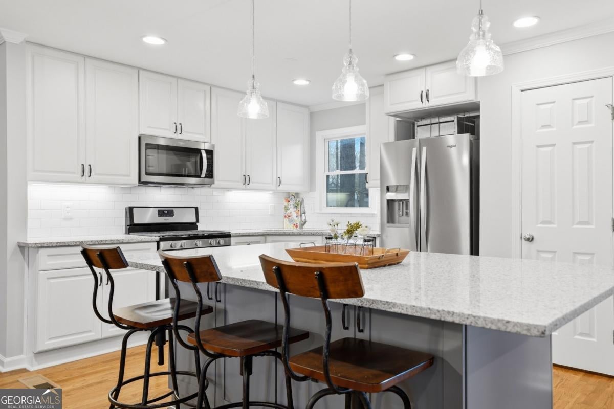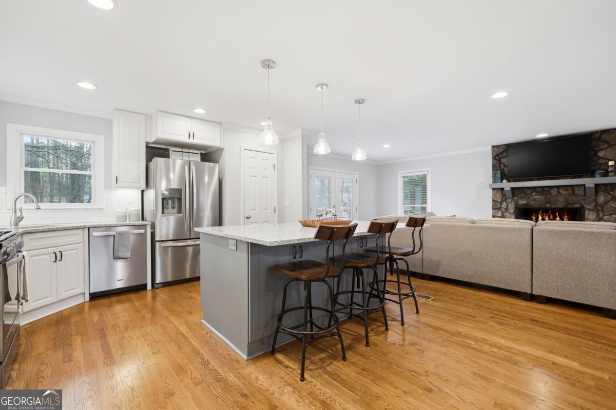 Welcome to this charming raised ranch-style home on a finished basement in Acworth-with no HOA! This beautifully updated 3-bedroom, 3-bath residence offers exceptional curb appeal from the moment you arrive. A long, welcoming driveway leads to a well-setback home and provides ample additional parking-perfect for multiple vehicles or even a recreational vehicle. The exterior features a brand-new architectural roof, updated windows, and newer 6" gutters and downspouts, offering both peace of mind and enhanced curb appeal. The inviting screened front porch overlooks the picturesque front yard-an ideal spot to enjoy your morning coffee. Inside, you'll find an open-concept layout highlighted by a modernized island kitchen featuring 42" white cabinetry that extends to the ceiling, a classic subway tile backsplash, and beautiful solid surface countertops-all overlooking a cozy family room with a stunning stacked stone fireplace. The main living areas showcase gleaming site-finished hardwood floors, complemented by fresh interior paint, recessed lighting, and updated fixtures that create a bright and welcoming atmosphere. Step outside to the oversized rear deck, conveniently located just off the kitchen-perfect for entertaining or simply relaxing while taking in the peaceful views of your expansive 3/4-acre lot. The primary suite offers a private retreat with a fully updated ensuite bathroom featuring an intricately tiled tub surround, double vanity, and solid surface countertops. Additional bedrooms are generously sized and share a beautifully updated hall bath on the main level. Downstairs, the fully finished basement provides valuable flex space, including a private office and full bathroom-ideal for remote work, guests, or a potential in-law suite. Conveniently located near top-rated schools, shopping, dining, and easy access to I-575, this home offers the perfect blend of comfort, functionality, and location. This is one you don't want to miss.