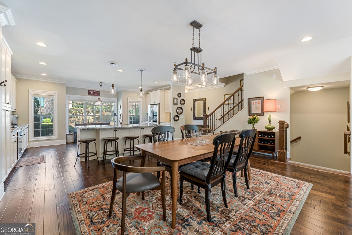 Welcome to 10705 Arlington Point, a beautifully maintained townhouse in a quiet community nestled beside one of Johns Creek's last remaining horse farms. Ideally located off Morton Road, this home offers excellent walkability to the new neighborhood pocket park and convenient access to both GA-400 and Peachtree Parkway (141). The community also offers excellent rental potential with no rental restrictions. The main level features wide-plank engineered hardwood floors and an open-concept layout designed for comfortable living and entertaining. The oversized chef's kitchen is the centerpiece of the home, featuring granite countertops, stainless steel appliances, abundant cabinetry, breakfast nook, and a large island with breakfast bar seating. An elegant dining area seamlessly connects the kitchen to the spacious family room, complete with a fireplace flanked by custom built-in bookcases. French doors open to a large private deck overlooking the horse farm, offering peaceful views and a unique sense of privacy rarely found in townhome living. Just behind the living room is a thoughtfully designed built-in office nook, perfect for working from home. Hardwood stairs lead to the second level where the engineered hardwoods continue through the hallway. The primary suite features trey ceilings, space for a sitting area, and serene views through a wall of windows. The primary bathroom includes double vanities with quartz countertops, a separate garden tub and shower, and a spacious walk-in closet. Two additional bedrooms and a full hall bathroom completes the upper level. The terrace level provides a fourth bedroom with a full bathroom and large walk-in closet, making it ideal for guests, a private office, or flexible living space. The rear-entry garage offers ample additional storage. This well-appointed townhouse combines peaceful surroundings, modern finishes, and an unbeatable Johns Creek location.