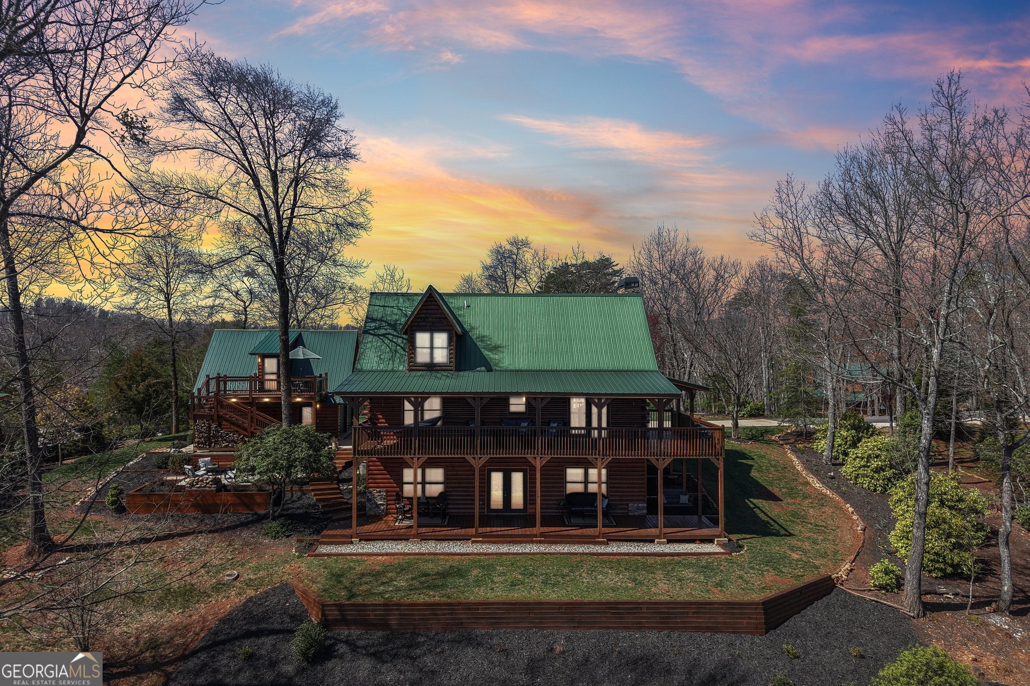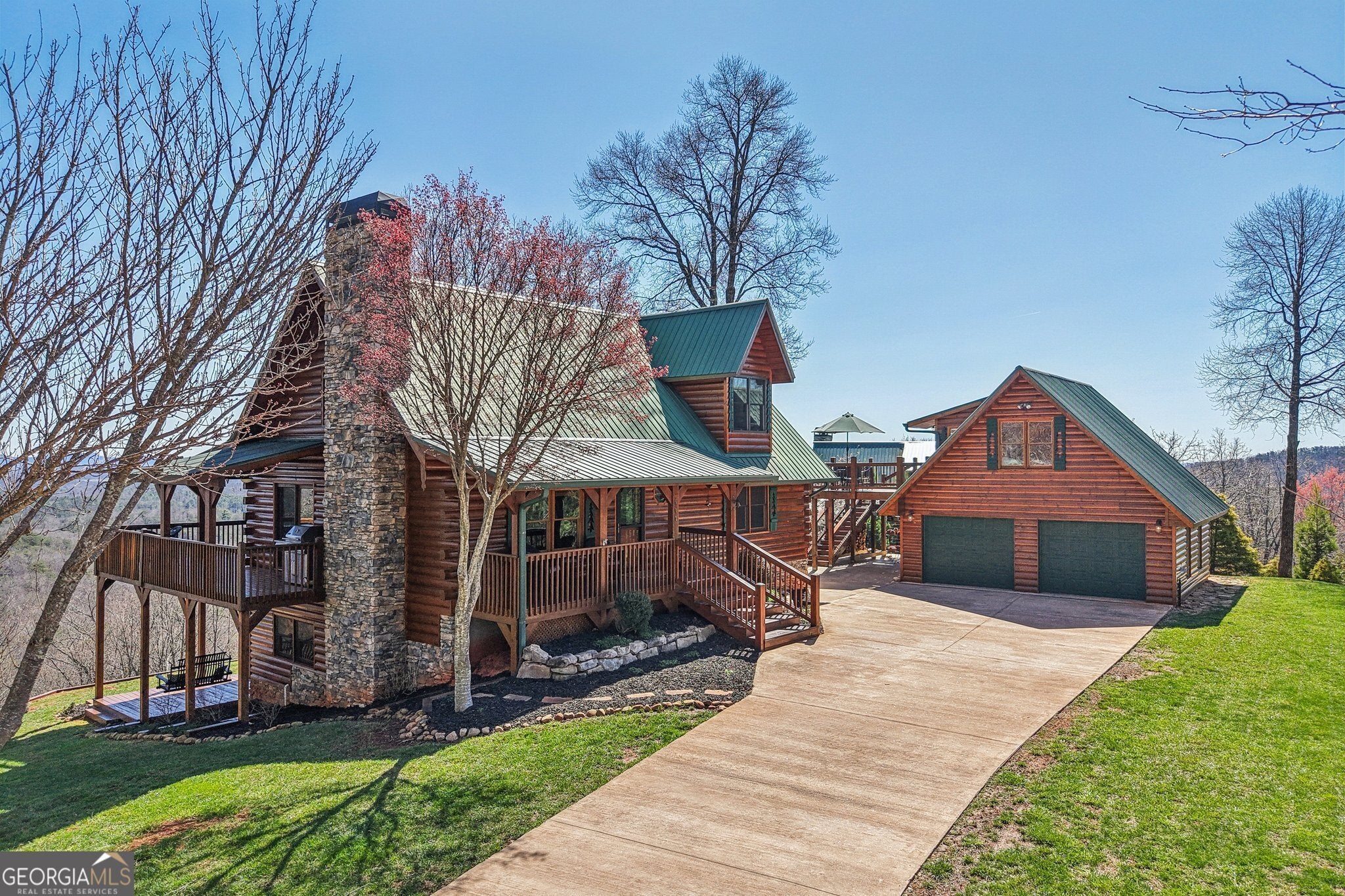Welcome to 503 Ranch Mountain Drive, Dahlonega, GA - a stunning luxury log cabin in the North Georgia mountains offering the rare combination of expansive mountain views, authentic log home craftsmanship, and flexible living space ideal for a private retreat, second home, or income-producing mountain getaway. A large portion of the property features a level lot - a rare and highly desirable feature in the mountains - providing ample space for parking and plenty of room for outdoor activities and entertaining, while the surrounding nature areas offer additional privacy and a true mountain setting. Set in the highly sought-after gated Trahlyta Estate subdivision, this beautifully maintained North Georgia 4 bedroom, 4 bathroom log home offers sweeping mountain views from every angle, creating the peaceful setting buyers dream of when searching for a Dahlonega mountain cabin or luxury log home in North Georgia. Inside, the home blends rustic mountain character with thoughtful updates, including hardwood flooring, granite countertops, and an updated bathroom. The warm lodge-style interior is anchored by gas log fireplaces on both the upper and lower levels, creating inviting living spaces perfect for relaxing after a day exploring Dahlonega's wineries, hiking trails, and mountain towns. Outdoor living is where this property truly shines. Multiple furnished porch seating areas and a custom outdoor fireplace provide ideal spaces to enjoy the long-range mountain views, entertain guests, or simply unwind in the fresh North Georgia mountain air. One of the standout features of the property is the separate living area above the garage with its own private deck, offering additional flexibility rarely found in mountain cabins. This space is perfect for guest quarters, an in-law suite, a private office, or an additional sleeping area for short-term rental guests, making the property especially attractive for buyers seeking a Dahlonega Airbnb cabin or income-producing North Georgia mountain retreat. Additional upgrades include mini-split HVAC systems in the loft and garage living area, a whole-home water filtration system, landscaped grounds, and a concrete driveway for easy access. The home is also offered fully furnished, creating a true turn-key mountain cabin experience. Located just minutes from historic downtown Dahlonega, award-winning wineries, hiking, waterfalls, and the Appalachian foothills, this property offers the ideal balance of privacy and accessibility in one of the most desirable mountain destinations in North Georgia. Whether you're searching for a luxury log cabin in Dahlonega, a North Georgia mountain home with views, or a high-performing short-term rental cabin investment, 503 Ranch Mountain Drive delivers the mountain lifestyle buyers are looking for. Disclaimer: All information deemed reliable but not guaranteed and should be independently verified. Photos & lot lines may be virtually staged to assist buyers in visualizing the property's potential. Contact the listing agent for more information or to schedule a private showing.