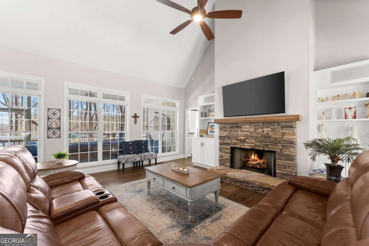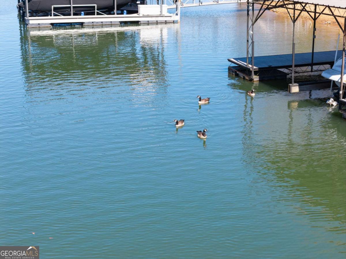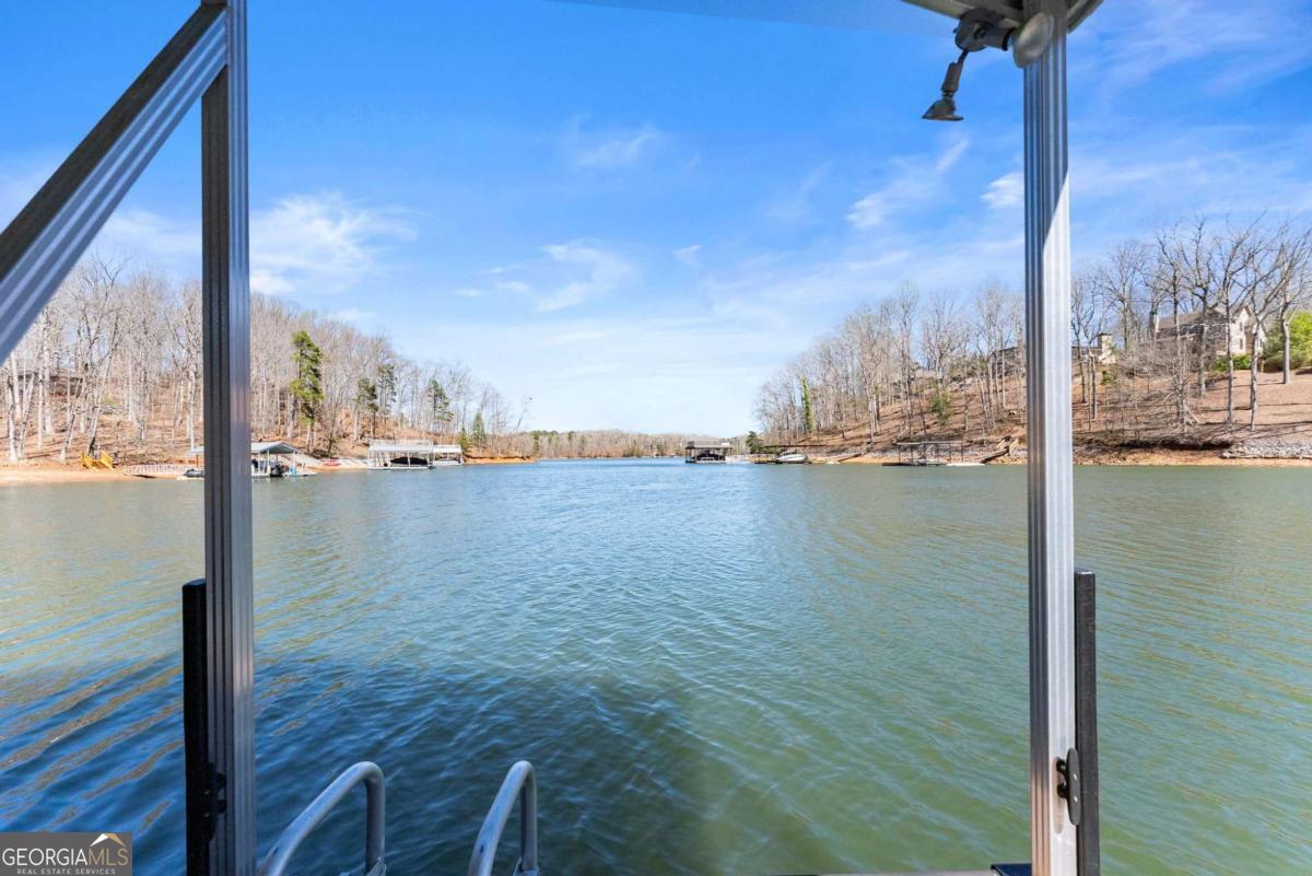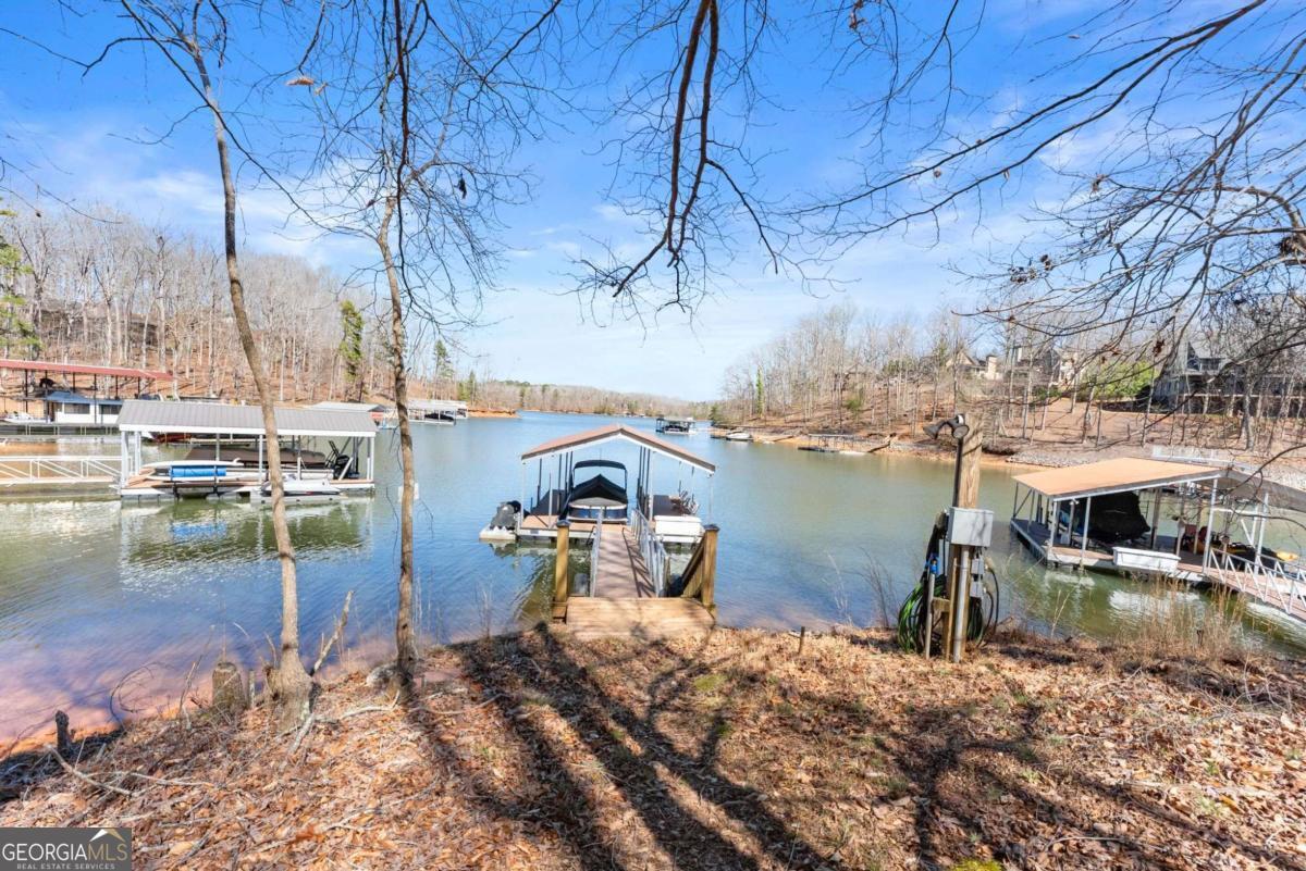 Positioned on nearly an acre with over 100 feet of Lake Lanier shoreline in Forsyth County, this ranch home offers a flat path and easy cart ride to a custom, deep-water, single-slip dock. The layout is open and comfortable - vaulted ceilings, a fireplace with a hand-hewn cypress mantle, built-in bookcases, and real hardwood floors that have earned their place. Floor-to-ceiling windows pull in natural light and frame lake views from nearly every room. The primary suite is on the main level and includes a flexible bonus space that works well as an office, sitting room, or additional closet. A separate dining room and a generous laundry room with a full bath sit just off the ramped side entrance - practical details that make everyday living easier. The finished terrace level adds two ensuite bedrooms, a large family room with a wood-burning stove, a workshop, and dedicated golf cart storage. Outside, a screened porch, lower paver patio, and established garden area make it easy to spend time outdoors whether you're unwinding or having people over. No HOA. Recent updates include a new roof, fresh interior and exterior paint, an updated HVAC system and water heater, and a central vacuum system - a home that's been well cared for and is genuinely ready to move into.