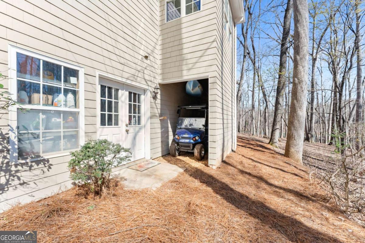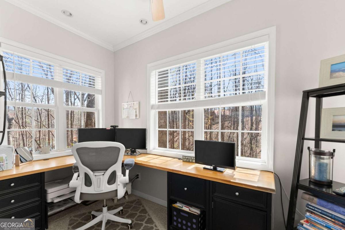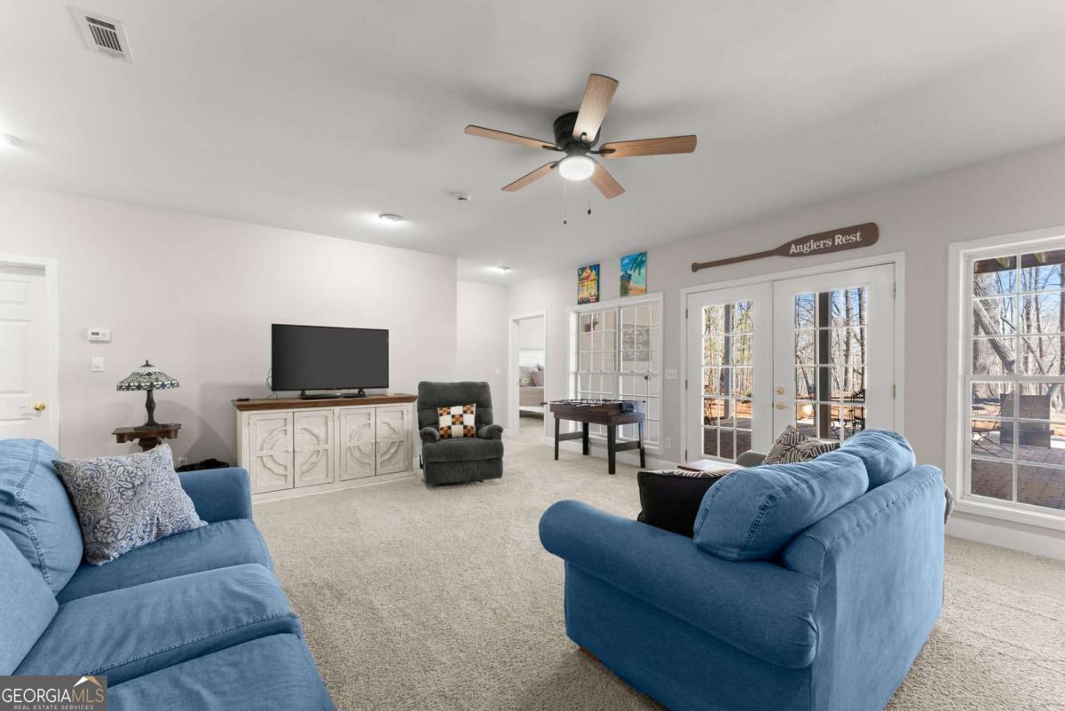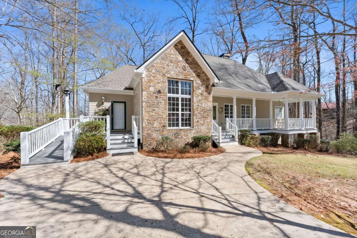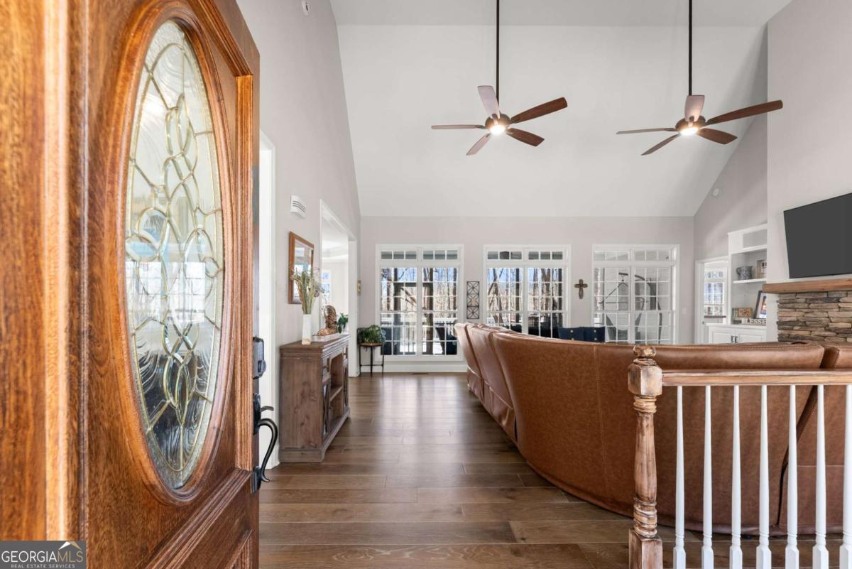 Positioned on nearly an acre with over 100 feet of Lake Lanier shoreline in Forsyth County, this ranch home offers a flat path and easy cart ride to a custom, deep-water, single-slip dock. The layout is open and comfortable - vaulted ceilings, a fireplace with a hand-hewn cypress mantle, built-in bookcases, and real hardwood floors that have earned their place. Floor-to-ceiling windows pull in natural light and frame lake views from nearly every room. The primary suite is on the main level and includes a flexible bonus space that works well as an office, sitting room, or additional closet. A separate dining room and a generous laundry room with a full bath sit just off the ramped side entrance - practical details that make everyday living easier. The finished terrace level adds two ensuite bedrooms, a large family room with a wood-burning stove, a workshop, and dedicated golf cart storage. Outside, a screened porch, lower paver patio, and established garden area make it easy to spend time outdoors whether you're unwinding or having people over. No HOA. Recent updates include a new roof, fresh interior and exterior paint, an updated HVAC system and water heater, and a central vacuum system - a home that's been well cared for and is genuinely ready to move into.