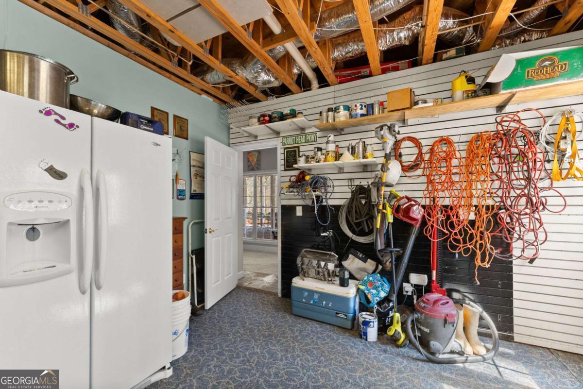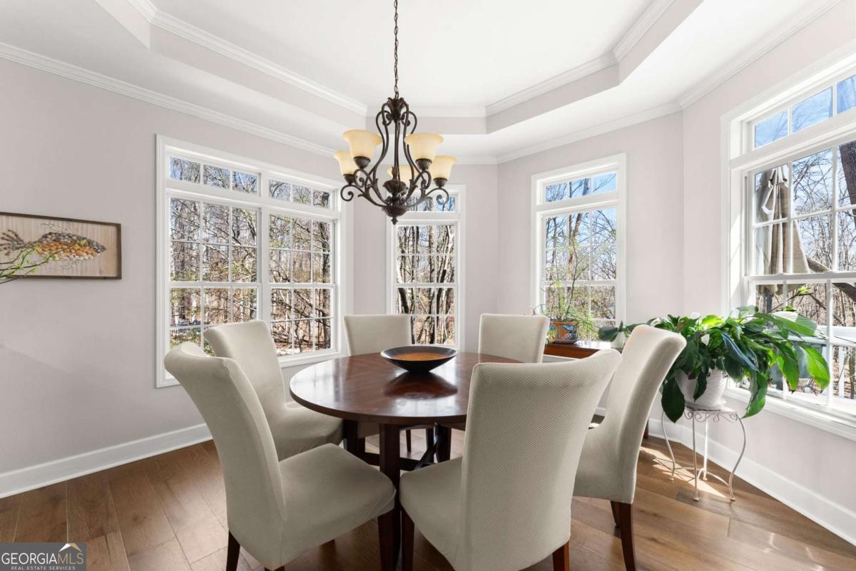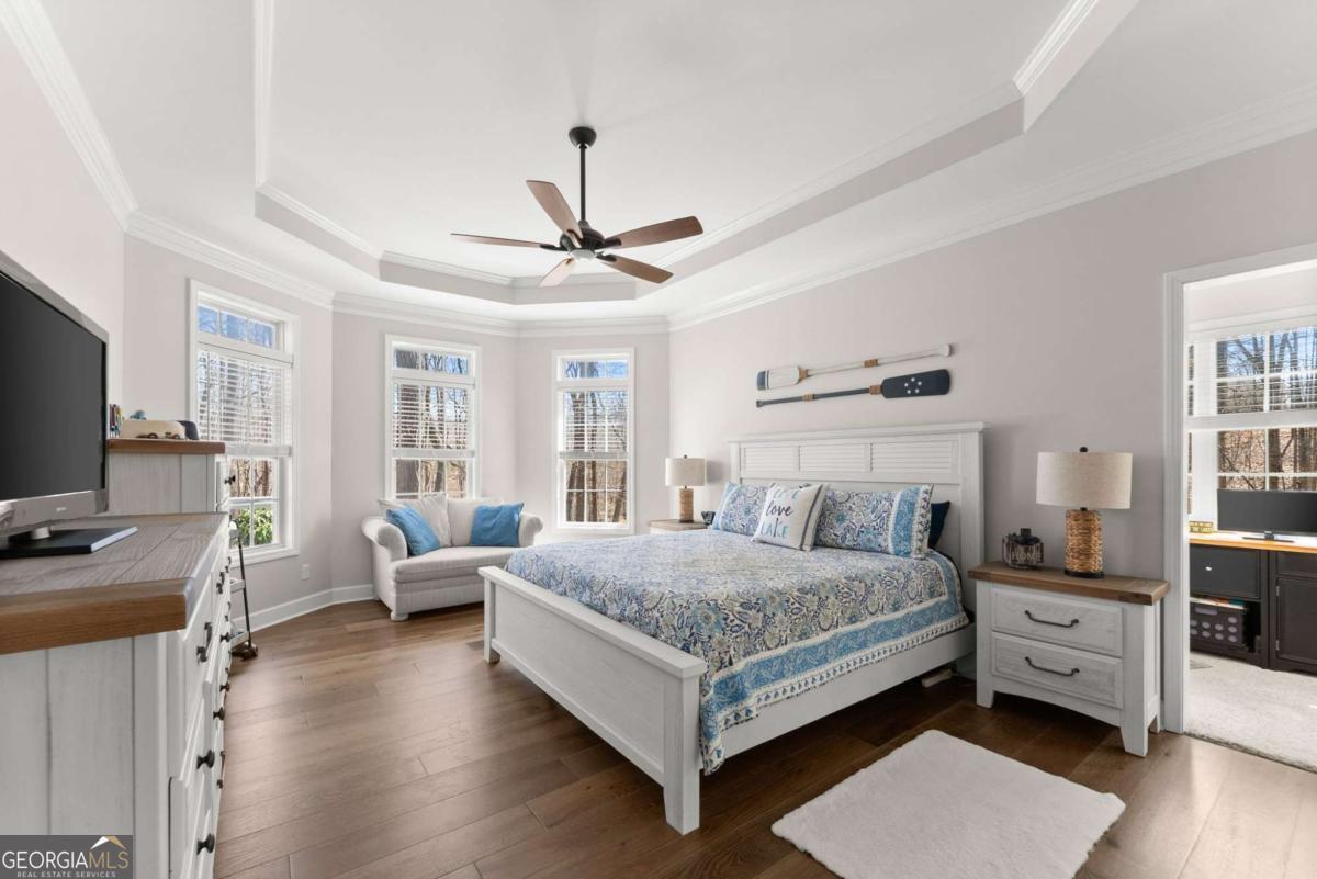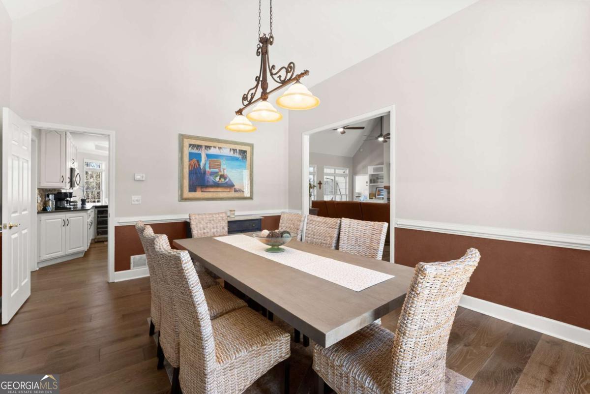 Positioned on nearly an acre with over 100 feet of Lake Lanier shoreline in Forsyth County, this ranch home offers a flat path and easy cart ride to a custom, deep-water, single-slip dock. The layout is open and comfortable - vaulted ceilings, a fireplace with a hand-hewn cypress mantle, built-in bookcases, and real hardwood floors that have earned their place. Floor-to-ceiling windows pull in natural light and frame lake views from nearly every room. The primary suite is on the main level and includes a flexible bonus space that works well as an office, sitting room, or additional closet. A separate dining room and a generous laundry room with a full bath sit just off the ramped side entrance - practical details that make everyday living easier. The finished terrace level adds two ensuite bedrooms, a large family room with a wood-burning stove, a workshop, and dedicated golf cart storage. Outside, a screened porch, lower paver patio, and established garden area make it easy to spend time outdoors whether you're unwinding or having people over. No HOA. Recent updates include a new roof, fresh interior and exterior paint, an updated HVAC system and water heater, and a central vacuum system - a home that's been well cared for and is genuinely ready to move into.