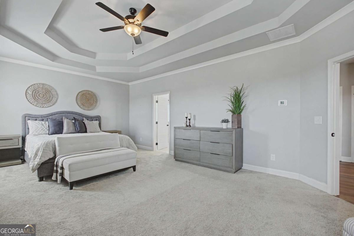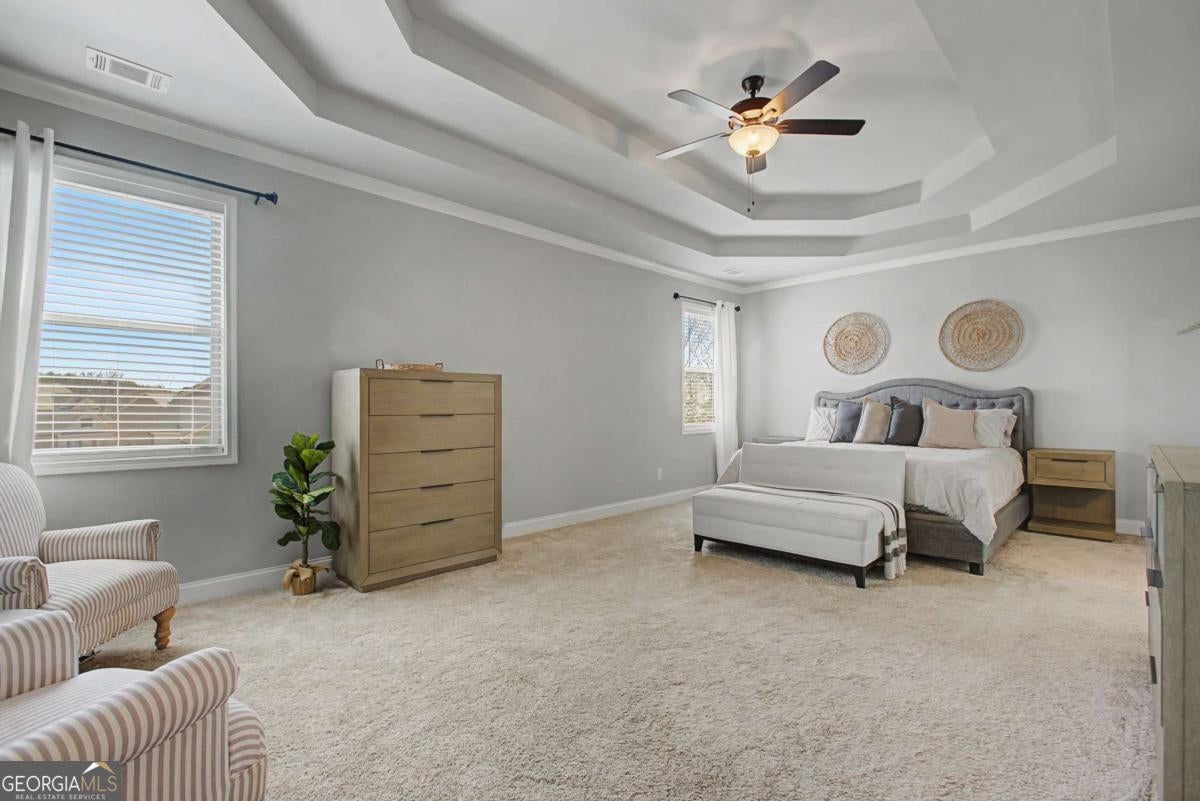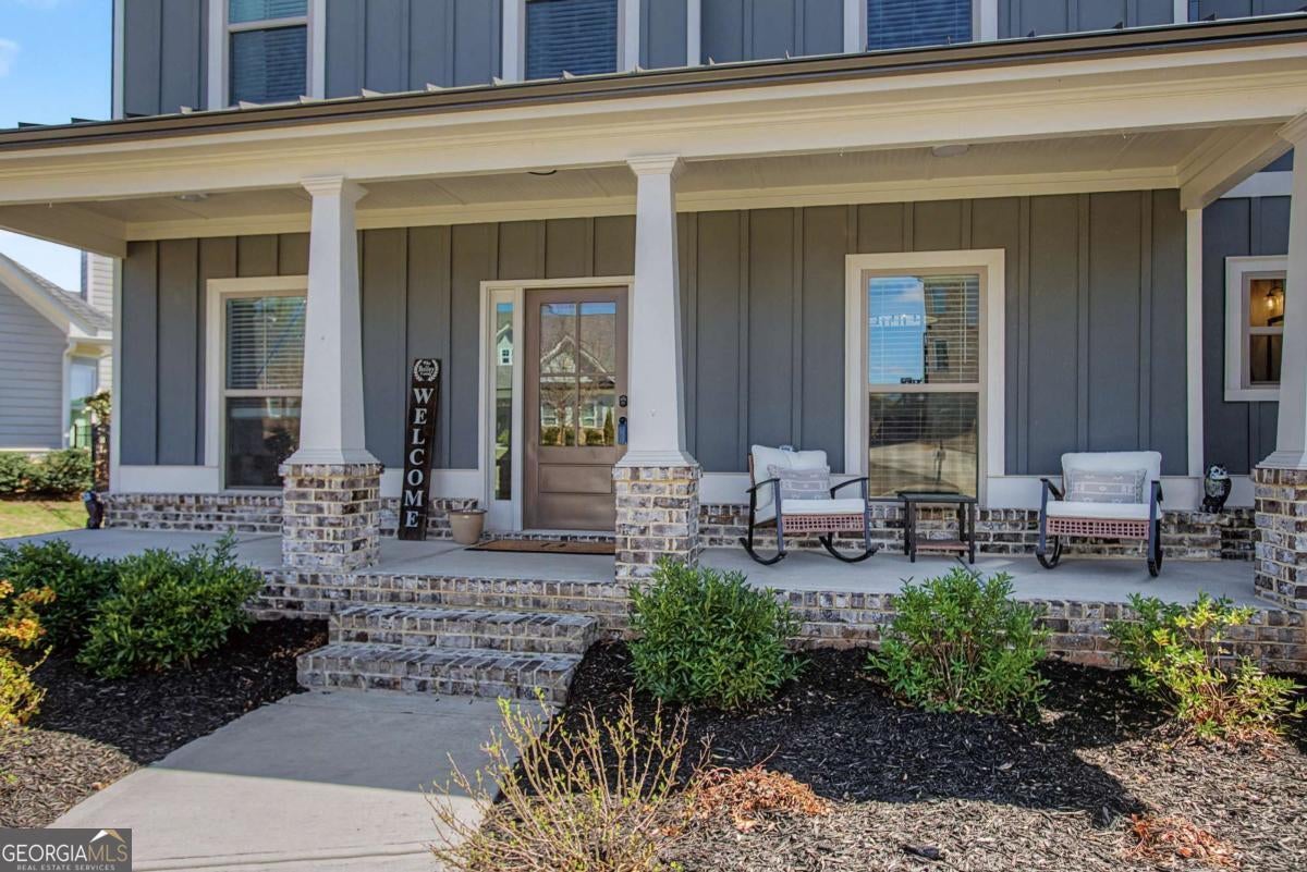 Barely lived in and shows like new, this stunning home is located in the highly sought-after Traditions of Braselton community and offers the benefit of new construction without the wait. Featuring 5 bedrooms, 4.5 bathrooms, a 3-car garage, and an unfinished daylight basement, the layout is both functional and beautifully designed. The main level includes formal living and dining with coffered ceilings, a butler's pantry with space for a beverage or wine fridge, and an open-concept kitchen overlooking both the great room and keeping room. The kitchen is thoughtfully appointed with a large island, pull-out trash, double ovens, gas cooktop, farmhouse sink, and additional cabinetry flanking the cooktop for added storage. A guest suite with a private bath and walk-in shower is located on the main level, along with a separate half bath. There is also a dedicated office featuring a gorgeous sliding door, offering both privacy and style. A drop zone/mud area is located just off the garage. Upstairs features a spacious loft, an additional en-suite bedroom, Jack and Jill bedrooms, and an oversized primary suite. The primary bath includes a tiled walk-in shower, freestanding tub, and a large walk-in closet with excellent natural light and ample storage. Enjoy the covered rear porch complete with a fireplace, overlooking a level backyard with a sunken trampoline-perfect for both relaxing and entertaining. Located in Traditions of Braselton, a golf cart-friendly community known for its resort-style amenities including golf, swim, tennis, clubhouse, and on-site restaurant. Schools are conveniently accessible by golf cart, adding to the ease and lifestyle this community offers.