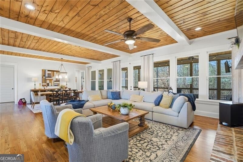 CUSTOM SOUTHERN LIVING FLOOR PLAN IS TRULY MAGAZINE-WORTHY!!! Where to begin? This ranch showstopper, situated on 2+ acres boasts...tongue & groove ceilings with accent beams; stunning hardwoods throughout main level; high-end stainless steel appliances; upgraded quartz countertops; custom backsplash & tile throughout; gorgeous plumbing & light fixtures; custom cabinetry & built-ins throughout; open floor plan with an abundance of natural light! Not to mention--absolutely stunning kitchen with large island, farmhouse sink, custom range hood & under cabinet lighting; spacious primary suite on main level with stunning bath; add'l full bedroom & private full bath; family room with gas log fireplace; open dining/breakfast area; oversized Butler's pantry with add'l beverage fridge; huge walk-in pantry with natural light; laundry room with sink & add'l cabinet space; mudroom with a private "friends porch" entry; adorable powder room; side-entry 3-car garage; plus two water heaters! Upstairs there is an home office area; sitting/reading nook; 2 add'l spare bedrooms with large closets; full shared bath. Plus this beauty offers a large unfinished basement for storage or future expansion! And then you head outside...Oh my goodness! The screened-in back porch offers more tongue & groove accented ceiling, beautiful fireplace & outdoor TV that will leave you speechless, not to mention its fenced-in backyard views! Don't miss the ornate manicured front/side yard & the beautiful outdoor fire pit area! It was strategically placed for year-round mountain views! Truly have to see this one in person to appreciate ALL it has to offer!