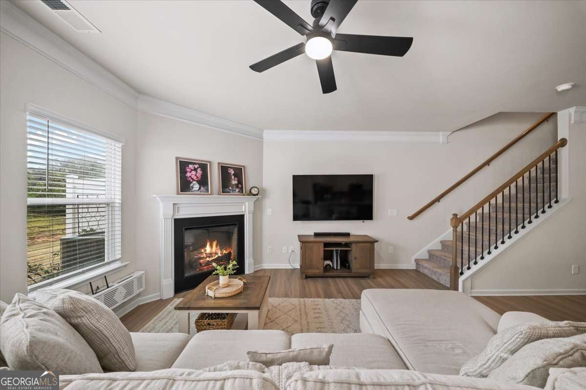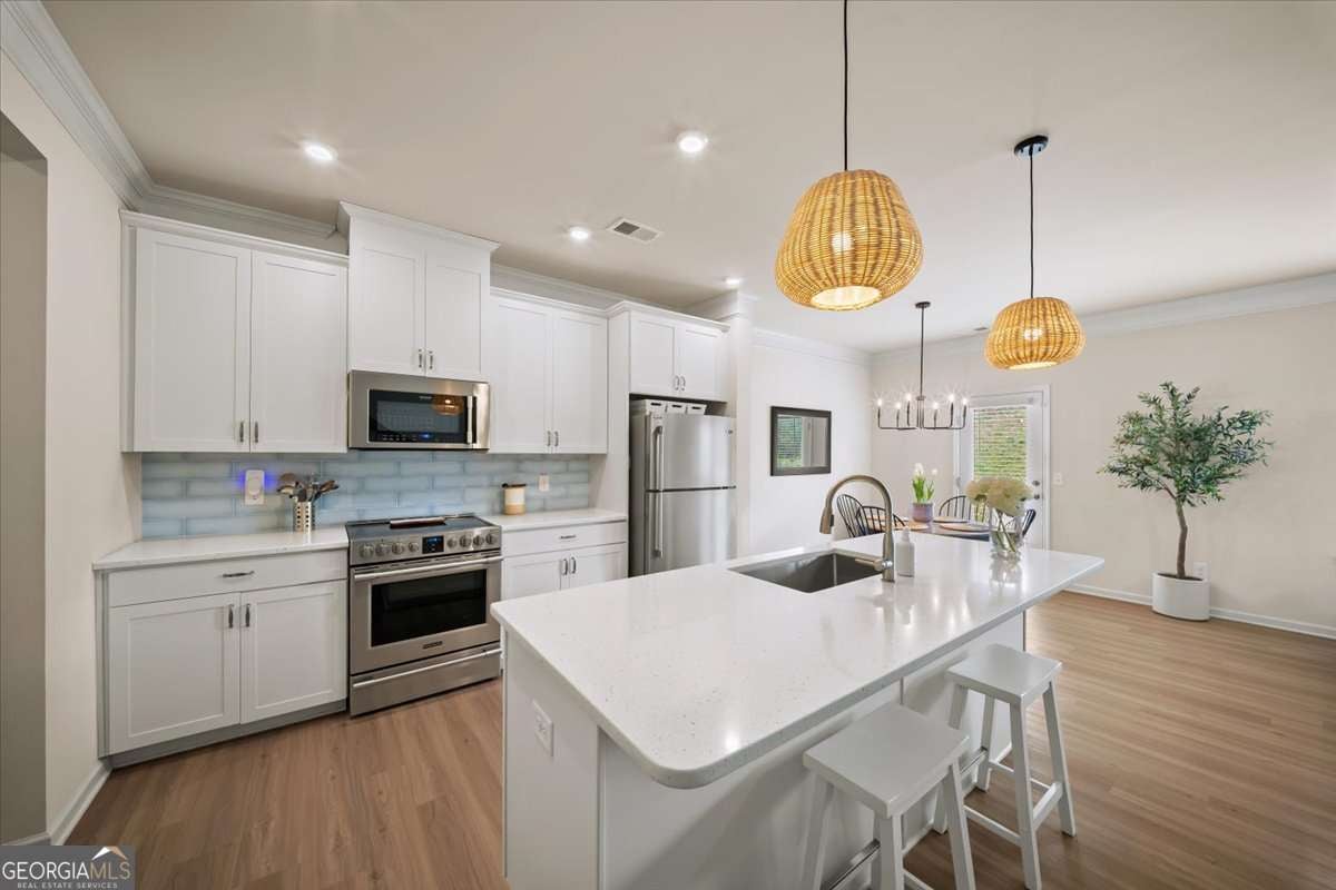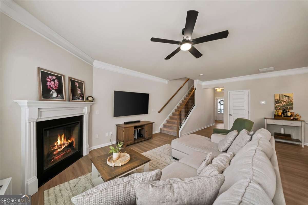 Beautiful, meticulously maintained townhome located just minutes from Downtown Woodstock in the fabulous Chelsea community! This sunshine-filled 3 bedroom, 2.5 bathroom is the perfect blend of charm and serenity. Enjoy a spacious open-concept kitchen, living, and dining room with a gas fireplace for cozy evenings. The kitchen is fully equipped with stainless steel appliances, a calming blue-green custom backsplash, and a full pantry for lots of extra storage! All three bedrooms are on the upper level, along with a nicely sized laundry with custom shelving. The Primary bedroom is oversized, with ample space for a sitting area, and features a large walk-in closet, and spacious bathroom featuring a soaking tub and double vanity with plenty of storage. Two additional bedrooms and a full bath are located on this level, including one featuring stunning hand-painted wallpaper. Enjoy this fantastic location, walking distance from great restaurants and grocery shopping at Publix! Just minutes from the bustling downtown Woodstock and 575 for an easy commute, this is a wonderful place to call home.