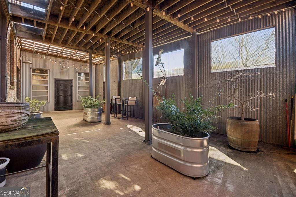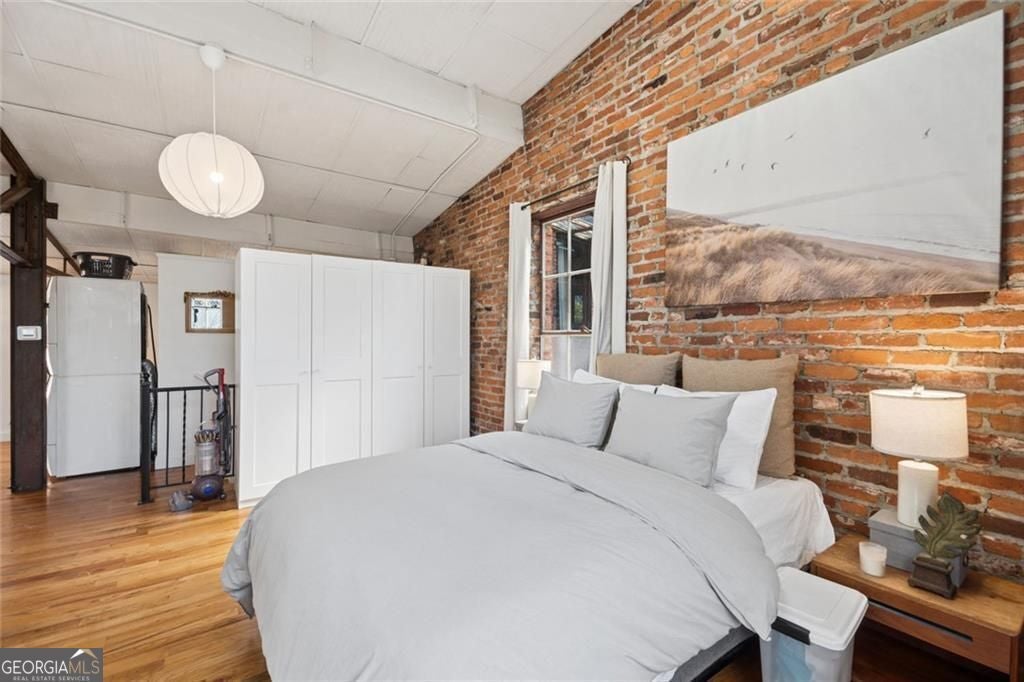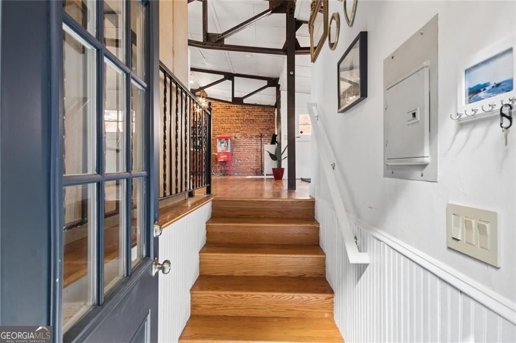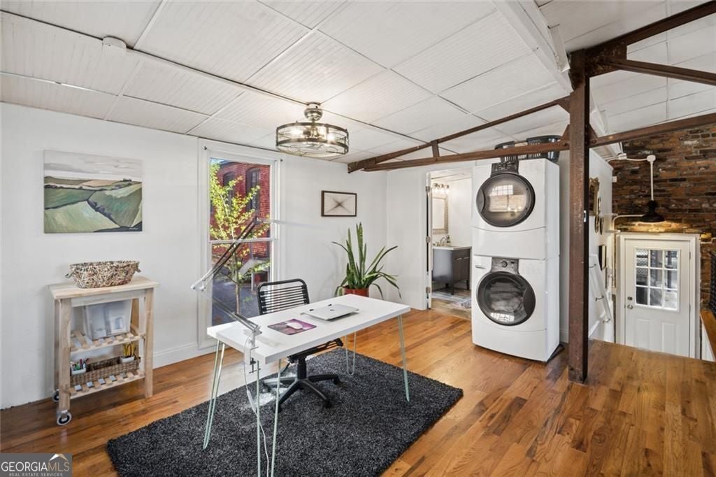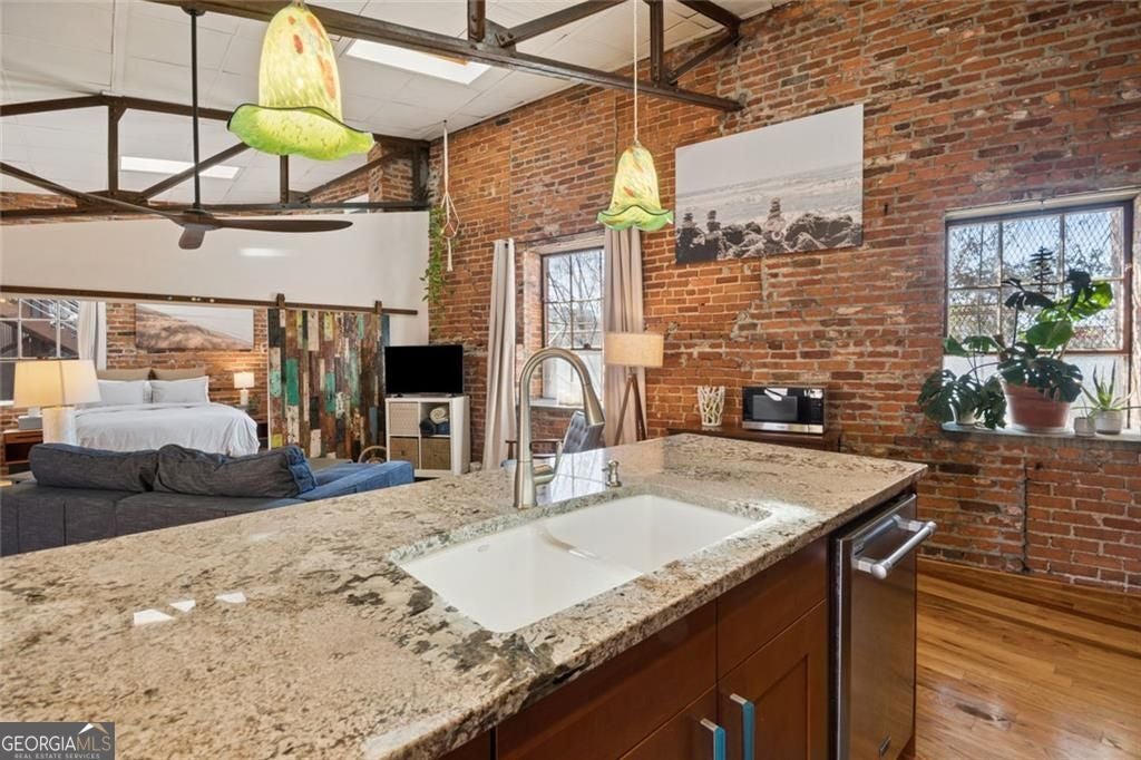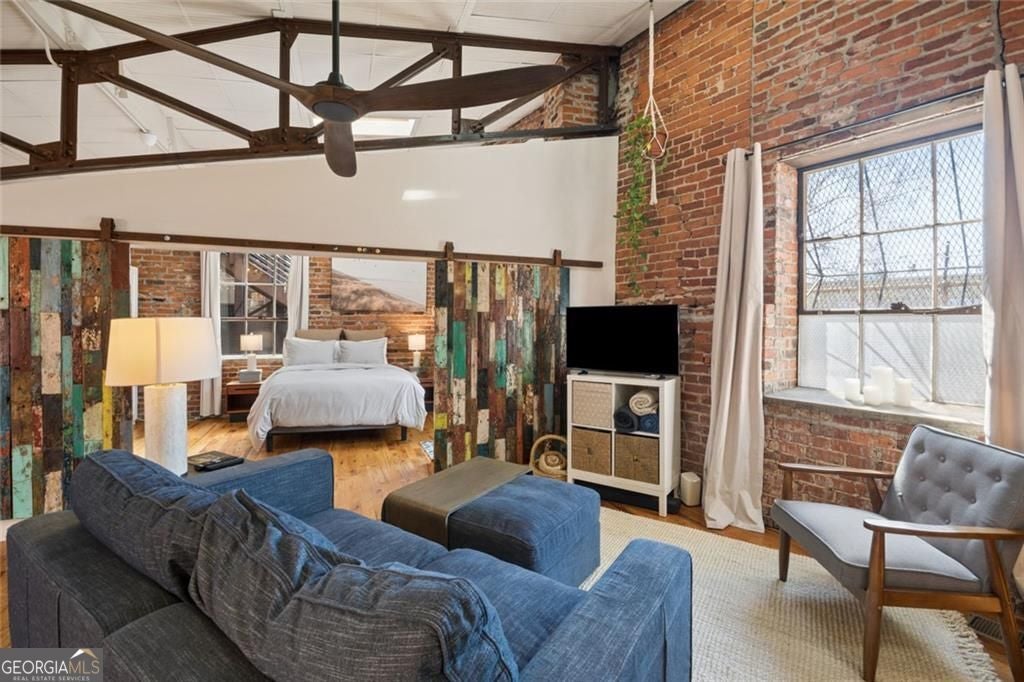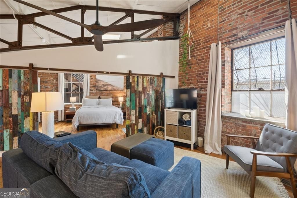 This beautiful free-standing loft sits just minutes from Georgia Tech and offers a rare mix of industrial character and warm design. Tucked behind hand-forged iron gates, the home welcomes you with a short private drive leading to its front deck and entrance, giving it a sense of privacy that's hard to find in the city. Inside, the updated kitchen features granite and quartz countertops, oak hardwood floors, and hand-tiled mosaic details. Barn doors crafted from Thai fishing boats open to a spacious bedroom filled with skylights, original windows, and historic steel trusses dating back to 1886. There's also a separate office area that could easily function as a second bedroom. Step out the back door and you'll find a private patio, plus access to a shaded rooftop deck with city views, a dog run, gym, storage unit, and additional storage beneath the porch. Guest parking is free, making it easy for friends to visit. If you enjoy spaces with history, character, and a little privacy in the middle of the city, this one might be worth a closer look.