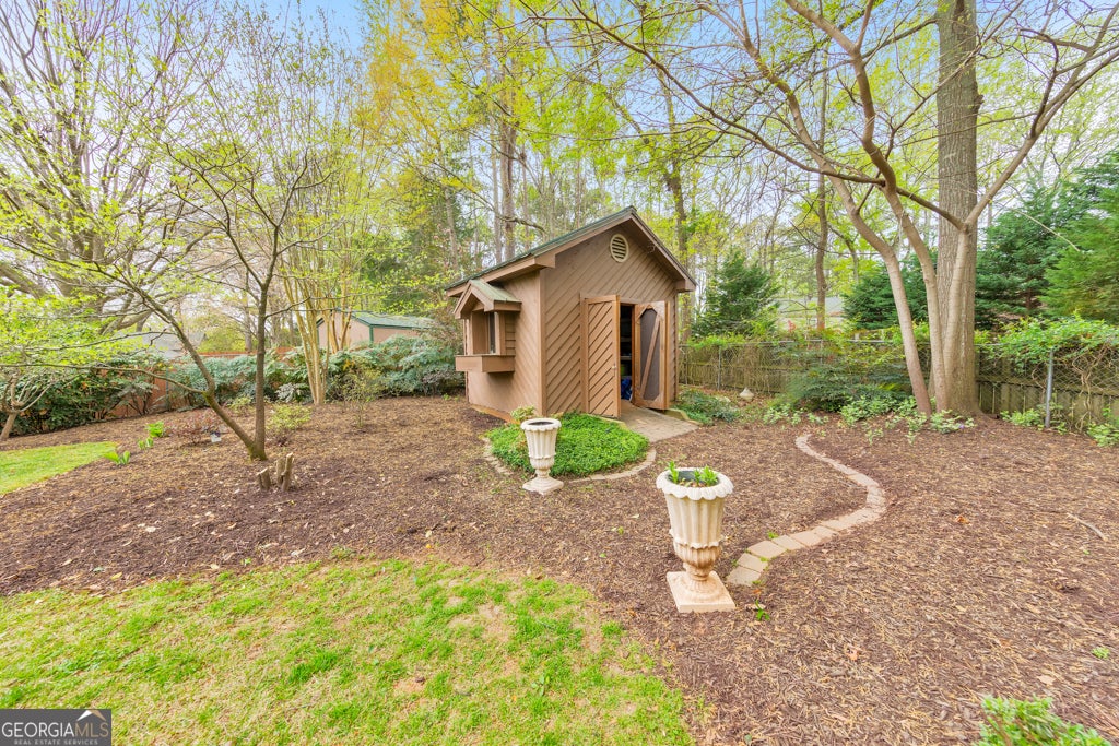 Here it is! The perfect home your family has been looking for! This beautifully updated 4-bedroom, 3-bath contemporary home is perfectly situated in East Cobb within the highly sought-after Pope High School district. Inside, you'll find a dramatic great room with a stunning stone fireplace, enhanced by a beautiful beamed ceiling! Updated light fixtures and ceiling fans enhance the home's bright, inviting atmosphere. The bright, airy kitchen features granite countertops, a new oven, new garbage disposal, and opens directly to a screened-in porch overlooking the incredibly landscaped backyard, perfect for everyday living and entertaining. The primary suite offers a granite vanity and a walk-in closet, while two additional bedrooms share a well-appointed bath. The finished terrace level expands your living space with a spacious family room, bar area, bedroom, full bath, and walk-in closet, ideal for guests or multi-generational living. Step outside to enjoy an expansive outdoor retreat, including a screened porch, a covered stone patio, and a lower-level stone patio designed for entertaining. A tranquil water feature creates a relaxing setting, complemented by a professionally landscaped, and private backyard. An outbuilding with electricity adds flexibility for hobbies, storage, or a workshop. Additional highlights include a large two-car garage and numerous major system updates: roof (2019), hardi board siding and gutters (2023), new HVAC compressor, and drainage improvements.