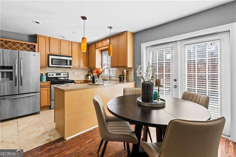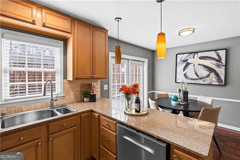 Welcome to this beautifully maintained two-story townhome located in the gated community of Carlyle Square, offering unbeatable convenience to some of Atlanta's most popular destinations. Just minutes from The Works, Georgia Tech, Midtown, Buckhead, and easy access to I-75/85, this location makes commuting and city living easy. Walk to nearby restaurants, Publix, and retail, or enjoy outdoor spots like the BeltLine at Tanyard Creek Park, Bobby Jones Golf Course, and Bitsy Grant Tennis Center. Topgolf and other entertainment options are also just around the corner. Residents enjoy community amenities including a swimming pool, fitness center, and a very active and friendly HOA. Inside, the home features fresh paint and a bright, welcoming layout. The main level offers a spacious family room, convenient powder room, and a large kitchen with rich brown cabinetry, granite countertops, a bar-style island, and an eat-in dining area just off the kitchen-perfect for everyday living or entertaining. The laundry area is located inside the unit with plenty of space for added convenience. Step outside to a private fenced patio with additional storage, creating a great spot for relaxing or hosting guests. Upstairs you'll find two comfortable bedrooms and a renovated bathroom with tile flooring and a recently updated separate tub and shower. The primary bedroom offers generous closet space, while the secondary bedroom includes custom built-ins. This move-in ready townhome combines space, updates, and an unbeatable location close to everything Atlanta has to offer.