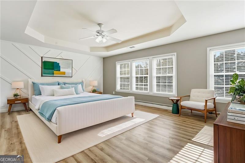 Welcome home to this beautiful 5 bedroom 2.5 bathroom home with finished walk-out basement and a spacious private backyard. This home also features an oversized main bedroom with a spacious bath that includes a separate tub and shower. The main level and upstairs have all new LVP in a beautiful wood tone. The main level features a bright open floor plan, an eat-in kitchen, laundry room, mudroom, and a bonus sitting room. The plumbing has been updated and this home has been beautifully maintained, an outlet has been added in the garage to charge an electric vehicle. The neighborhood features an olympic sized community pool, two ponds, tennis courts, playground, and a walking trail. Close to schools, shopping, restaurants, and Swift Cantrell Park.