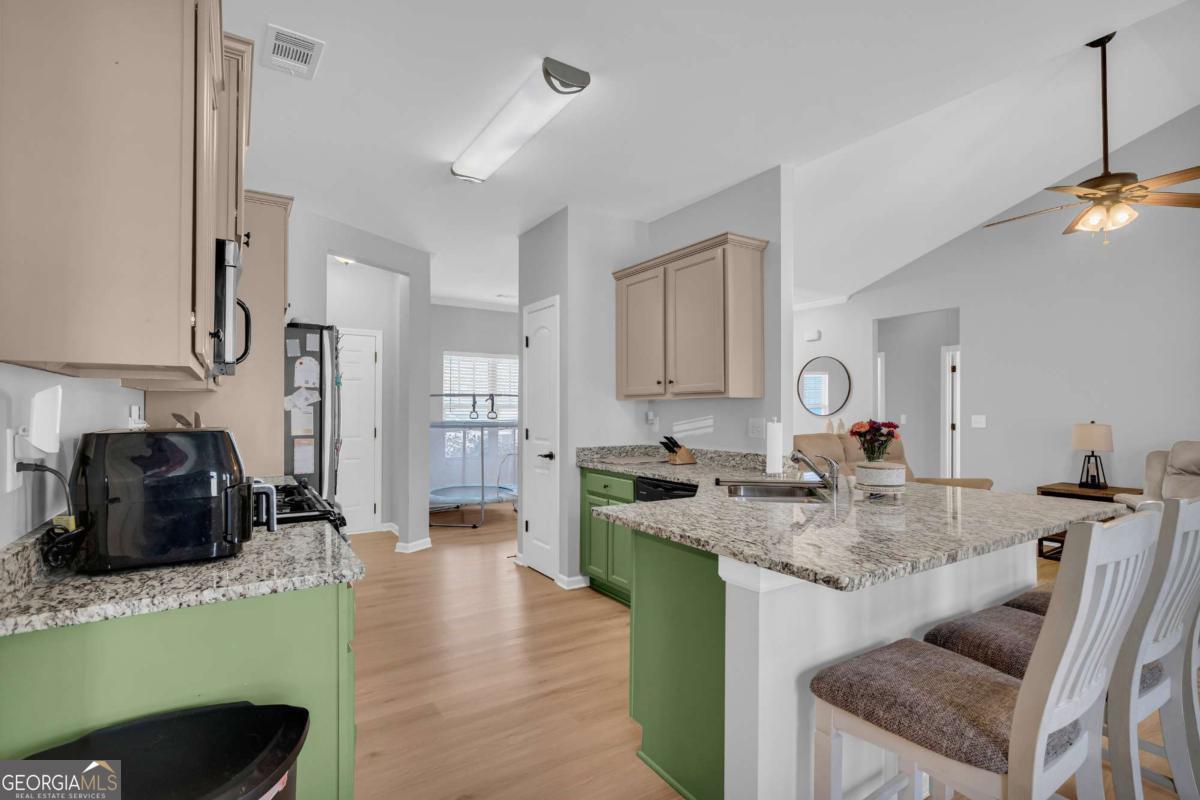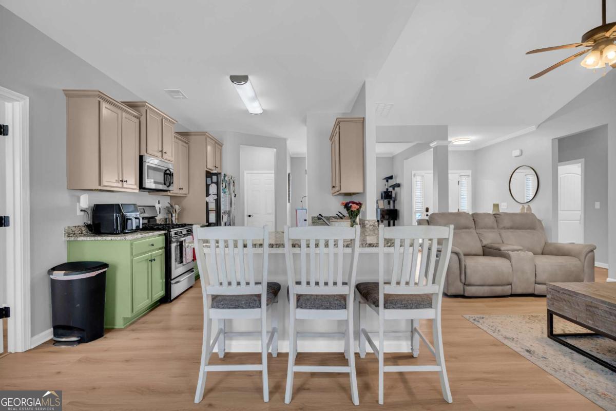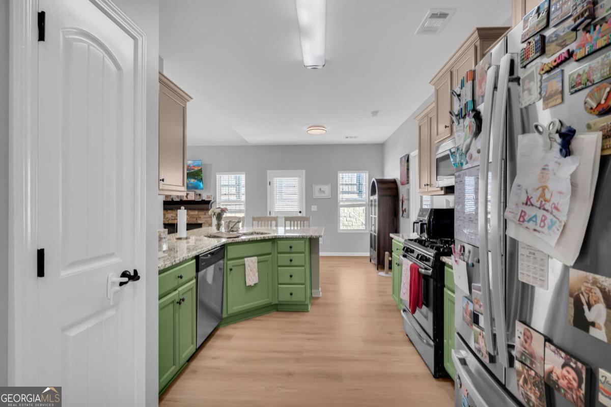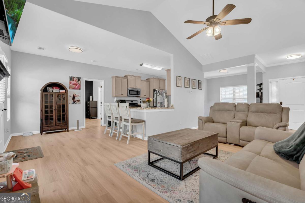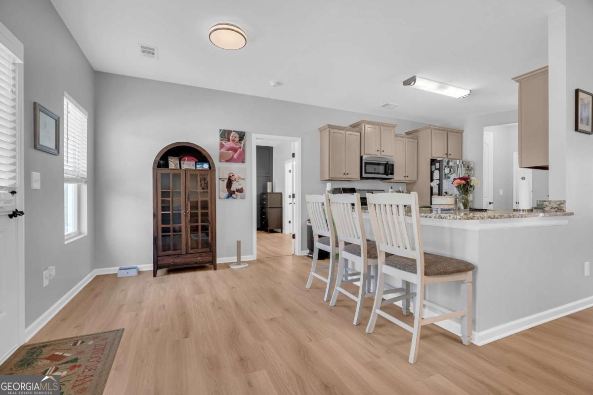 Welcome to this beautiful, like-new 4-bedroom, 2-bath ranch located in the heart of Downtown Dawsonville. This home features a spacious living room with a cozy fireplace and an open kitchen complete with granite countertops, stainless steel appliances, a dining area, and additional eat-in kitchen space. The owner's suite is conveniently located on the main level and includes a large private bath, along with two secondary bedrooms and a full bath. Upstairs, you'll find a spacious fourth bedroom with a mini-split, perfect for guests, a home office, or a bonus room. Additional highlights include a two-car garage, brand new Springfield Oak LVP flooring throughout, fresh paint, and thoughtfully designed accent walls that add warmth and character. The home sits on a beautifully landscaped lot in a great neighborhood, offering both comfort and curb appeal. This property truly has all the right touches to make it feel like home and won't last long!