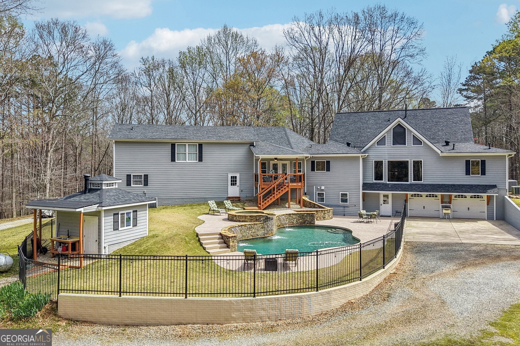 Welcome to your own 4.28 acres private retreat where tranquility, space and comfort come together to create the perfect place to call home. Nestled in a peaceful setting, this property offers a blend of luxury amenities and flexible living spaces ideal for relaxing, entertaining or multi-generational living.. Step outside to your personal oasis featuring a gunite saltwater inground pool with hot tub and 3 waterfalls creating a resort style atmosphere. Inside, the kitchen is designed for both everyday living and entertaining, equipped with a 6 burner GE Monogram gas cooktop and GE Advantium microwave oven. This home also includes a Rinnai tankless water heater and zoned heating and air for comfort throughout the house. Additional features include: -walkout basement with garage access that has potential for an in-law suite with laundry hookup -bonus over garage with kitchenette and 1/2 bath, separate entrance -generously sized bedrooms -lots of closets & storage -large front porch -master on the main 3 bedrooms and 1 full bath upstairs With privacy, luxury features, and flexible living space, this property offers the perfect blend of comfort and functionality - all set on beautiful acreage designed for peaceful living A rare opportunity to own a private retreat with resort-style amenities and room to grow.