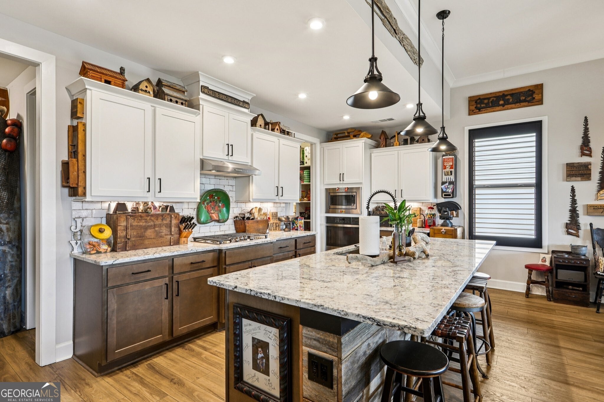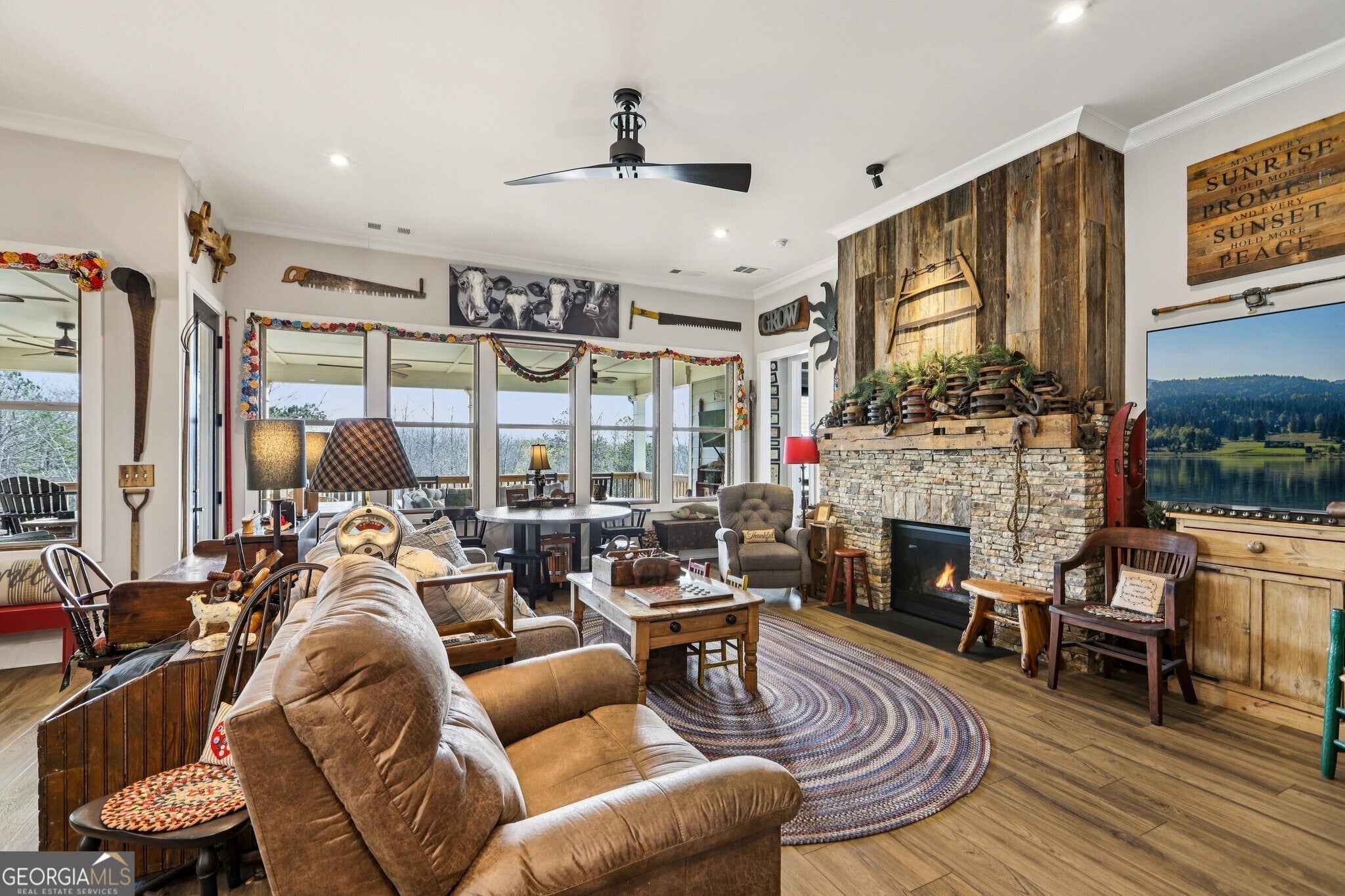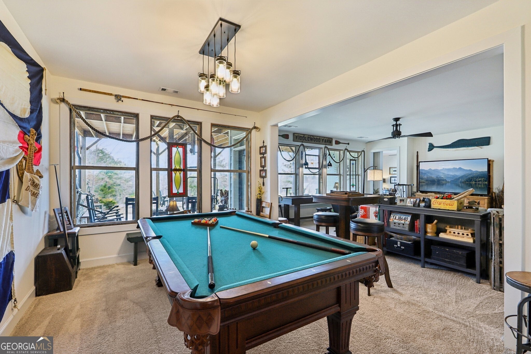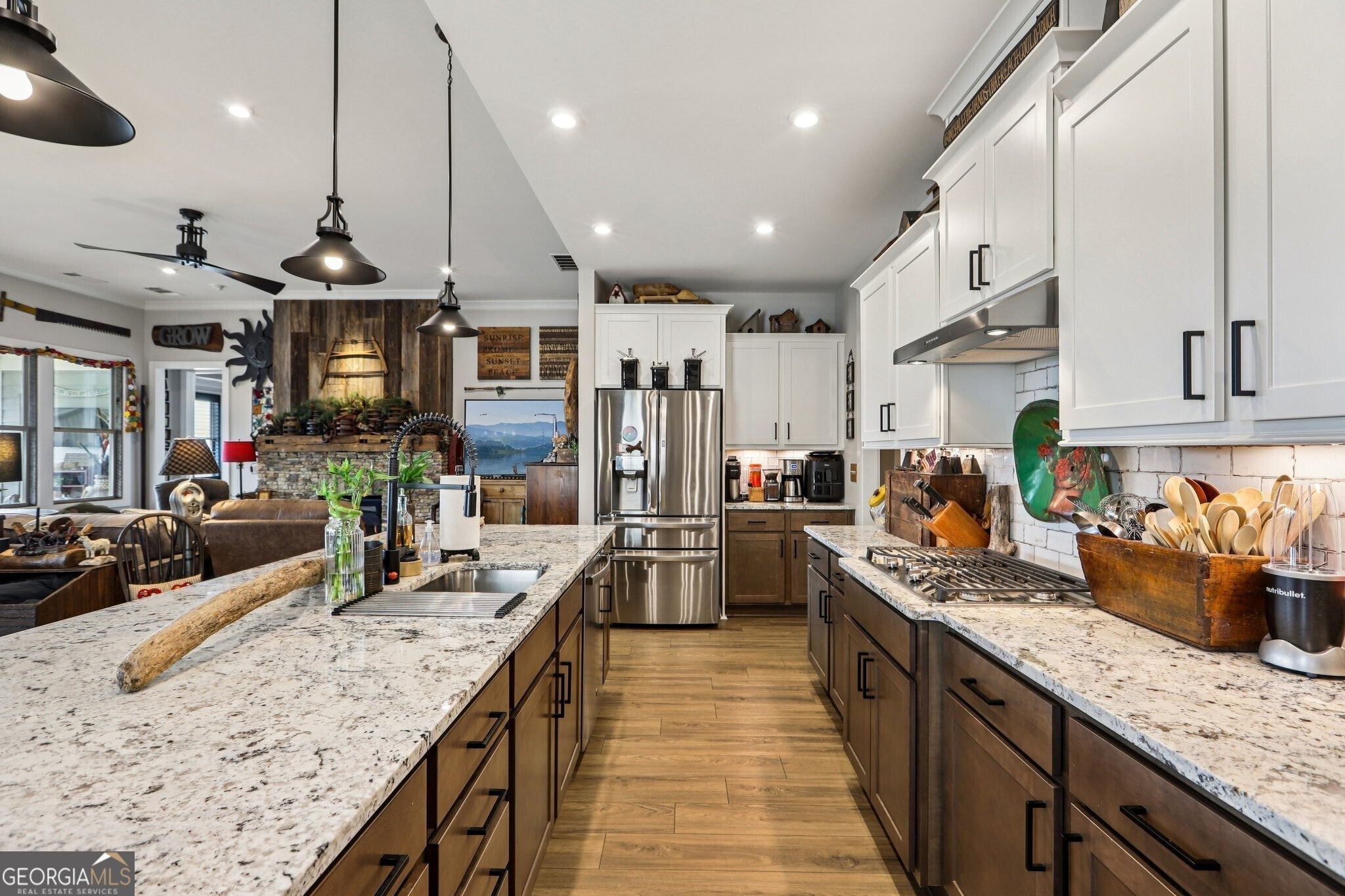 Welcome to 419 Ontario Lane in Cresswind at Twin Lakes, one of Hoschton's premier active adult communities, featuring the highly desirable Maple design where thoughtful layout, quality craftsmanship, and a true lifestyle experience come together. Positioned along a scenic, wooded backdrop within the community, this home offers a rare combination of privacy, upgraded finishes, and functional living space. With over $150,000 in carefully selected upgrades, it stands apart from typical resale offerings and delivers both visual appeal and everyday usability. From the moment you enter, the home makes a strong impression with its inviting entry and attention to detail, including a custom tin ceiling feature in the foyer that immediately sets the tone. The main living areas are open, light-filled, and designed for both comfort and connection, with a seamless flow between the kitchen, dining, and great room. The great room is anchored by a striking stone fireplace enhanced by a custom reclaimed wood feature wall and mantel, creating a warm and memorable focal point, while a wall of windows along the rear brings in natural light and frames views of the outdoor living space. The kitchen is both functional and visually appealing, featuring granite countertops, a gas cooktop, built-in wall oven and microwave, stainless steel appliances, a large center island with seating and prep space, and a blend of white and warm wood-tone cabinetry. A fully customized walk-in pantry with built-in shelving and workspace provides exceptional organization, while a well-equipped laundry room adds convenience to daily living. The owner's suite offers a private retreat with a spacious bedroom, abundant natural light, and tray ceiling accented with custom tin inlay. The en-suite bath includes dual vanities with granite countertops, a large tiled walk-in shower with frameless glass, and a custom walk-in closet designed with built-in shelving, drawers, and ample hanging space. The finished terrace level expands the home into a true second living environment, featuring a spacious media and lounge area, a dedicated game room with pool table space, and a wall of windows overlooking the covered patio. This level also includes a private bedroom suite with access to a full bath, making it ideal for guests or extended stays, along with additional storage areas and built-in features that enhance both functionality and flexibility. Outdoor living is a defining feature of this home, highlighted by an expansive covered deck and lower-level patio with stone flooring, wood accents, and multiple seating and dining areas designed for year-round enjoyment. A custom fire pit area surrounded by Adirondack seating creates a natural gathering space, all set within a private, thoughtfully landscaped backyard that offers both usability and a sense of retreat. Additional upgrades include custom closet systems, finished garage flooring with built-in storage and workspace, designer lighting and window treatments, reclaimed wood accents, extensive landscaping, stonework, and outdoor lighting, reflecting a level of care and investment rarely found in resale homes. Living in Cresswind at Twin Lakes means enjoying resort-style amenities within a gated active adult community, including a clubhouse with a full-time activities director, indoor and outdoor pools, a SmartFit training center, yoga studio, arts and crafts spaces, Georgia's largest private pickleball complex, scenic walking trails, lakes with a dock for kayaking and fishing, a dog park, and a community garden. The monthly HOA includes cable, internet, security monitoring, and yard maintenance, creating a low-maintenance, lock-and-leave lifestyle. With its combination of curated upgrades, flexible living space, private setting, and exceptional indoor-outdoor design, this Maple plan offers a rare opportunity to enjoy both comfort and community in one of Northeast Georgia's most sought-after active adult neighborhoods.