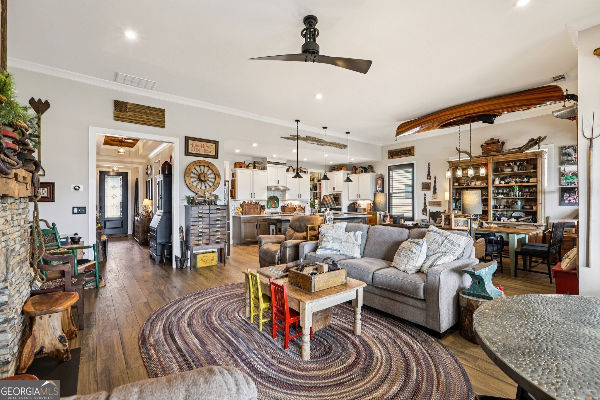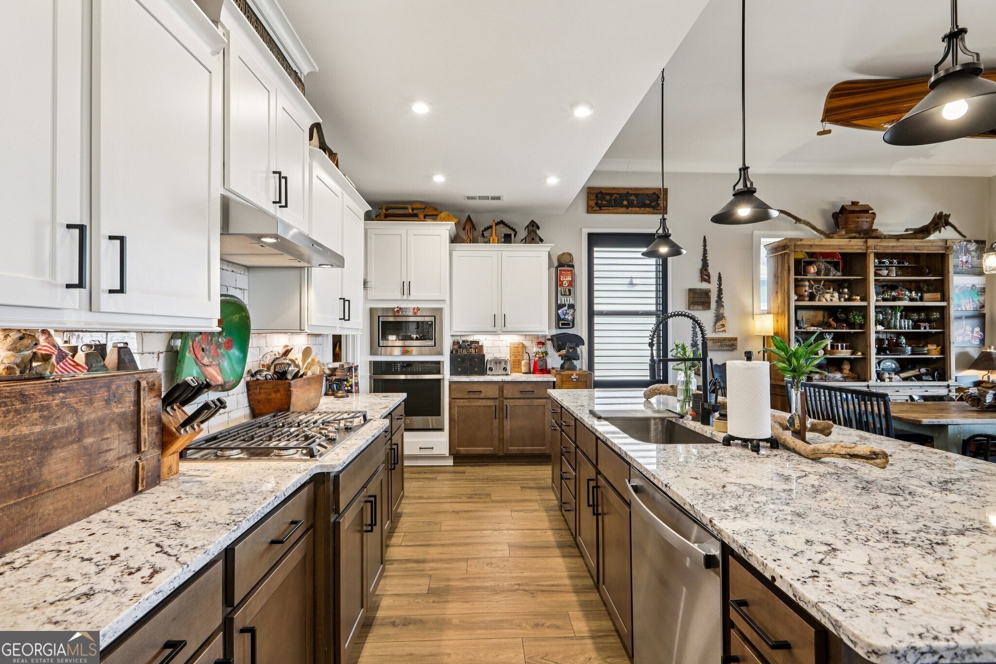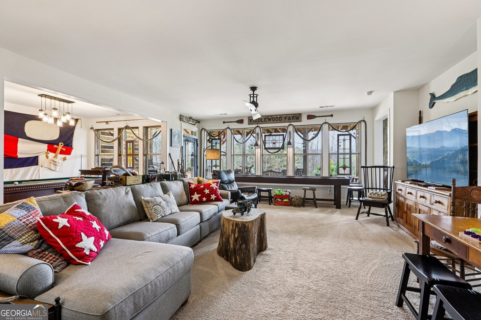 Welcome to 419 Ontario Lane in Cresswind at Twin Lakes, one of Hoschton's premier active adult communities, featuring the highly desirable Maple design where thoughtful layout, quality craftsmanship, and a true lifestyle experience come together. Positioned along a scenic, wooded backdrop within the community, this home offers a rare combination of privacy, upgraded finishes, and functional living space. With over $150,000 in carefully selected upgrades, it stands apart from typical resale offerings and delivers both visual appeal and everyday usability. From the moment you enter, the home makes a strong impression with its inviting entry and attention to detail, including a custom tin ceiling feature in the foyer that immediately sets the tone. The main living areas are open, light-filled, and designed for both comfort and connection, with a seamless flow between the kitchen, dining, and great room. The great room is anchored by a striking stone fireplace enhanced by a custom reclaimed wood feature wall and mantel, creating a warm and memorable focal point, while a wall of windows along the rear brings in natural light and frames views of the outdoor living space. The kitchen is both functional and visually appealing, featuring granite countertops, a gas cooktop, built-in wall oven and microwave, stainless steel appliances, a large center island with seating and prep space, and a blend of white and warm wood-tone cabinetry. A fully customized walk-in pantry with built-in shelving and workspace provides exceptional organization, while a well-equipped laundry room adds convenience to daily living. The owner's suite offers a private retreat with a spacious bedroom, abundant natural light, and tray ceiling accented with custom tin inlay. The en-suite bath includes dual vanities with granite countertops, a large tiled walk-in shower with frameless glass, and a custom walk-in closet designed with built-in shelving, drawers, and ample hanging space. The finished terrace level expands the home into a true second living environment, featuring a spacious media and lounge area, a dedicated game room with pool table space, and a wall of windows overlooking the covered patio. This level also includes a private bedroom suite with access to a full bath, making it ideal for guests or extended stays, along with additional storage areas and built-in features that enhance both functionality and flexibility. Outdoor living is a defining feature of this home, highlighted by an expansive covered deck and lower-level patio with stone flooring, wood accents, and multiple seating and dining areas designed for year-round enjoyment. A custom fire pit area surrounded by Adirondack seating creates a natural gathering space, all set within a private, thoughtfully landscaped backyard that offers both usability and a sense of retreat. Additional upgrades include custom closet systems, finished garage flooring with built-in storage and workspace, designer lighting and window treatments, reclaimed wood accents, extensive landscaping, stonework, and outdoor lighting, reflecting a level of care and investment rarely found in resale homes. Living in Cresswind at Twin Lakes means enjoying resort-style amenities within a gated active adult community, including a clubhouse with a full-time activities director, indoor and outdoor pools, a SmartFit training center, yoga studio, arts and crafts spaces, Georgia's largest private pickleball complex, scenic walking trails, lakes with a dock for kayaking and fishing, a dog park, and a community garden. The monthly HOA includes cable, internet, security monitoring, and yard maintenance, creating a low-maintenance, lock-and-leave lifestyle. With its combination of curated upgrades, flexible living space, private setting, and exceptional indoor-outdoor design, this Maple plan offers a rare opportunity to enjoy both comfort and community in one of Northeast Georgia's most sought-after active adult neighborhoods.