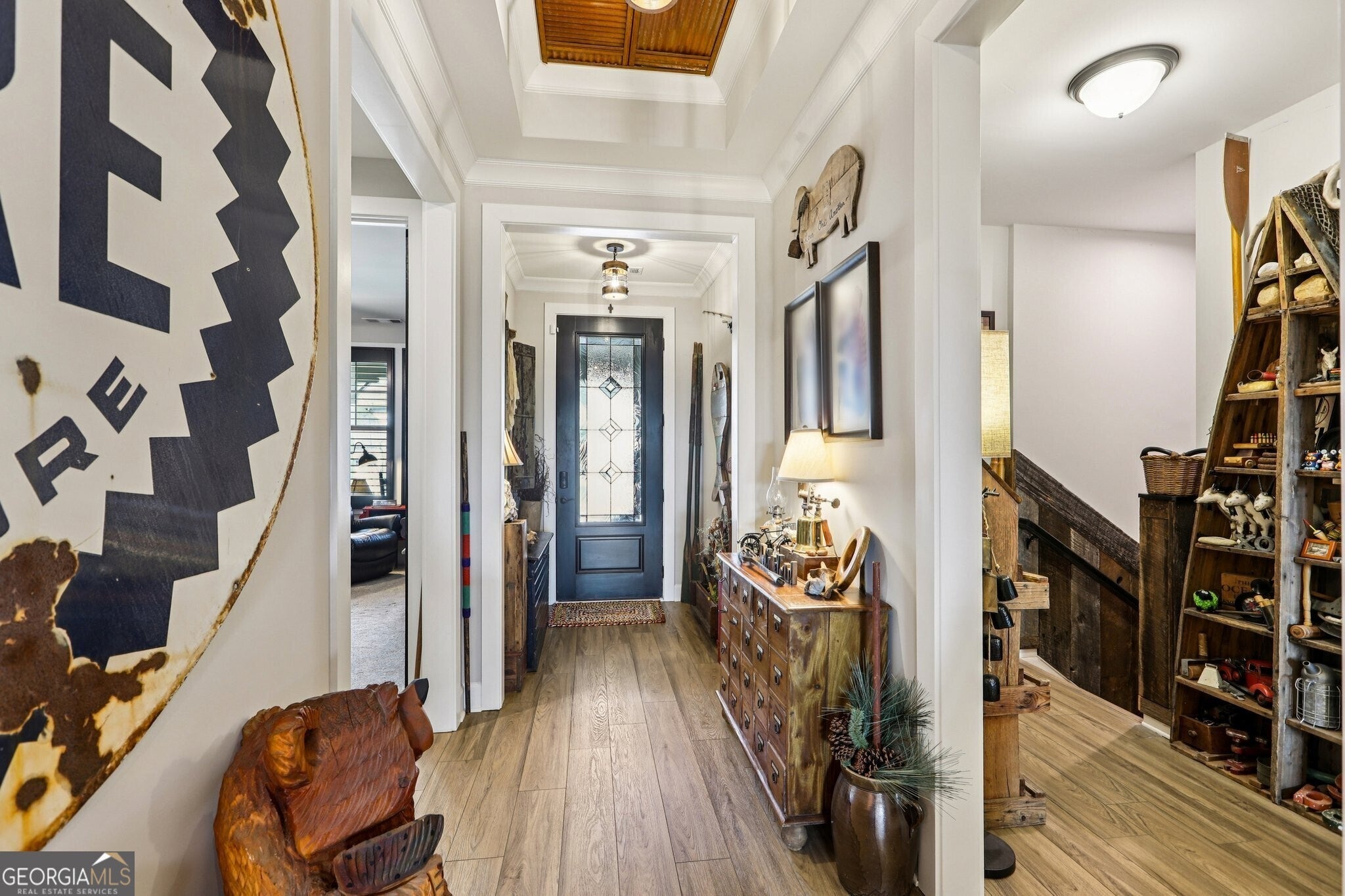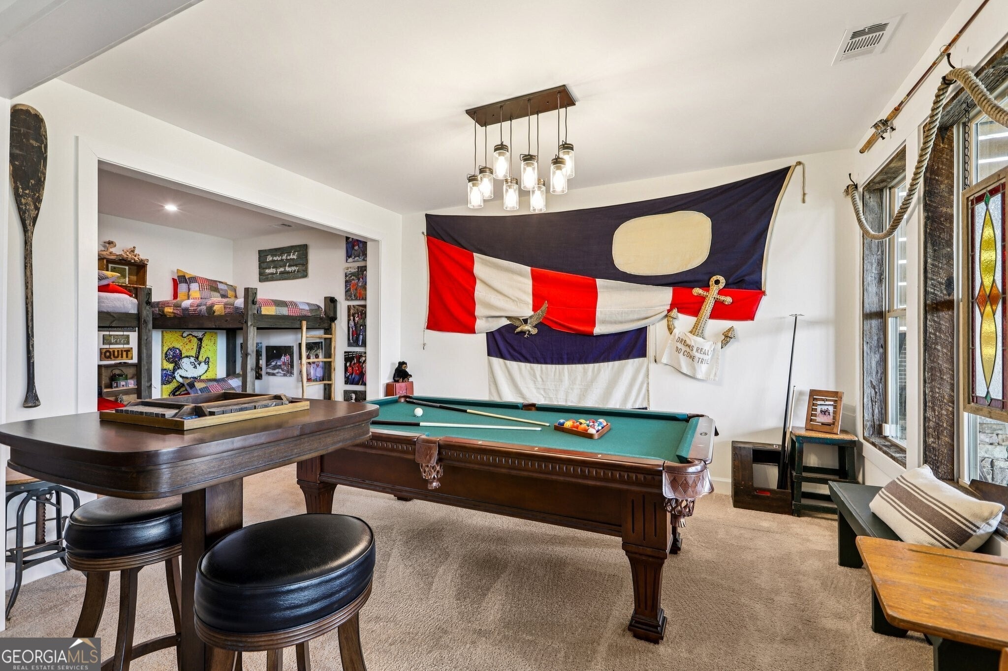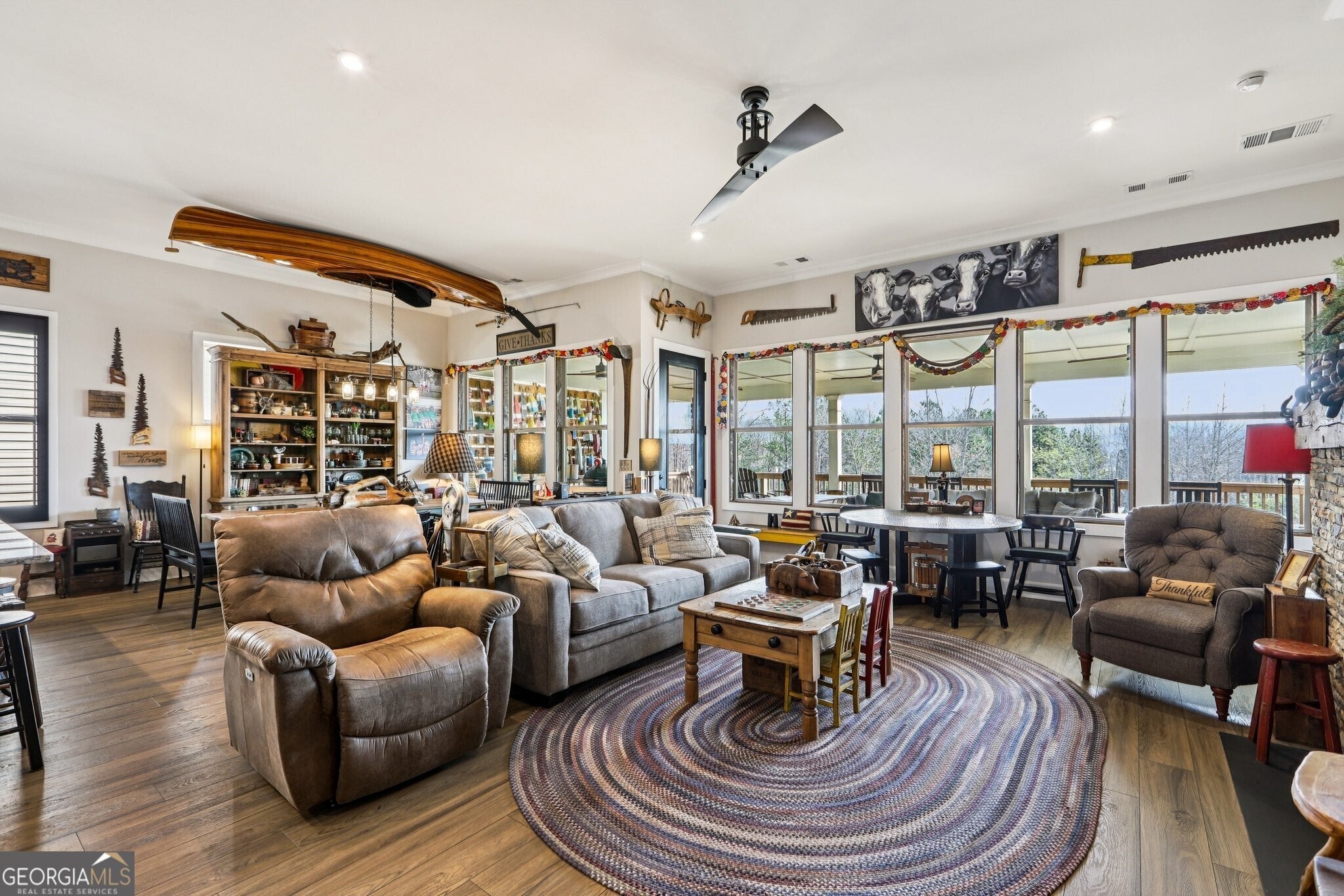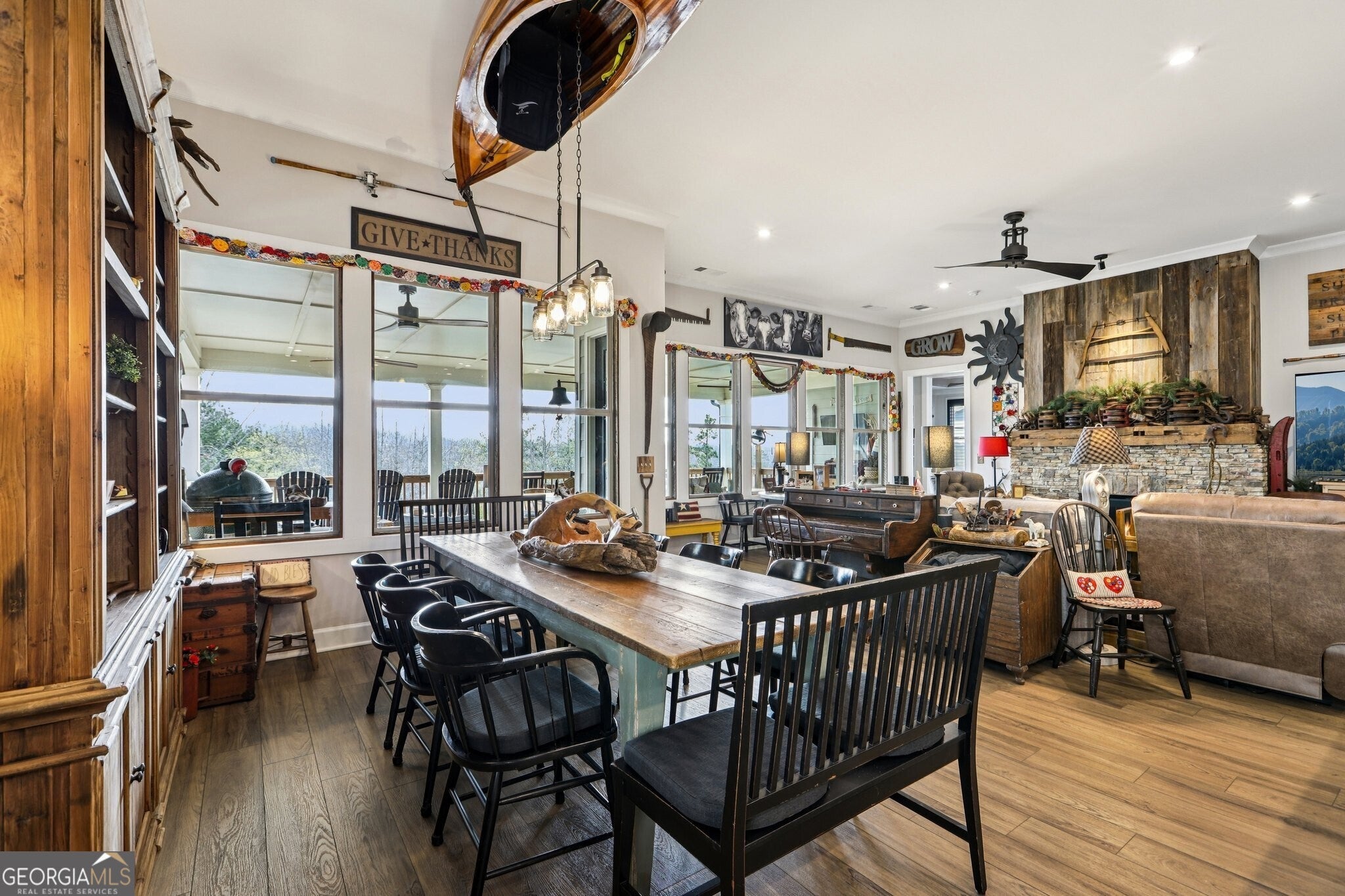 Welcome to 419 Ontario Lane in Cresswind at Twin Lakes, one of Hoschton's premier active adult communities, featuring the highly desirable Maple design where thoughtful layout, quality craftsmanship, and a true lifestyle experience come together. Positioned along a scenic, wooded backdrop within the community, this home offers a rare combination of privacy, upgraded finishes, and functional living space. With over $150,000 in carefully selected upgrades, it stands apart from typical resale offerings and delivers both visual appeal and everyday usability. From the moment you enter, the home makes a strong impression with its inviting entry and attention to detail, including a custom tin ceiling feature in the foyer that immediately sets the tone. The main living areas are open, light-filled, and designed for both comfort and connection, with a seamless flow between the kitchen, dining, and great room. The great room is anchored by a striking stone fireplace enhanced by a custom reclaimed wood feature wall and mantel, creating a warm and memorable focal point, while a wall of windows along the rear brings in natural light and frames views of the outdoor living space. The kitchen is both functional and visually appealing, featuring granite countertops, a gas cooktop, built-in wall oven and microwave, stainless steel appliances, a large center island with seating and prep space, and a blend of white and warm wood-tone cabinetry. A fully customized walk-in pantry with built-in shelving and workspace provides exceptional organization, while a well-equipped laundry room adds convenience to daily living. The owner's suite offers a private retreat with a spacious bedroom, abundant natural light, and tray ceiling accented with custom tin inlay. The en-suite bath includes dual vanities with granite countertops, a large tiled walk-in shower with frameless glass, and a custom walk-in closet designed with built-in shelving, drawers, and ample hanging space. The finished terrace level expands the home into a true second living environment, featuring a spacious media and lounge area, a dedicated game room with pool table space, and a wall of windows overlooking the covered patio. This level also includes a private bedroom suite with access to a full bath, making it ideal for guests or extended stays, along with additional storage areas and built-in features that enhance both functionality and flexibility. Outdoor living is a defining feature of this home, highlighted by an expansive covered deck and lower-level patio with stone flooring, wood accents, and multiple seating and dining areas designed for year-round enjoyment. A custom fire pit area surrounded by Adirondack seating creates a natural gathering space, all set within a private, thoughtfully landscaped backyard that offers both usability and a sense of retreat. Additional upgrades include custom closet systems, finished garage flooring with built-in storage and workspace, designer lighting and window treatments, reclaimed wood accents, extensive landscaping, stonework, and outdoor lighting, reflecting a level of care and investment rarely found in resale homes. Living in Cresswind at Twin Lakes means enjoying resort-style amenities within a gated active adult community, including a clubhouse with a full-time activities director, indoor and outdoor pools, a SmartFit training center, yoga studio, arts and crafts spaces, Georgia's largest private pickleball complex, scenic walking trails, lakes with a dock for kayaking and fishing, a dog park, and a community garden. The monthly HOA includes cable, internet, security monitoring, and yard maintenance, creating a low-maintenance, lock-and-leave lifestyle. With its combination of curated upgrades, flexible living space, private setting, and exceptional indoor-outdoor design, this Maple plan offers a rare opportunity to enjoy both comfort and community in one of Northeast Georgia's most sought-after active adult neighborhoods.