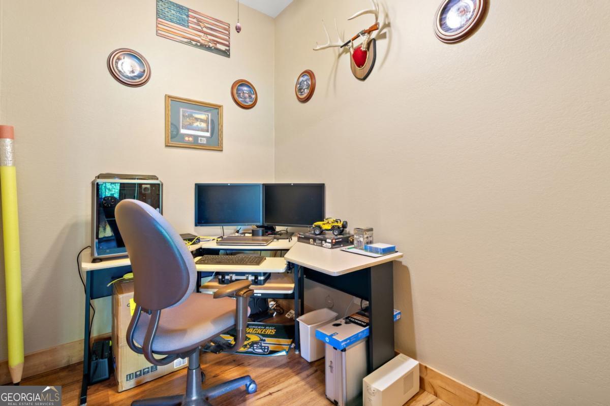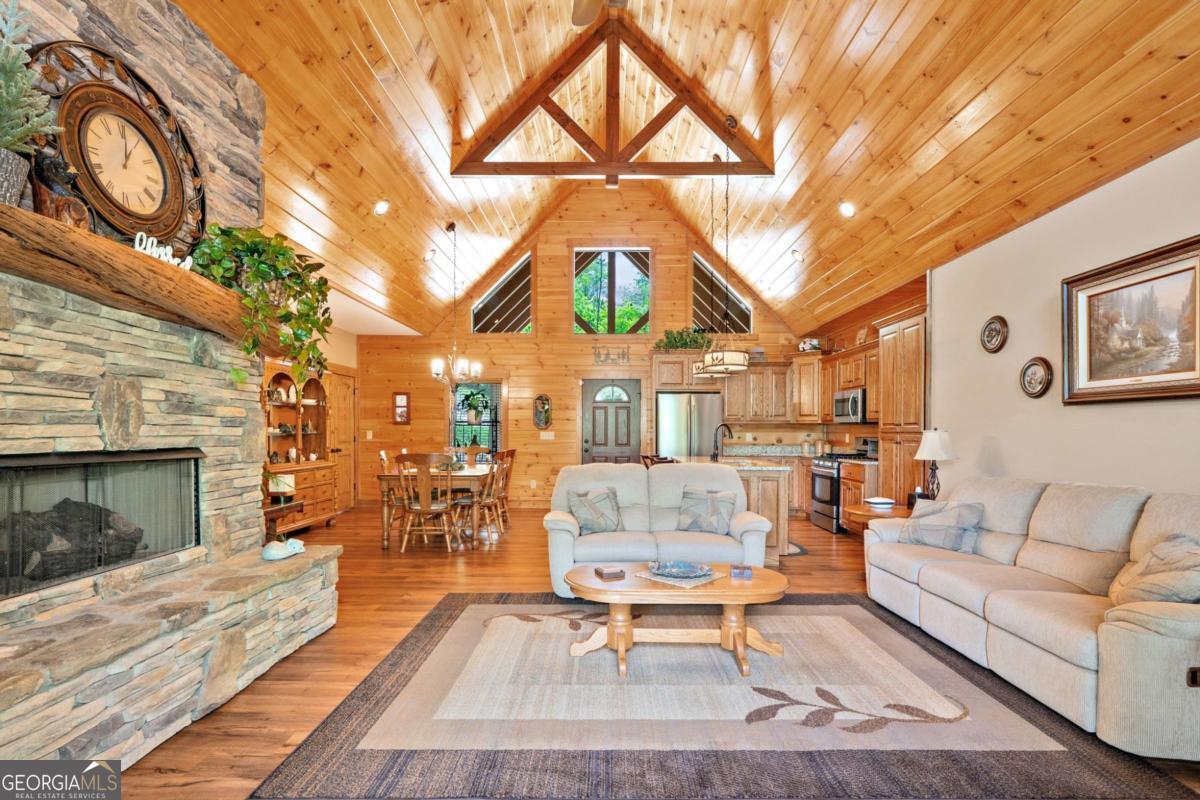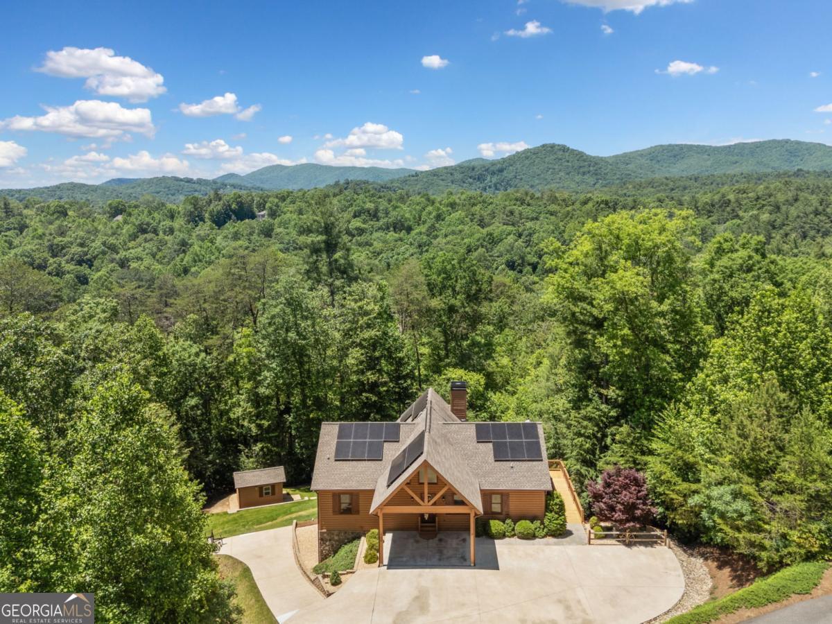 Welcome to 1172 Settlers Ridge in Homestead Mountain - a refined mountain retreat where timeless craftsmanship meets elevated, sustainable living. Privately nestled in the sought-after Homestead Mountain community in the heart of North Georgia, this 4-bedroom, 3.5-bath log-style residence offers a rare blend of rustic elegance and modern innovation. From the moment you arrive, the striking timber-frame entry, expansive concrete drive, and serene wooded setting create a grand yet inviting sense of arrival. Inside, soaring ceilings, a dramatic floor-to-ceiling stone fireplace, and walls of glass bathe the home in natural light, seamlessly blending indoor comfort with the surrounding landscape. Custom window coverings add a polished, tailored finish. The open-concept living space flows effortlessly onto two full-length covered decks-ideal for entertaining or quiet moments immersed in nature. A rare and highly desirable feature, the home offers TWO primary suites on the main level, providing flexibility, privacy, and comfort for both owners and guests. Thoughtfully designed for lasting quality, the home features brand-new porch railings, a convenient walk-up ramp, and a Rhino Shield exterior with transferable warranty. Maintenance-free leaf guard gutters add ease to everyday living. For the discerning buyer seeking efficiency without compromise, the privately owned solar system (not leased) delivers energy efficiency and long-term savings. Additional features include a dedicated office, workshop, cozy wood-burning stove, and refined upgrades throughout- each detail curated for both function and comfort. Impeccably maintained and move-in ready, this property offers a rare combination of privacy, quality, and low-maintenance living-positioning it as a standout offering in today's market. Whether a full-time residence or luxurious mountain escape, this is where lifestyle, comfort, and intention come together beautifully.