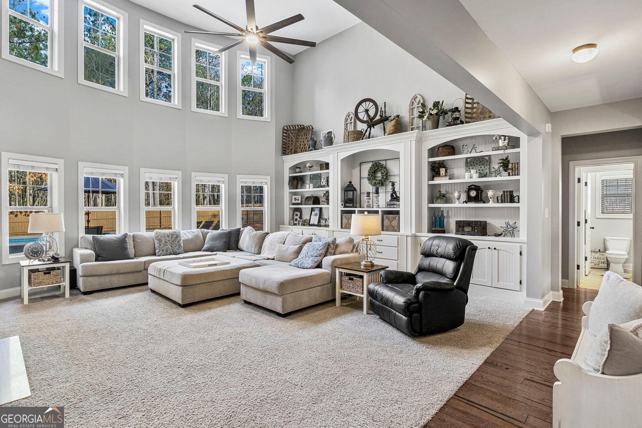 FABULOUS CRAFTSMAN HOME NESTLED ON A 1.61 ACRE CUL-DE-SAC LOT IN SOUGHT AFTER AUSTINS CREEK LOCATED IN TOP RATED SCHOOL DISTRICT!! Relax in the private backyard with a brand-new landscaped backyard and an in-ground saltwater pool with a covered porch and brick surround fireplace!! Large Kitchen with Granite Countertops, tiled backsplash, stainless appliances and a large granite top island with breakfast bar, hardwood flooring and large walk-in pantry!! Breakfast area with hardwood flooring. Family room with soaring ceiling with marble surround fireplace with gas starter and entire wall w/ built-ins & cabinets, wall of windows overlooking backyard and pool. Formal dining room with picture molding, coffered ceiling & hardwood flooring! Office or den on the main level just off the foyer. Guest bedroom and guest bathroom on main. Guest bedroom on the second level with en-suite tiled bathroom w/ walk-in closet! Two additional guest bedrooms on the second level, both w/ closets, tiled guest bathroom in hallway w/ vanity & shower/tub. Office area on the second floor leading to covered porch. Master suite with sitting area, trey ceiling, tiled master bathroom w/ double vanity sinks, soaking tub with tiled surround & separate tiled shower & huge walk-in closet!! The third level offers an exercise room, office or playroom, full tiled bathroom in hallway and huge tv room. New exterior paint, new paint on backyard privacy fence in 2024, all new plumbing installed in December 2023, tankless water heater, 3 car garage!! This home is located minutes from I-85 for quick travel to Hartsfield-Jackson Atlanta Airport and Atlanta!! Short drive to Peachtree City and Historic Downtown Newnan!!