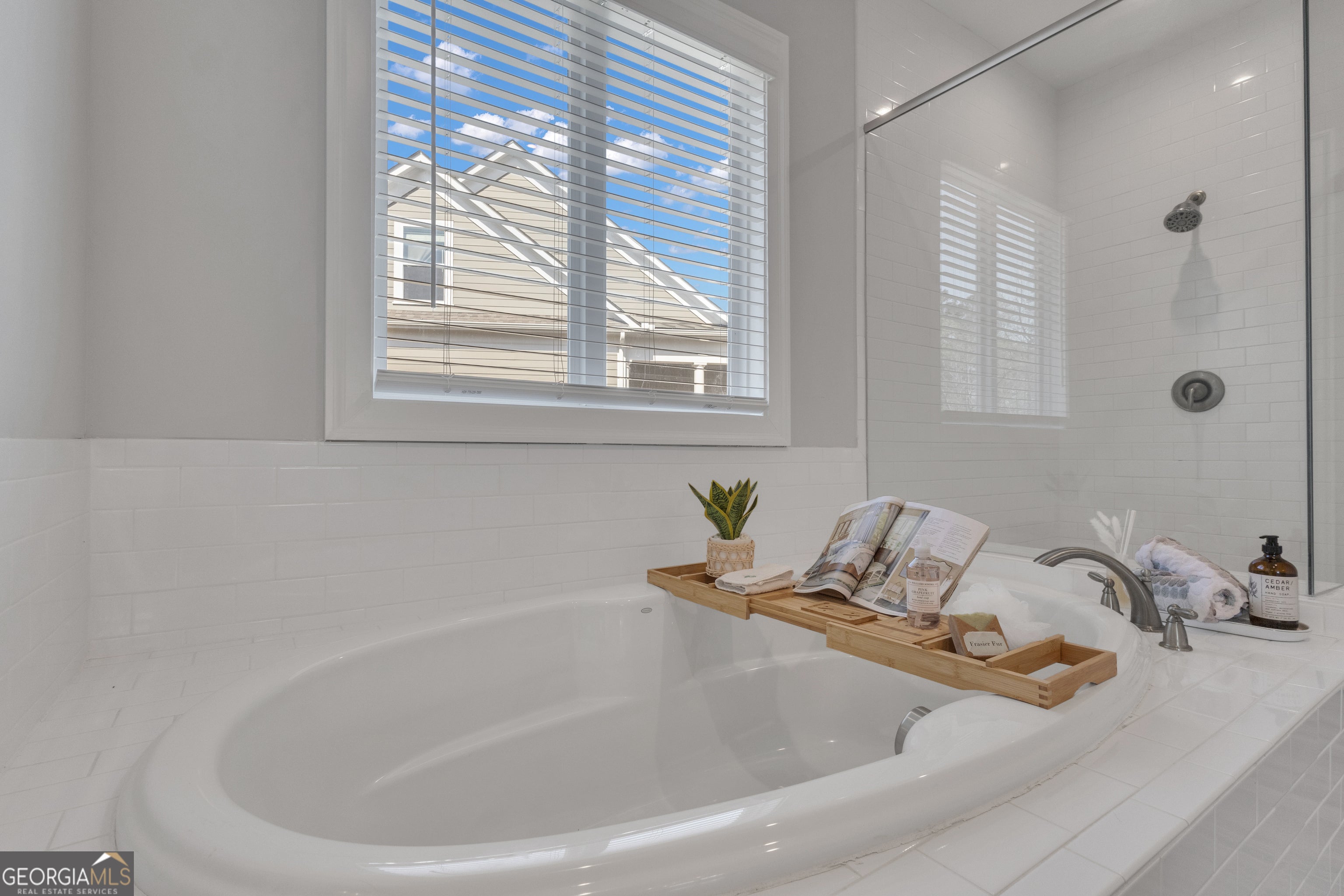 - Interior FeaturesDouble Vanity, High Ceilings, Pulldown Attic Stairs, Separate Shower, Soaking Tub, Tile Bath, Walk-In Closet(s)